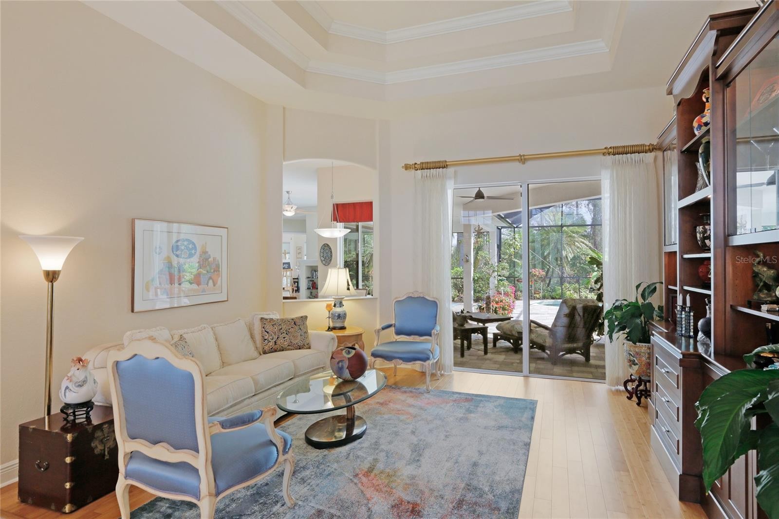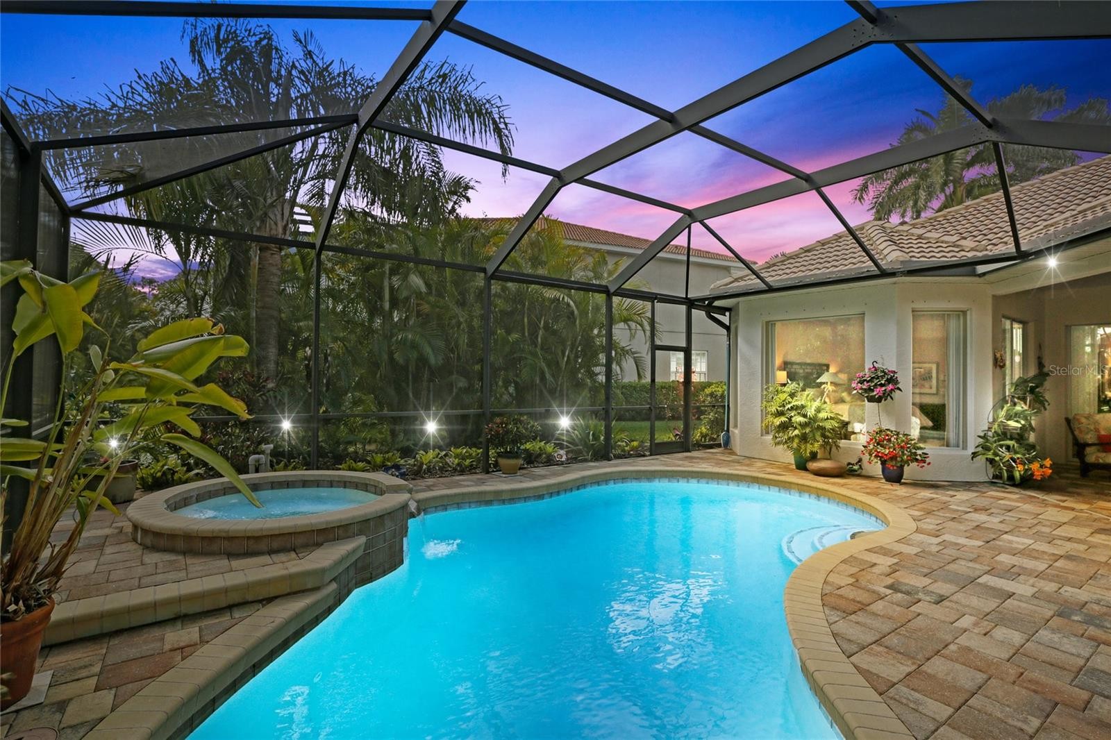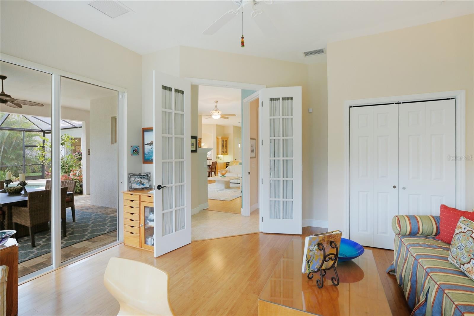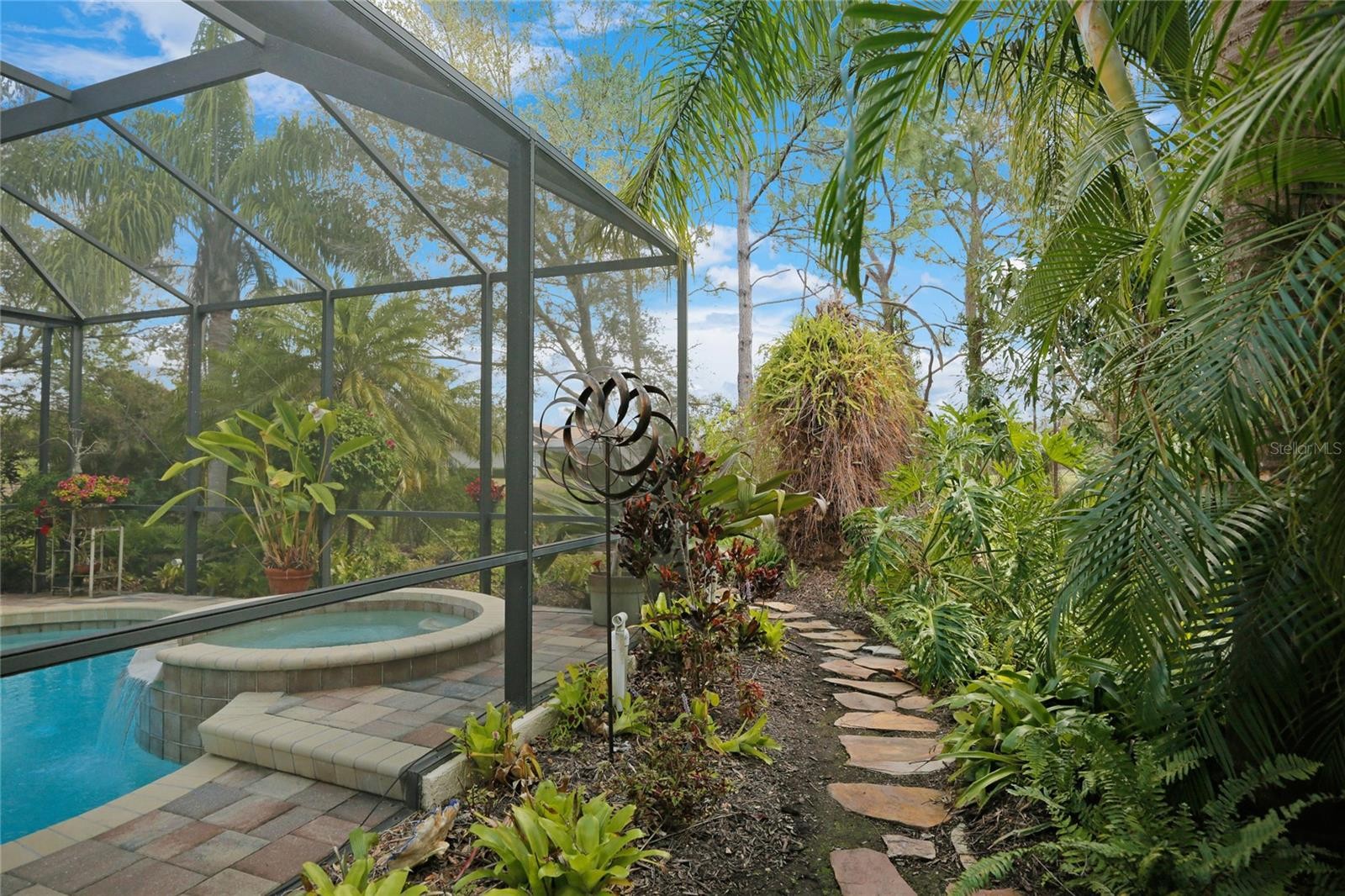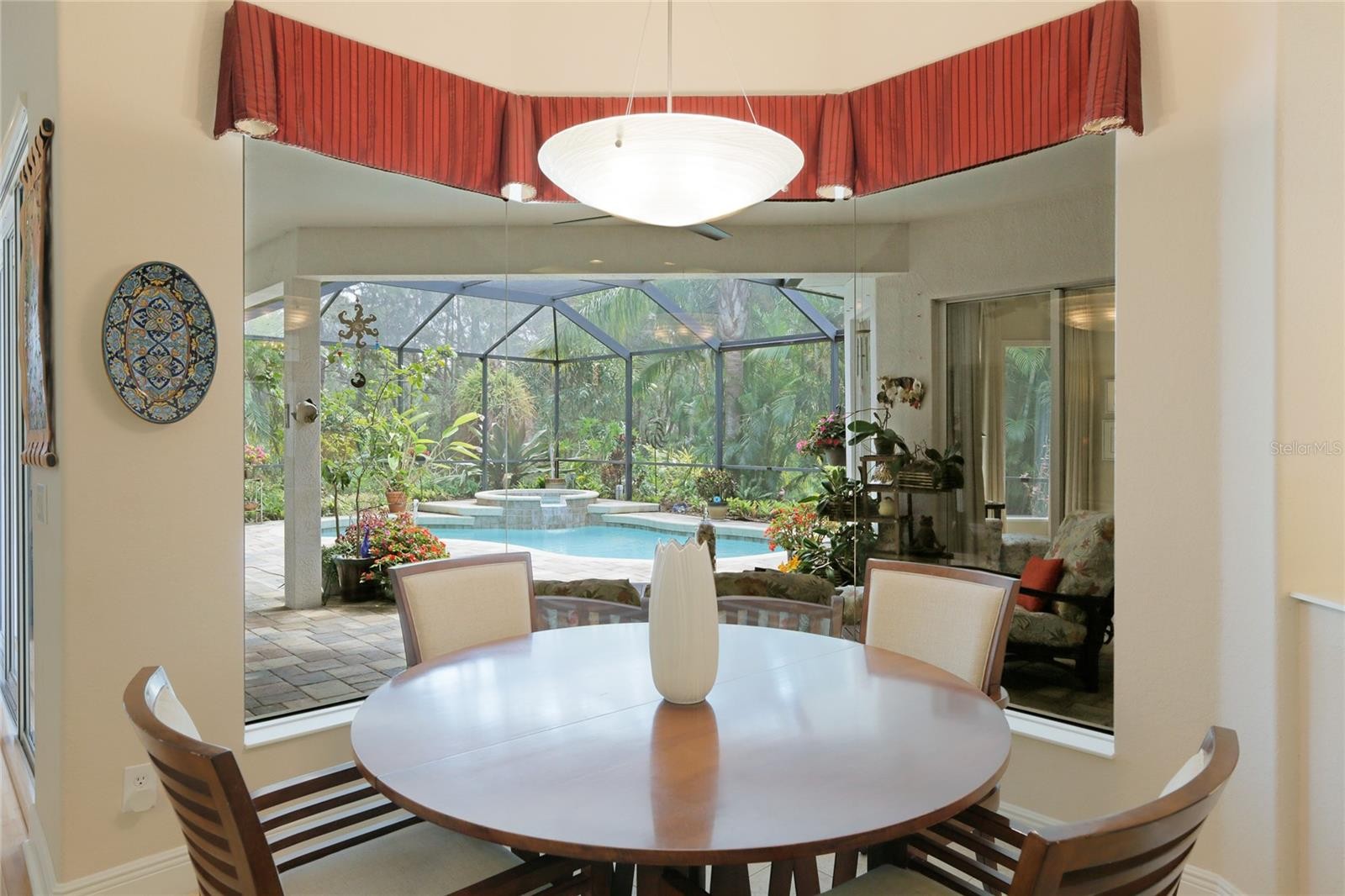 A perfectly poised, tranquil oasis right in your own backyard offers privacy and delight. This gorgeous 4 bedroom, 3 bath, plus den, 3-car garage and over 3,000 of living area is waiting for you. Meticulously cared-for, this home boasts abundant natural light with huge picture windows and 12’ high double tray ceilings. Ideal for entertaining with a beautiful dining room and formal living room that opens up to a private outdoor living retreat. You’ll fall in love with the bamboo flooring, sliders to the lanai, plantation shutters, glass Italian fixtures, custom lighting, and architectural niches throughout. This home also features a full energy-efficient solar system that’s good for the environment and cuts utility bills to a fraction of the cost. The gourmet kitchen features a breakfast nook, glass backsplash, soft-close cabinets, large quartzite island, pull-out drawers, stainless steel appliances and a gas range. The expansive kitchen opens up to the family room and dinette area with picturesque pool views through aquarium glass windows. Enjoy your private outdoor space in the screened lanai surrounded by an array of tropical plants and nature. With plenty of covered space and sun shades, you’ll love relaxing outside in your very own heated pool and spa. The spacious owner's suite features tall ceilings, huge windows, sun blocking drapery, large walk-in closets, custom closets organizers, and stunning paradise views. The en-suite offers two vanities, a makeup vanity, a soaking tub, and a spacious tiled shower. A Jack-N-Jill bath separates 2 more spacious bedrooms with with 8’ doorways and large closets. And if that’s not all, there is an additional 4th private guest suite and bathroom in the back of the home overlooking the stunning landscaping. Red Hawk Reserve is a popular gated community with Low HOA dues, located in an A+ rated school district, Located across the street from Twin Lakes Park which features tennis, pickleball, recreation courts, and minutes to beaches and all the splendor Sarasota has to offer. Experience a virtual interactive 3-D Matterport tour and video. A full pre-listing inspection has been completed on the home for your peace of mind and available upon request.