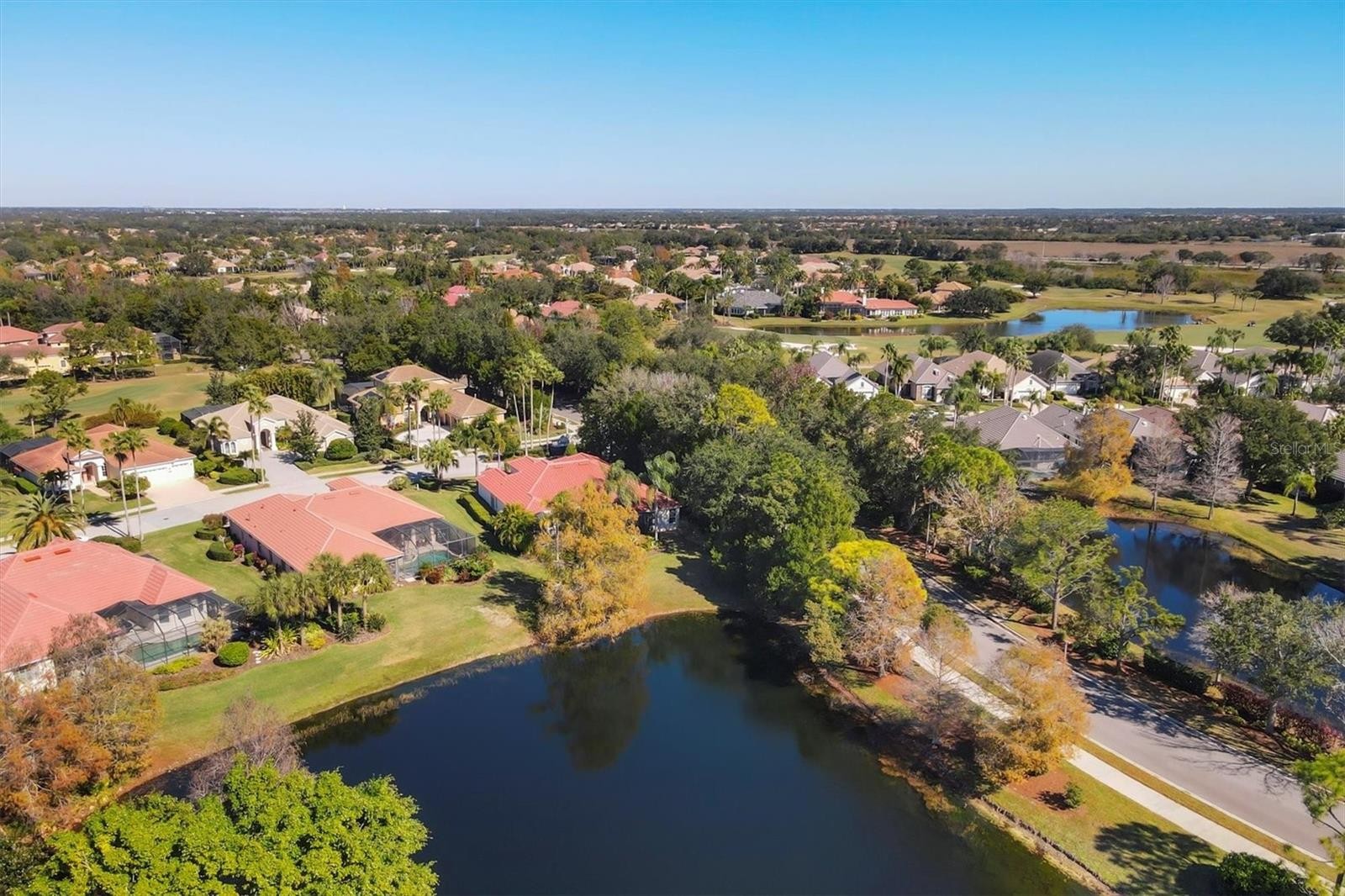 A captivating lake view with mature trees draws you in the moment you step inside this Lee Wetherington–built Paloma model, ideally positioned on 1/3 of an acre with ownership extending to the water. Featuring a new 2025 roof, pool and spa, full-house generator, 3 car garage, 11‘ ceilings, crown molding and access to Lakewood Ranch Country Club and Legacy Golf Course, this residence offers refined Florida living with timeless appeal in the gated Lakewood Ranch Country Club Community. From the moment you arrive, the home shares a rare sense of tranquility, where expansive lake views and natural surroundings become the defining focal point of daily living. The oversized homesite creates both openness and privacy, offering a setting that feels serene, established, rich in natural beauty. The interior is designed with thoughtful separation of spaces giving great privacy to the 4 bedrooms. The main salon, oriented directly to the lake, is inviting and cozy. The kitchen family room area has sliding impact glass doors opening to the pool patio space allowing a free flow of movement on those perfect Florida days. The kitchen enjoys a large island, breakfast nook, and 2 walk-in pantries! A quiet hallway behind the kitchen leads to 2 bedrooms and a full hall bath well suited for friends, children, visiting children and grandchildren. A delightful junior suite is tucked away just off the family room with access to the pool patio. The primary suite enjoys tranquil lake and patio views, generous closet space with multiple walk-in and side closets, and a sun-filled bath with dual vanities, water closet, and separate shower. Then there is the surprise of yet another room we call ‘the sanctuary’ a quiet escape when one needs to exhale! Outdoor living is designed for year-round enjoyment, with pool and spa, expansive paver patio, and 2 covered seating areas, all enclosed within a screened cage. The land extends down to the lake with extra lawn area for your enjoyment. With access to the lifestyle amenities of Lakewood Ranch Country Club and Legacy Golf Course, this residence represents an exceptional opportunity to enjoy refined, relaxed living in one of Lakewood Ranch’s most established and naturally beautiful settings. All the conveniences of everyday living, dining, shopping are close by. Lakewood Ranch also enjoys outstanding schools and athletic facilities. Greater Sarasota is also famous for its white sandy beaches and its reputation as the “Cultural Coast of Florida”.