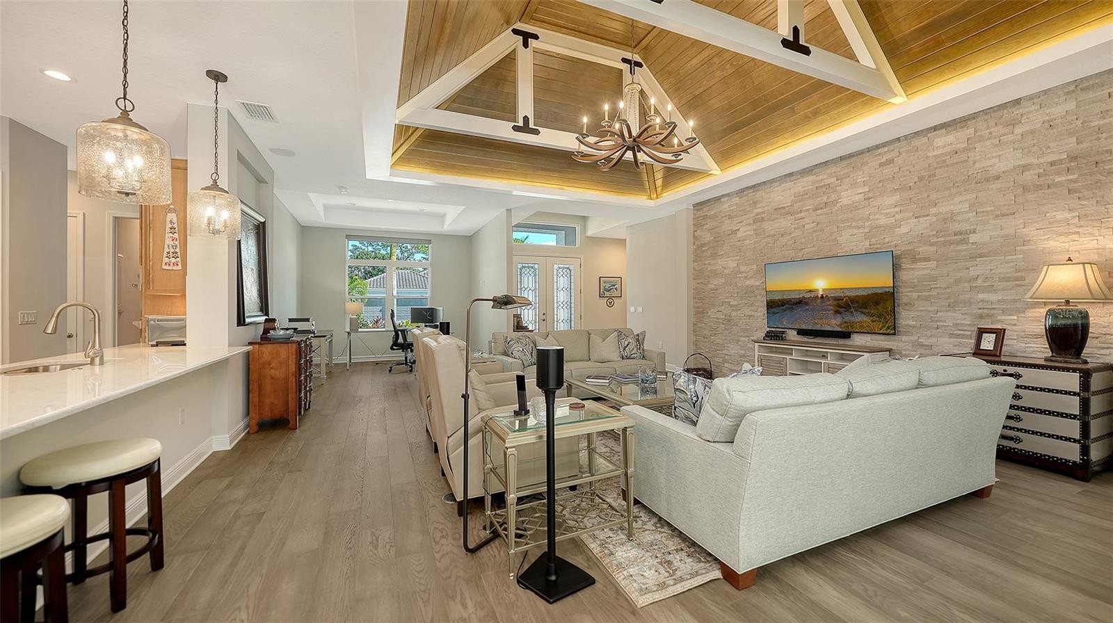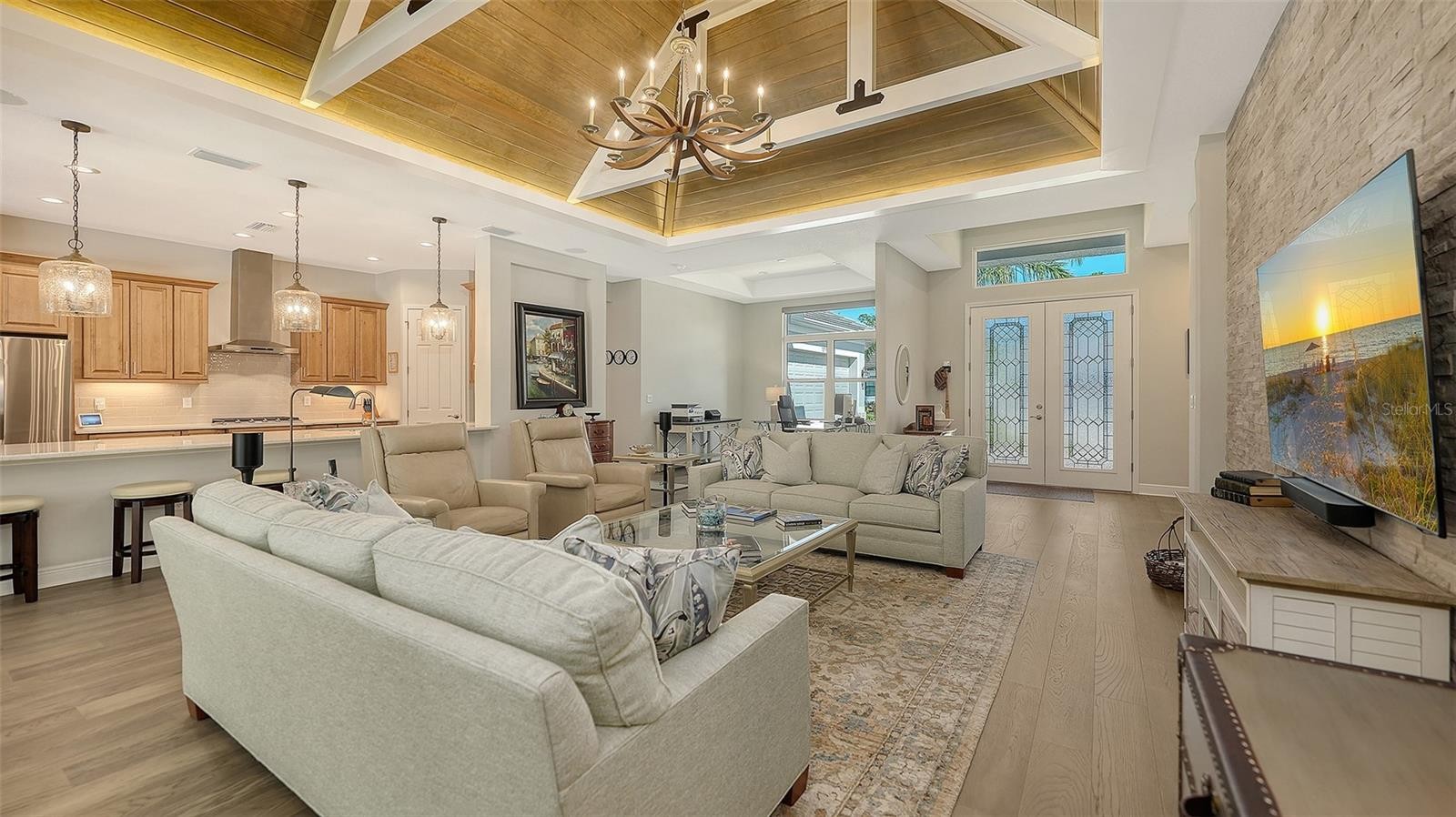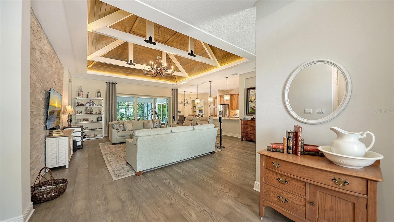 Located in the desirable Waverley neighborhood of Sarasota, this beautifully appointed Medallion Santa Maria floor plan offers the perfect blend of luxury, comfort, and functionality. This 3BR/3BA home features a screened pool with an expansive lanai enclosure overlooking a private wooded backdrop, along with a paver driveway and impressive curb appeal. Inside, the extended gourmet kitchen is designed for both everyday living and entertaining, showcasing solid wood cabinetry, a long center island, and a gas oven range fueled by a dedicated propane tank. The propane system also services the tankless water heaters, clothes dryer, fireplace, pool heater, and outdoor grill. Real wood floors run throughout the home, enhancing its warmth and timeless appeal. The spacious great room features a stunning farmhouse-style vaulted ceiling accented with tongue-and-groove planks, creating an open and airy gathering space. A separate bonus room includes a gas fireplace and wet bar, ideal for entertaining or relaxing. The primary suite offers generous proportions, an ensuite bath, and a walk-in closet with custom built-ins. Both garage bays are air-conditioned, and a whole-home generator provides added peace of mind. Conveniently located near dining, shopping, and everyday conveniences, with easy access to Siesta Key, Downtown Sarasota, and the UTC area, this home delivers exceptional Florida living in a premier Sarasota location.