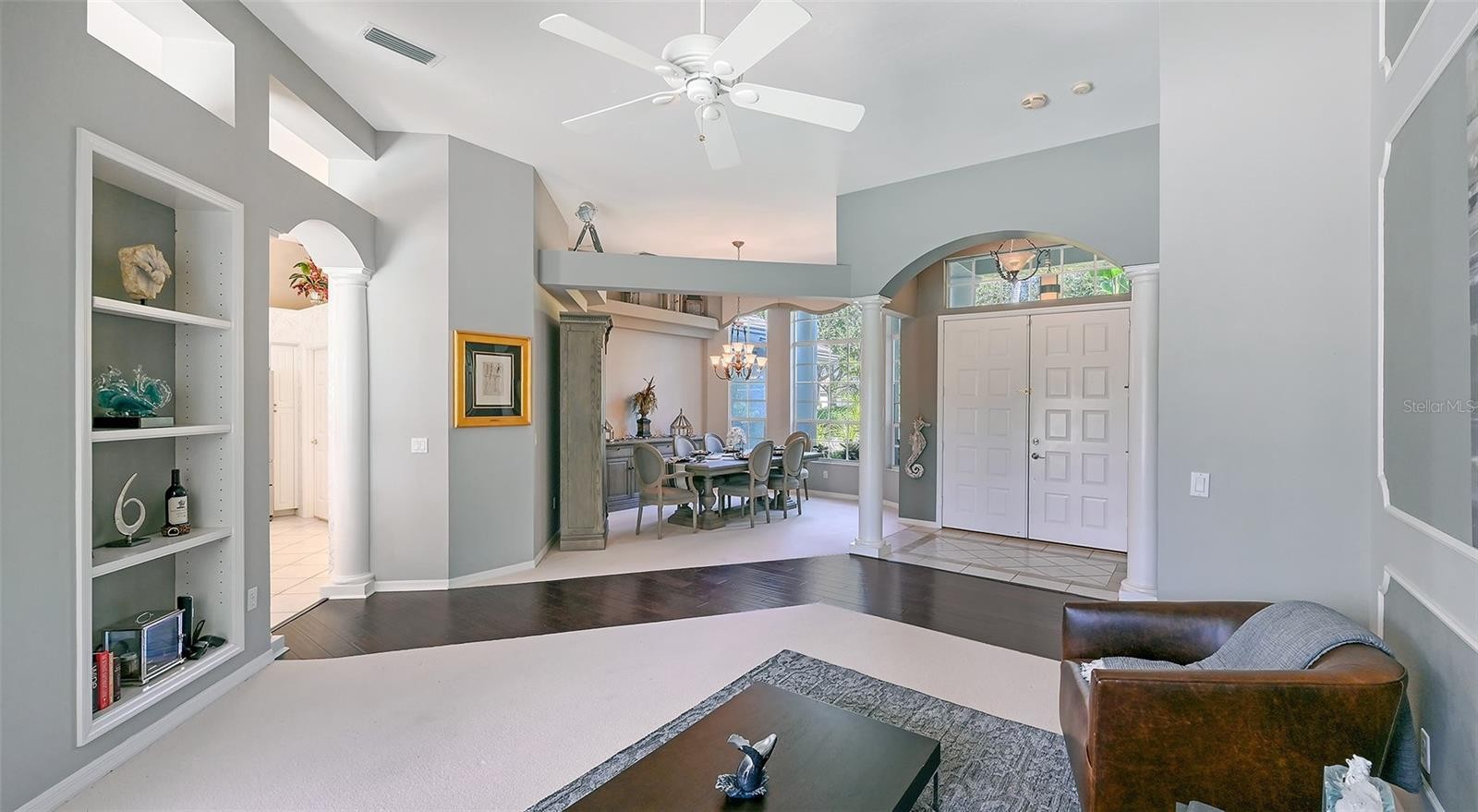 Welcome to this single-story home in the gated community of University Park Country Club, built by respected local builder Todd Johnston. This spacious residence offers 3 bedrooms, an office, and 3 full bathrooms, thoughtfully designed for comfort and easy everyday living. Upon entering by the pavered driveway/walkway with tropical landscaping, you'll be greeted by soaring high ceilings. The well-thought-out split plan ensures privacy, with 2 guest bedrooms, 2 guest bathrooms and an office with built-ins thoughtfully situated on one side, while the spacious primary suite occupies the opposite wing. The primary suite is a true retreat, featuring new carpet, a generous walk-in closet, and a cozy bright sitting area. Enjoy direct access to the lanai through your private door and indulge in the ensuite bathroom complete with a soaking jetted tub, walk-in shower, dual vanity, and a convenient seated makeup area. The heart of this home is its large kitchen, designed with functionality in mind. It opens seamlessly to a welcoming breakfast nook and a spacious family room, creating an ideal space for gatherings and everyday living. A large walk-in pantry with a desk provides additional convenience and storage. The home's living areas are enhanced by an aquarium window that offers picturesque views and allows natural light to flood the space. Two large sliders lead out to the pavered lanai, where you’ll find a heated pool and outdoor kitchen, perfect for relaxation and outdoor entertainment. Additional features and upgrades include a NEW ROOF in 2021, NEW HVAC in 2022, a climate-controlled wine storage closet in the office and a full wall of built-in storage cabinets in the garage. University Park Country Club is consistently ranked one of the top courses in Florida featuring 27 holes of championship golf; tennis and pickleball; fitness center, croquet – as well as an array of social and group activities. Just a 15-minute drive outside this peaceful enclave is downtown Sarasota, with shopping, arts & theatres, museums, dining and entertainment, top-ranked healthcare, beaches and SRQ International Airport. Two miles east of UPCC is the convenience of I-75, University Town Center with 300 nationally known and homegrown shops, restaurants, fitness studios, services and attractions and the Nate Benderson Park, home of world-class rowing events. Enjoy the club amenities with the required minimum of a Social membership at UPCC, which is owned by the residents through a Recreation District.