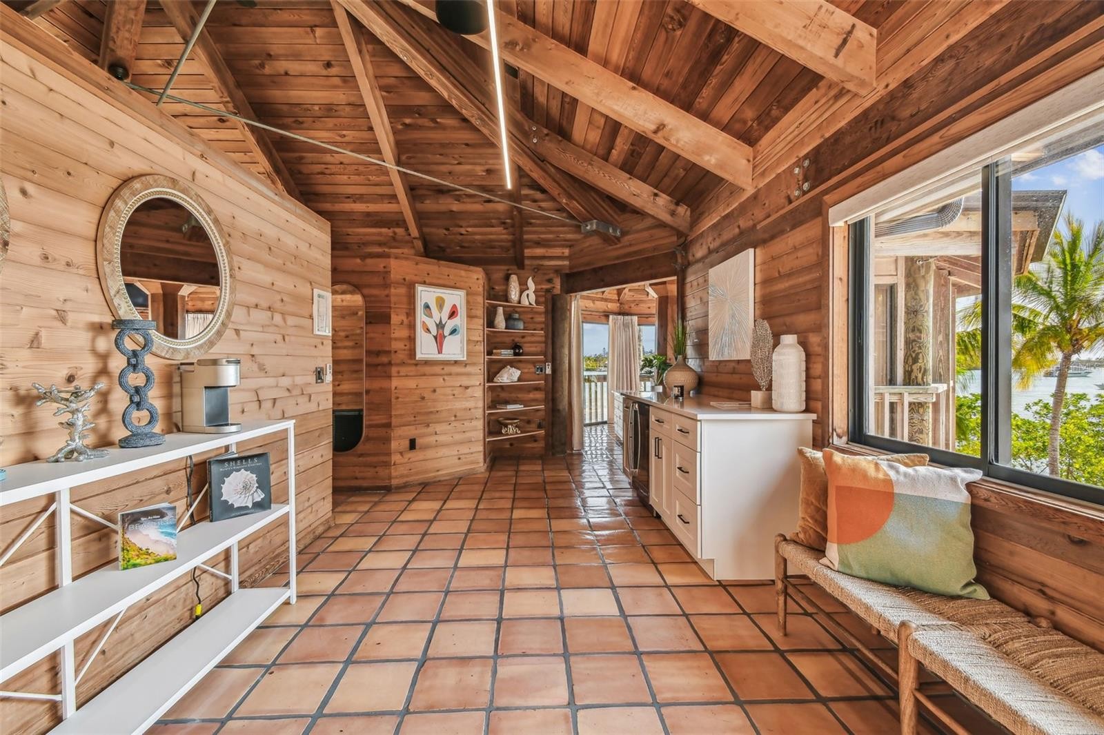 A rare offering on Florida’s coveted west coast, this private island sanctuary feels worlds away yet remains moments from the region’s most beloved coastal destinations. Set on the exclusive 38-acre island of Jewfish Key (accessible only by boat), this remarkable 1.35-acre estate commands its own secluded shoreline and uninterrupted views of crystal clear waters. Inspired by Polynesian architecture and designed to dissolve the boundaries between indoors and out, this estate home unfolds through airy pavilions connected by elevated walkways. Towering palms and lush tropical landscaping envelop the home, while its 18-foot elevation ensures both peace of mind and panoramic, horizon-level vistas. Inside, the freshly reimagined kitchen serves as the gathering heart of the home, with sleek quartz countertops, modern cabinetry, and a spacious oversized island that effortlessly bridges culinary function and relaxed entertaining. Expansive sliding glass doors draw natural light into the living space and frame sweeping views of the sandbar and bay, perfect for sunset watching. The main residence includes four bedrooms and four-and-a-half baths, plus a separate guest suite offering an additional bedroom, kitchen, and full bath, ideal for hosting with comfort and privacy. The primary suite is where the pace of the island truly settles in. Wake up to wide-open bay views, linger with coffee in the sitting area, or enjoy a glass of wine as the sun sinks toward the horizon. The ensuite feels fresh and spa-like, with a soaking tub, walk-in shower, and water views. A series of screened porches and wraparound decks encourage slow living, morning yoga on the deck, afternoon reading in the shade, sunset grilling and cocktails overlooking the Gulf. Outdoors, a newly installed pool and spa with a sun shelf and expansive sundeck overlook the storied Jewfish Key Sandbar. A private dock with jet ski lift offers instant access to calm waters perfect for fishing, snorkeling, paddle boarding, or exploring neighboring Longboat Key and Anna Maria Island, both just minutes away by boat and beloved for dining, boutique shopping, and laid-back coastal culture. Equal parts island hideaway and refined coastal home, this one-of-a-kind property offers the rare combination of true privacy, effortless access, and natural beauty, set against a backdrop of turquoise water, powder soft sand, and endless sky. Here, relaxation, adventure, and natural beauty converge in a setting that feels almost like an escape, yet unmistakably home.