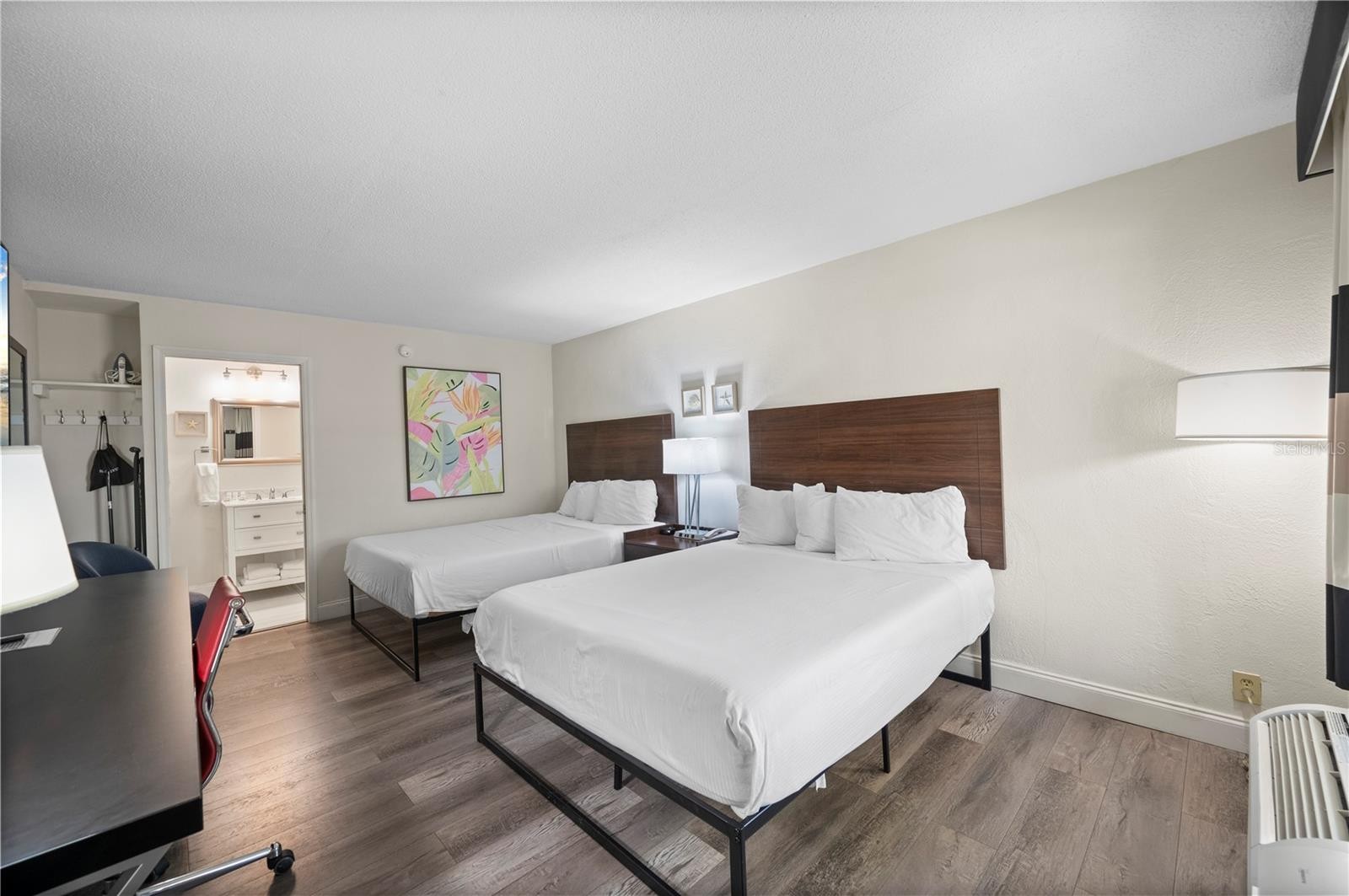 Turnkey investment opportunity or personal vacation getaway—this fully furnished, renovated 1-bedroom, 1-bath hotel-condo is located in the popular Sarasota Cay Club within the Ramada by Wyndham Sarasota Waterfront Resort. Perfect for short-term or long-term rentals, this unit has no minimum rental restrictions and comes with all utilities included in the HOA fee—electric, cable, internet, water, sewer, phone, pest control, and exterior maintenance. Situated on the second floor, the unit features 2 queen beds, a 70" TV, desk, microwave, coffee maker, and a beautifully updated bathroom with a walk-in shower and stone-topped vanity. Stylish flooring and fresh finishes throughout offer a clean, contemporary feel guests will love. The resort offers a full range of amenities including a waterfront heated pool, on-site Tarpon Bay Grill & Tiki Bar, breakfast café, boat and kayak rentals, fitness center, game room, business lounge, corn hole, and walking paths along the bay. Additional conveniences include optional housekeeping, laundry, and EV charging stations. Ideally located just minutes from Sarasota-Bradenton International Airport, downtown Sarasota, and world-famous beaches including Lido Key, Siesta Key, and Longboat Key. Also nearby are top attractions like the Ringling Museum, Van Wezel Performing Arts Hall, St. Armands Circle, and IMG Academy. With strong rental demand, flexible use options, and minimal overhead, this unit is a rare chance to own in one of Florida’s most desirable coastal destinations. Whether you’re a seasoned investor or looking for a second home that pays for itself, this is an exceptional value in Sarasota’s growing short-term rental market. No rental restrictions. Resort amenities. Fully furnished. All utilities included. Prime waterfront location. Schedule your showing today!