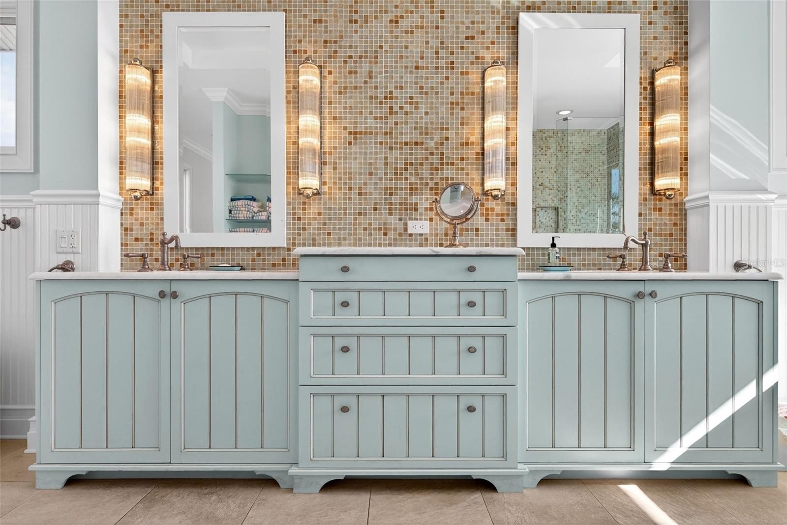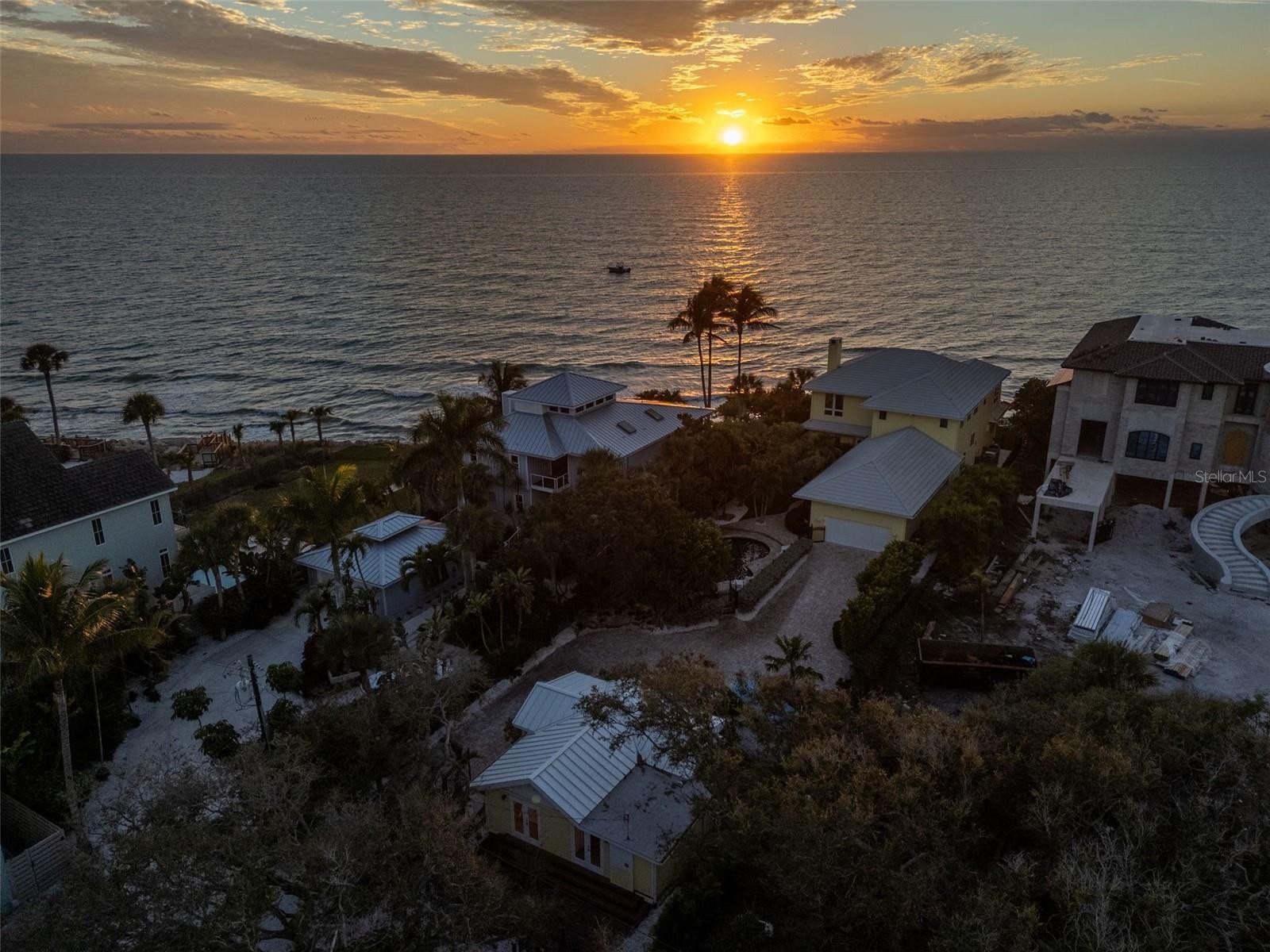 Commanding a dramatic Gulf-front position atop Point of Rocks, this extraordinary coastal compound offers a front-row seat to sweeping 180° panoramic views and unforgettable sunsets over the Gulf of Mexico. Built to the highest Florida Green Building Coalition standards, this home is majestically poised 14.2' above sea level to appreciate rolling waves gently lapping against the rocks and sandy shoreline below. Quintessential Old Florida charm defines this rare offering, featuring a 4-bedroom main residence and a separate 2-bedroom guest cottage, all set on beautifully landscaped, gated grounds. The main home showcases wall-to-wall, floor-to-ceiling windows and sliders overlooking the Gulf, filling the interiors with natural light. The living room features a striking tiered ceiling, recessed lighting, a new wood-burning fireplace with a shiplap accent wall, custom built-in bookcases, and electronic shades. Hardwood floors run throughout. The light-filled kitchen offers stunning Gulf views and features a large custom-built island with breakfast bar and second sink, quartz countertops, artistic tile backsplash, pendant lighting, a 5-burner induction cooktop, KitchenAid dishwasher, and built-in stacked microwave and convection oven with warming drawers. The dining area boasts extraordinary Gulf views. Two ensuite guest bedrooms, a powder bath with wood-paneled wainscoting, and a laundry room with built-in cabinetry and utility sink conveniently located off the kitchen completes the first level. The primary suite on the second level is a true retreat with breathtaking Gulf views, a tiered ceiling with fans, a sitting area, and access to a screened terrace. The spa-like bath features dual walk-in closets, freestanding tub with Gulf views, dual vanities, walk-in shower, and tile floors. The additional second-floor bedroom boasts wood floors, built-in bookcases, a deck, and full bath, making it an ideal office space or hobby room as well. Outdoor amenities include a heated saltwater pool with swim-up seating and custom waterfall feature, mature tropical landscaping, hurricane-rated windows and doors, a 2-car garage with storage, and gated entry. A beautiful promenade overlooking the gulf includes a deck, lush care-free turf, and stairs to the shimmering waters and tide pools unique to this area of Sarasota beachfront. The charming guest cottage offers a living room, full kitchen with bar seating, small dining area, laundry, two bedrooms, and one full bath—ideal for hosting guests or extended family. Recent improvements include full interior and exterior repainting of both the main house and cottage, new en-suite bath added to a first-level guest bedroom, custom floor-to-ceiling bookcases in the living room and upstairs Gulf-side guest suite, two new AC systems, motorized screens on the upper terrace, a new outdoor deck with filled walk-over beach stairs, and a metal roof installed on the cottage in 2021. A rare Gulf-front opportunity combining privacy, character, and panoramic coastal beauty all within minutes of dining, shops, and the mainland. The shelling and wade fishing right outside your door is the icing on the cake!