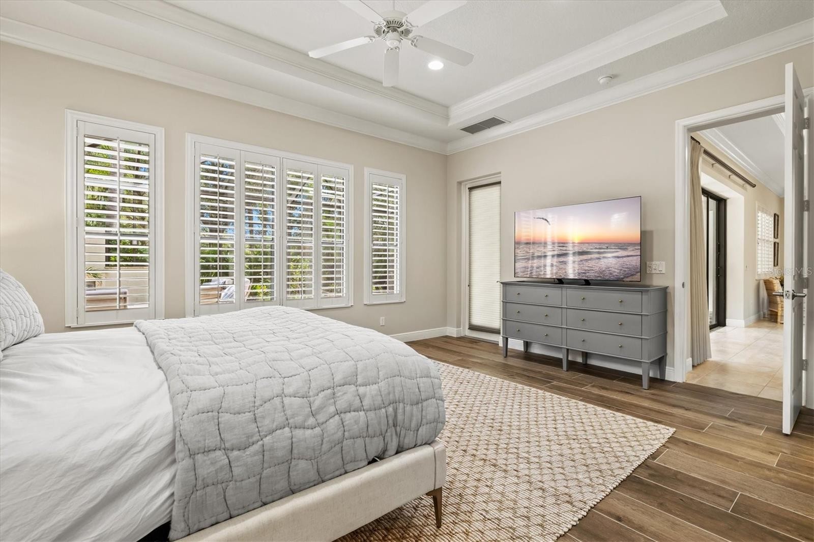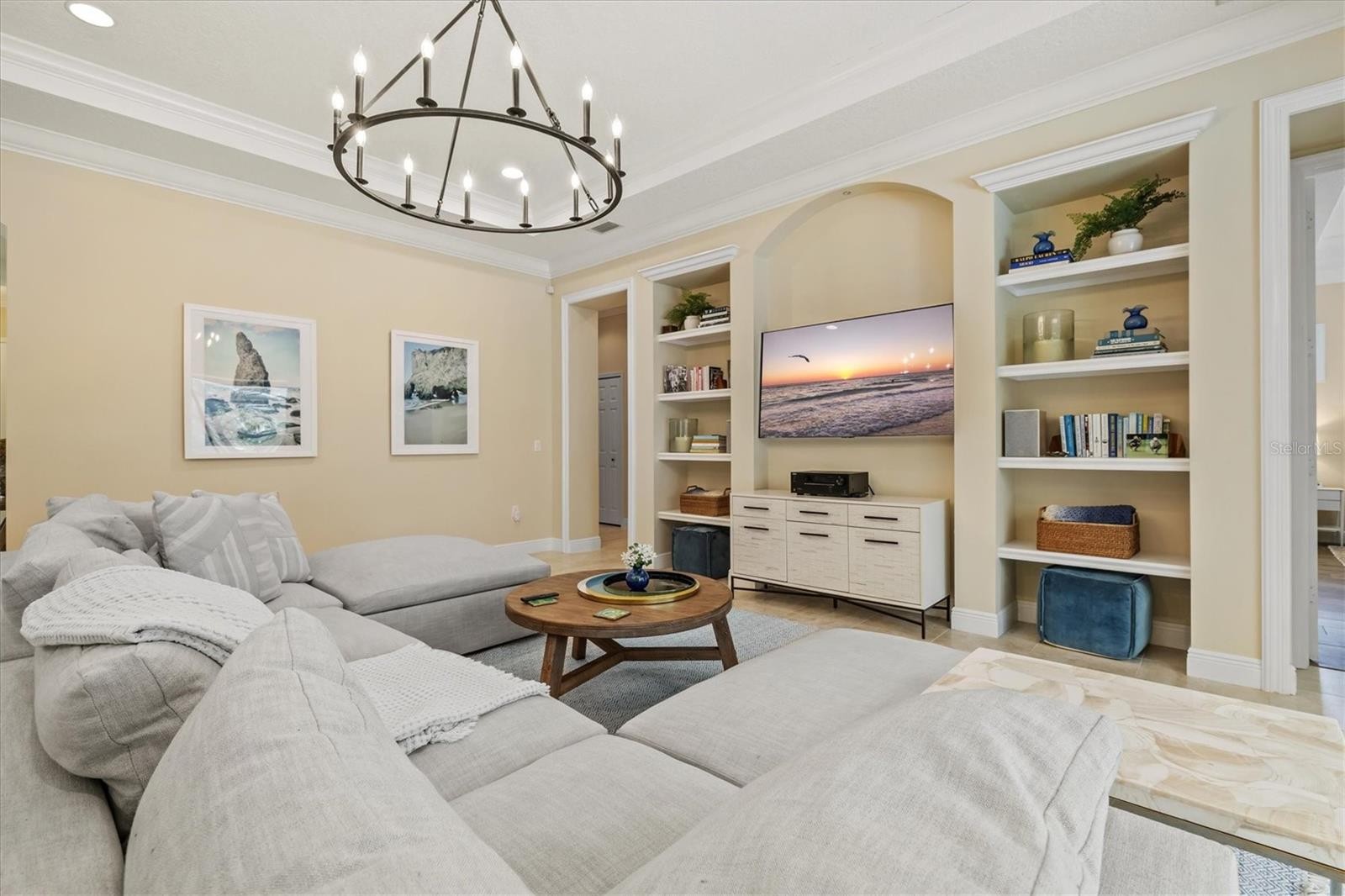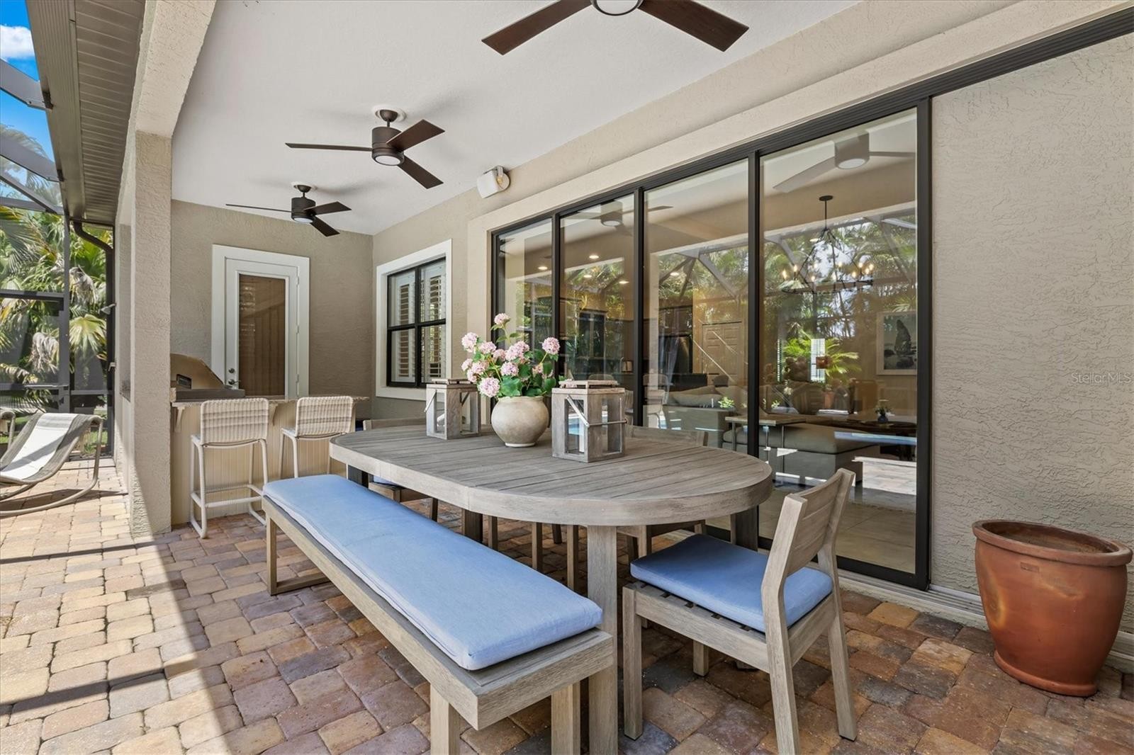 Immaculate Maintenance-Free Home in Stone Ridge at Lakewood Ranch Country Club. Located within the gates of Lakewood Ranch Country Club, this meticulously maintained Savona model by Neal Communities sits on a private oversized cul-de-sac lot. Offering nearly 2,500 sq. ft. of living space, the home features 3 bedrooms, a den, and a 3-car garage. Step inside to soaring 10-foot ceilings with coffered details, crown molding in every room, plantation shutters, and custom window treatments. Tile floors flow throughout, with wood-look plank tile in the owner’s suite, den, and bedrooms. All lighting and ceiling fans have been thoughtfully updated. The den, accented with glass-pane French doors, provides the perfect home office or quiet retreat. The formal living and dining areas set the tone, while the open-concept family room with custom built-ins and disappearing sliders expands seamlessly to the lanai. The adjoining kitchen showcases upgraded cabinetry with glass-front uppers, granite countertops, stainless-steel appliances, a built-in desk, breakfast bar, and casual dining nook. The spacious owner’s suite offers lanai access, a sitting area, and an en suite bath with soaking tub, dual vanities, walk-in shower, private water closet, and a custom-fitted walk-in closet. Outdoor living is unmatched here. This home boasts the largest lanai in the neighborhood, highlighted by a sparkling pool and spa, custom gas fireplace, lush landscaping, and complete privacy. The outdoor kitchen features granite counters, a gas grill, side burner, refrigerator, and sink. A covered dining space, cabana bath, and outdoor shower make this a true retreat for relaxing or entertaining. Membership at Lakewood Ranch Country Club is optional, but available, with access to golf, tennis, fitness, dining, and resort-style pools. All this, just minutes from award-winning beaches, fine dining, and world-class shopping.