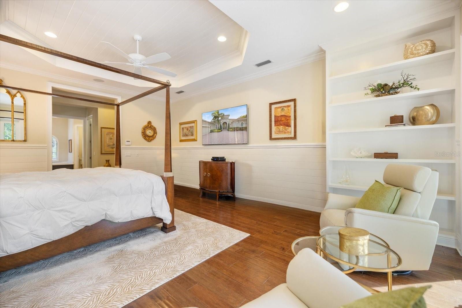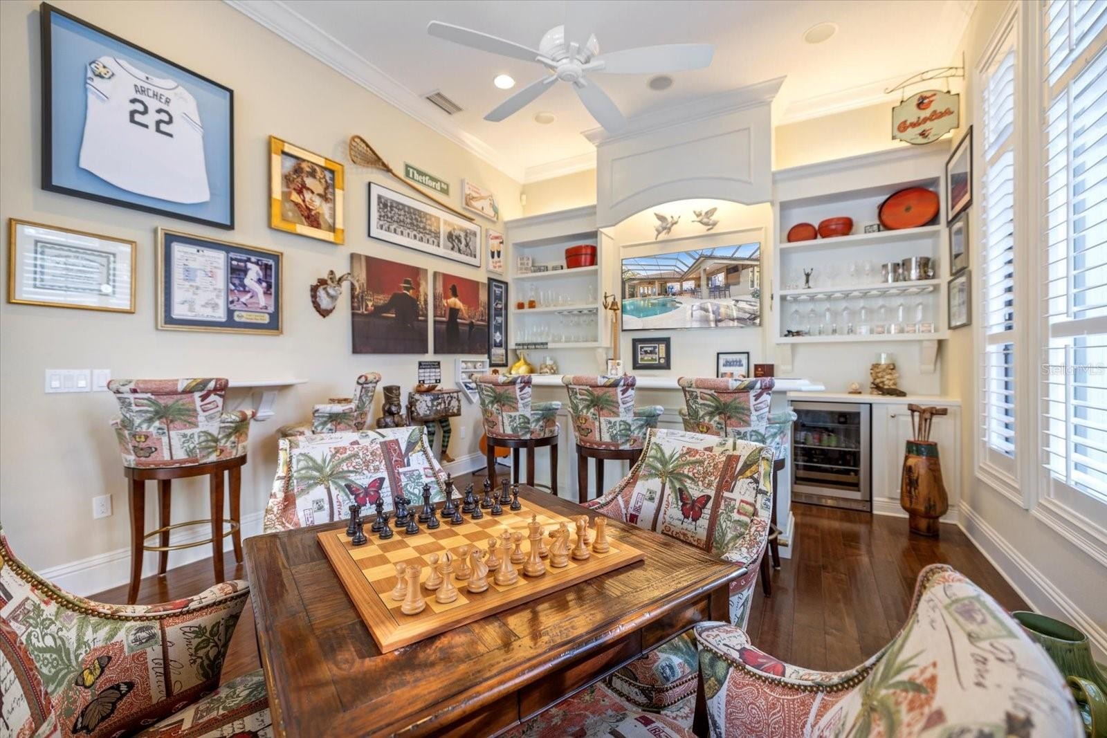 This stunning residence, located in Lakewood Ranch Country Club, perfectly blends luxury, comfort, and functionality. This meticulously designed home offers 3,698 square feet of living space under air, featuring 3 bedrooms, 3 baths, an office, and a bonus room. With an additional 690 square feet of covered lanai and nearly 3,000 square feet of screened-in outdoor living space, this home is ideal for entertaining and enjoying Florida’s beautiful weather. Imagine relaxing on the lanai, watching breathtaking sunsets over the golf course, or hosting unforgettable gatherings in this thoughtfully designed space. From the moment you arrive, the home’s grand entry makes a statement with oversized double iron doors featuring impact glass and a transom above, complemented by decorative tile flooring. Inside, the attention to detail is evident with crown molding, plantation shutters, and decorative wall and ceiling treatments throughout. Engineered hardwood and tile flooring flow seamlessly through the home, while custom built-in closets and cabinetry provide both style and functionality. The heart of the home is the chef’s kitchen, which boasts an oversized island with quartz countertops, GE Monogram appliances, including a six-burner gas stove, microwave, oven, refrigerator, and dishwasher with cabinet panels. A custom wooden hood, glass cabinets, marble backsplash, and an aquarium glass window in the eat-in kitchen add to the elegance. Pendant lighting creates a warm and inviting ambiance, making this space perfect for both cooking and gathering. The living room is equally impressive, featuring tongue-and-groove wall treatments, coffered ceilings, recessed lighting, and pocket sliding glass doors that open to the expansive lanai. The dining room is a refined space with a decorative mirror wall, tray ceiling, chandelier, and a dry bar complete with a wine fridge and glass doors. The primary suite is a private retreat with a vestibule entry, dual walk-in closets with custom built-ins, a coffered ceiling with tongue-and-groove detailing, and French doors with clear impact glass that lead to the lanai. The spa-like primary bath offers dual split vanities with quartz countertops, a tub with wood surround, a walk-in shower with tile to the ceiling, and ample storage with a linen closet and water closet. Step outside to your private oasis, where the saltwater pool with a fountain and spa is perfectly situated to take in the serene golf course views. The oversized covered lanai, complete with ceiling fans, provides a comfortable space to relax or entertain, while the outdoor kitchen, featuring a grill, sink, beverage fridge, and bar, makes hosting a breeze. Whether you’re enjoying a quiet evening watching the sunset or entertaining friends and family, this outdoor space is truly exceptional. The oversized 3-car garage is a standout feature, offering high ceilings, custom cabinets, a mini-split system for climate control, and speckled epoxy flooring. Additional highlights of the home include landscape lighting, stem wall construction, and decorative molding throughout. Every detail of this home has been carefully considered to provide a luxurious and welcoming living experience.
