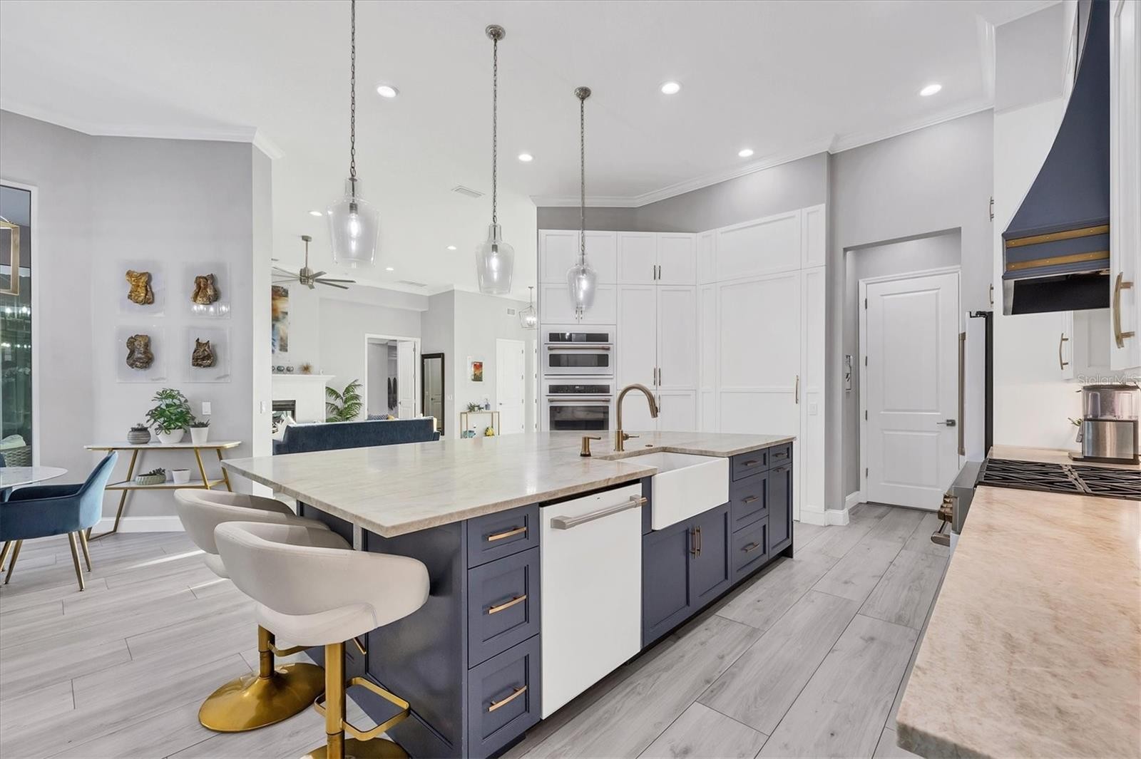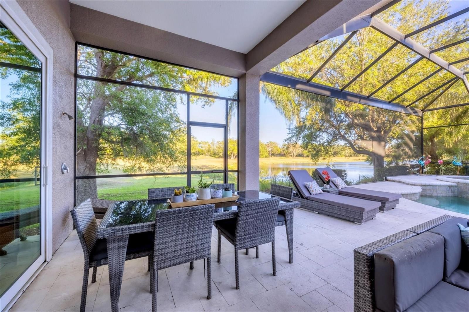 In sought-after Greystone enclave of Lakewood Ranch Country Club, this exceptional four-bedroom, four-bath plus den and bonus, which could serve as a fifth bedroom residence surpasses the finest new construction offerings, including impact windows and doors. Just a half mile from Lakewood Ranch Main Street, the home is enveloped by mature, lush foliage with a beautiful view of the golf course. Impeccably renovated in 2020, this residence redefines the standard of luxury living. Upon entering through grand glass double doors, you are greeted by an open-concept design, showcasing a cool, neutral color palette that exudes timeless sophistication. Soaring ceilings with exquisite detailing set the stage for an elegant living experience, while a stunning marble chevron-tiled fireplace creates a warm ambiance. Accordion-style impact sliders seamlessly connect the main living spaces to the outdoors, inviting alfresco enjoyment. The heart of the home is the gourmet kitchen, thoughtfully curated with new GE Café Series Matte White appliances, a generous counter-height island with ample storage, Taj Mahal Matte Leathered quartzite countertops and custom two-tone cabinetry with a range hood to match the island. A marble chevron tile backsplash, LED under-cabinet lighting, a spacious walk-in pantry with custom wood shelving and 15-inch upper cabinets with glass fronts for your cherished collectibles complete this culinary masterpiece. Go outside to a panoramic screen-enclosed lanai, offering breathtaking views of the lake and golf course, framed by tropical landscaping and mature trees. The heated saltwater pool, with its spa and serene water fountain, ensures year-round relaxation, while the newly appointed outdoor kitchen, featuring a KitchenAid grill, sink, refrigerator and quartz countertops, invites unforgettable dining under the stars. Shellstone pavers and new pool coping add to the outdoor oasis refined charm. The first-floor guest bedrooms are havens of comfort, each with new carpeting and fans, while the primary suite is a luxurious retreat, boasting hardwood floors, a tray ceiling, custom walk-in closets and a spa-like en-suite bath with a freestanding tub, dual sinks with quartz counters, a custom-designed walk-in shower with dual heads and elegant wood cabinetry with a glass display tower. The second-level suite is a sanctuary for extended family or guests, complete with a bedroom and spacious den that could easily serve as a fifth bedroom, a large walk-in closet, a spa-inspired bath with barn-style shower doors and a stylish morning kitchen, all with a private balcony offering an elevated retreat. Further enhancing this exquisite home are additional features, including newly painted interiors, crown molding throughout, all-new LED recessed lighting, newly refreshed landscaping and outdoor lighting, electric shades, new decorative fixtures, two 2020 air conditioner units, impact windows and doors, and an oversized three-car garage with golf cart storage. Lakewood Ranch Country Club offers world-class amenities, including a state-of-the-art fitness center, a clubhouse, a Junior Olympic-sized pool and access to three 18-hole championship golf courses. Ranked as one of the nation’s top-selling planned communities, Lakewood Ranch provides a lifestyle of unparalleled luxury with top-tier shopping, dining, schools and nearby pristine beaches.