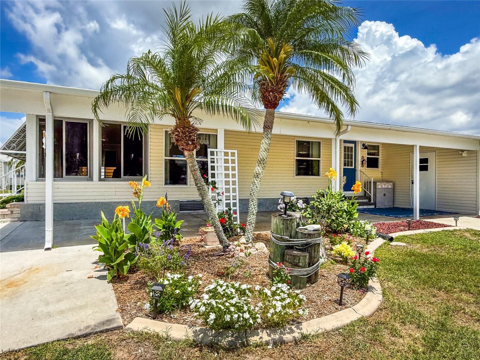 Beautifully updated 2bd/2ba home situated on a premier corner lot in the 55+ community of Ridgewood Oaks. Fully landscaped with tropical flowers and hedge that are enclosed by decorative concrete edging all around the home. Huge 42’ x 12 covered carport with room for many cars or could be enclosed to create a garage. Extra side concrete drive for a golf cart. There is a large workshop that also holds the home’s water heater. The lanai is 28’ by 10’ with newer windows and features sliding glass doors into the living room and the kitchen areas. Inside the home, there is new laminate flooring throughout all rooms and the extra wide (5’) hallway that goes from the living area to the double French doors of the primary bedroom. All windows have been replaced with easy to clean double hung windows. A remodeled kitchen with newer stainless appliances, custom cabinets and a dining nook area. Both bathrooms have been remodeled and updated. The primary bedroom is very large with plenty of room for oversized dressers and a king bed. This is a very rare floorplan and has too many features to list. The Oaks community includes Spectrum internet and cable in its fees along with weekly lawn maintenance. A beautiful clubhouse, pool, spa, tennis courts, Pickle ball courts, shuffle board and a fun outdoor fitness area. Golf cart and small pet friendly. Ridgewood has close access to I-75, many restaurants, the Ellenton Outlet Mall, Manatee County Library and provides 24-hour gated security. The Oaks, a Ridgewood 55+ community offers many activities and social events to enjoy. All room sizes are approximate. All information is deemed reliable but should be verified by buyers and/or buyer's agent.
