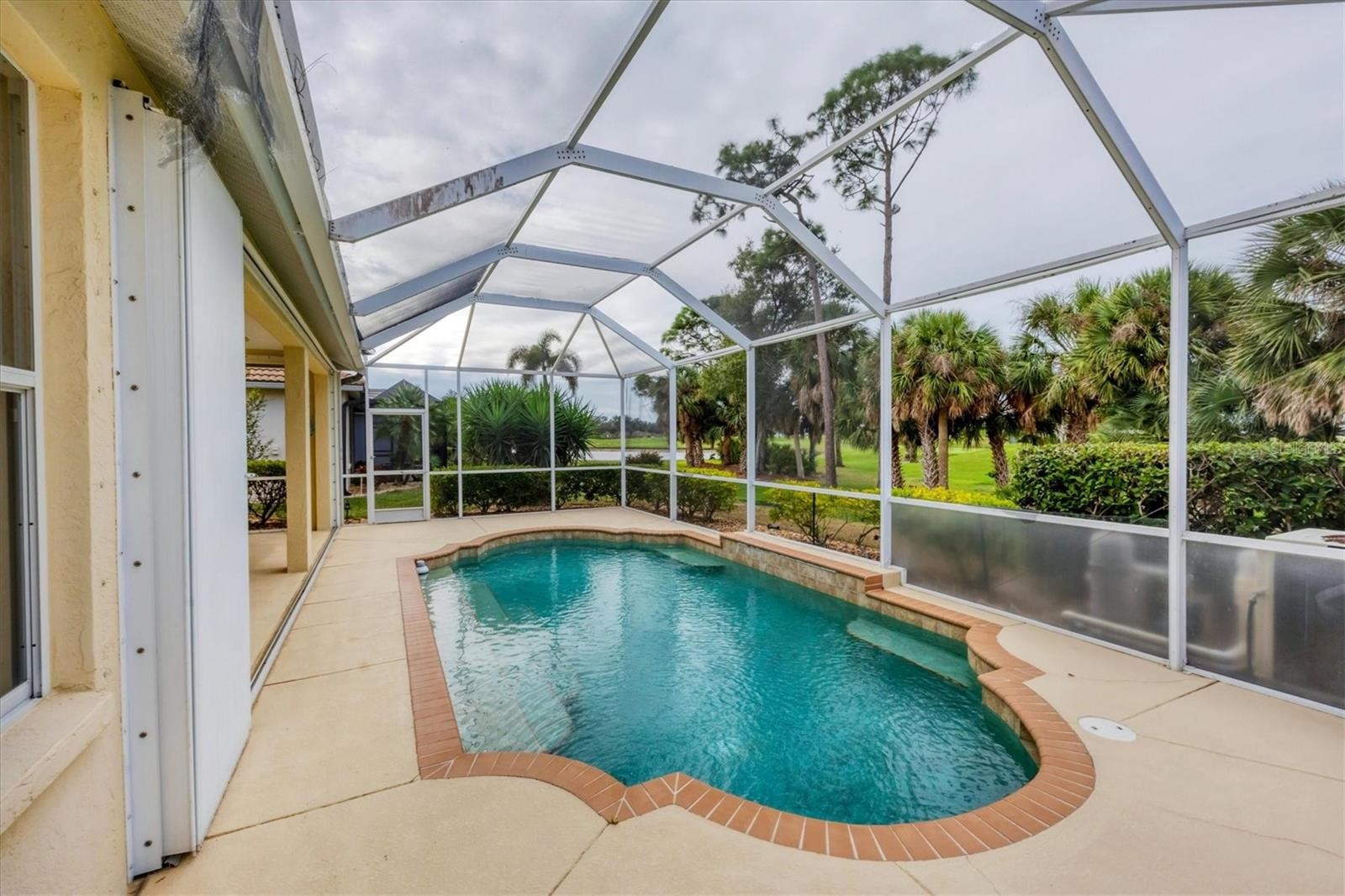 DO NOT WAIT!! PRICED TO SELL!! Popular Palmetto floor plan offering 2BD/2BA/Den. LOOKING FOR NEW OWNER!! Tons of updates inside but I NEED A NEW ROOF!! FABULOUS VIEW OF GOLF COURSE AND LAKE with trees in between to buffer for privacy. Swim in your own private pool with Western Exposure. Your sure to catch some SPECTACULAR SUNSETS. Open floor plan. Lots of space and high ceilings accented by crown molding. Updated tile flooring throughout the home, no carpet. Main areas have Ceramic tile with tile accents, bedrooms have plank wood look tile. Gourmet kitchen with granite counters, stainless steel appliances, range with hood, glass tile back splash, 48 inch raised panel cabinets, and pendant lights over bar top. Separate office/den space with french doors to close off the mess, or shove extra guests in on the pull out sofa, or add a Murphy bed. Endless options. Spacious Master bedroom with tray ceiling, crown molding. En suite master bath updated with granite counters, new bowl sinks, updated walk in shower, and soaker tub. Guest bed and bath at opposite end of home for privacy. Guest bath updated with white subway tile, listello, and pedestal sink. Laundry room with wash sink. Plantation shutters on side and front windows. HURRICANE SHUTTERS. SOLAR PANELS. Looking for my new owner. COME AND SEE THIS WONDERFUL OPTION TODAY!! Pelican Pointe is Venice's premier community with resort style amenities- Clubhouse with restaurant/bar/grill, heated pool, fitness center, tennis courts, pickle ball, tons of social activities, social room/library, 27 holes of golf and pro shop. Huge and very active Women’s Association with tons of activities to choose from. Golf membership is NOT mandatory. LOW HOA fees. All centrally located minutes to Venice Beach, Venice Downtown, shopping, theatres, restaurants, highways, airports, and so much more. Come find your Florida Lifestyle today! ESTATE SALE BEING SOLD AS IS.