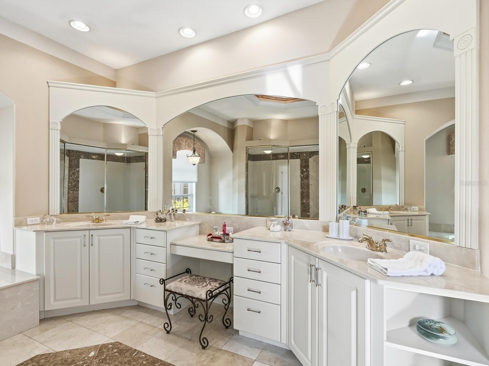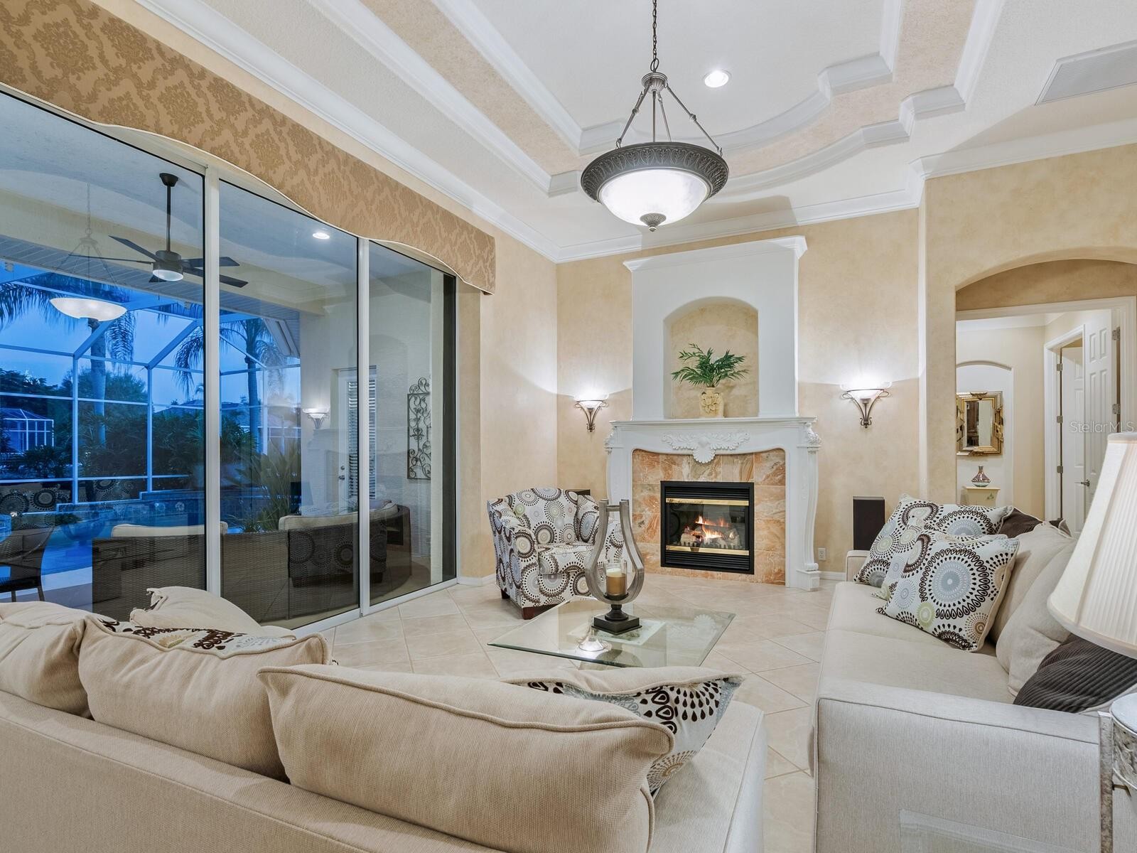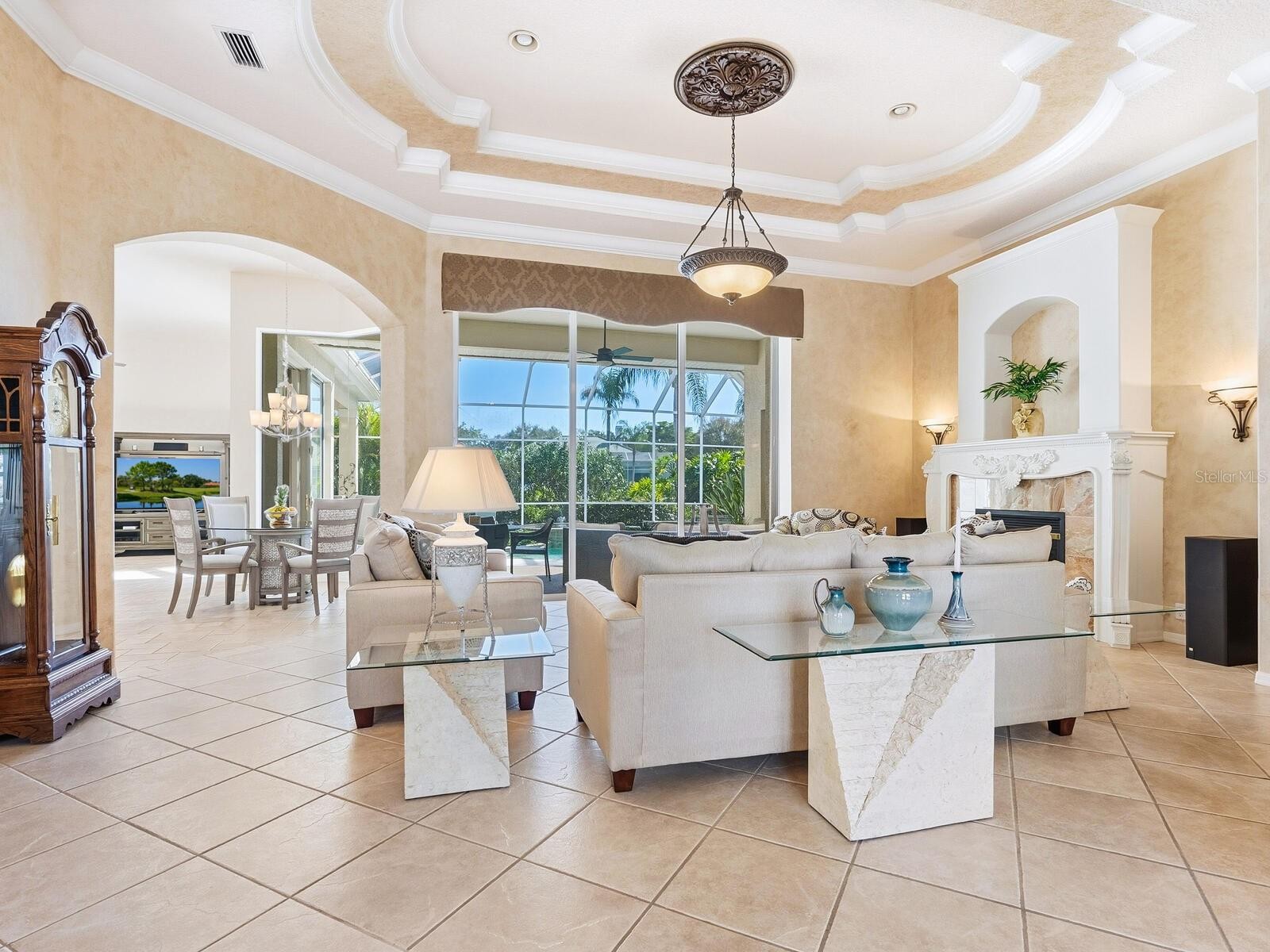 Welcome to this beautifully appointed Neal Custom Homes residence offering serene water views, exceptional architectural detail, and resort-style outdoor living. This 3-bedroom, 3-bath home with an oversized 3-car garage offers 3356 sf and is thoughtfully designed for both everyday comfort and elegant entertaining. A double designer leaded-glass front door opens to a striking foyer with marble inlay flooring, setting the tone for the refined interiors. High-end ceramic tile laid on the diagonal flows throughout the main living areas, complemented by tray and coffered ceiling details, crown molding, custom niches, and recessed lighting. The living room features a triple tray ceiling, an electric fireplace, and pocket sliders that open seamlessly to the lanai. The brand-new kitchen (2021) is the heart of the home, showcasing rich off-white wood cabinetry, exotic granite countertops, a quartz-topped center island, GE stainless steel appliances, subway tile backsplash, under-cabinet lighting, a spacious pantry, built-in oven with microwave, and an aquarium window in the breakfast area. Open to the family room and lanai, this space is ideal for entertaining. The primary suite is a private retreat featuring a sitting area with bay-style windows, coffered ceiling, dual customized closets, double-door entry, and private access to the lanai. The spa-inspired, wheelchair-accessible primary bath offers an oversized marble-detailed shower, Jacuzzi tub, marble flooring, expansive double vanity with makeup area, cultured marble countertops, triple mirrors, and new designer hardware. Bedroom two is a generously sized custom suite with a large closet and bath featuring a cultured marble vanity and tub/shower combination. Bedroom three is adjacent to a full hall bath with enclosed shower, linen closet, and updated brushed-silver fixtures. A large rear den with cathedral-style ceiling and sliders to the lanai can easily serve as a fourth bedroom with the addition of a closet. Step outside to your private oasis with a kidney-shaped heated pool and spa, lush updated landscaping with lighting, and a covered lanai offering space for a future outdoor kitchen (currently equipped with refrigerator and cabinetry). The oversized 3-car garage features higher ceilings, a painted floor, storage cabinetry, exterior access, and an electric hydraulic car lift, perfect for car enthusiasts. Additional highlights include central vacuum, exquisite lighting, select new fans, window treatments, brushed-silver hardware throughout, and a well-appointed laundry room with cabinetry, sink, and built-in ironing board. Available furnishings may be purchased separately.