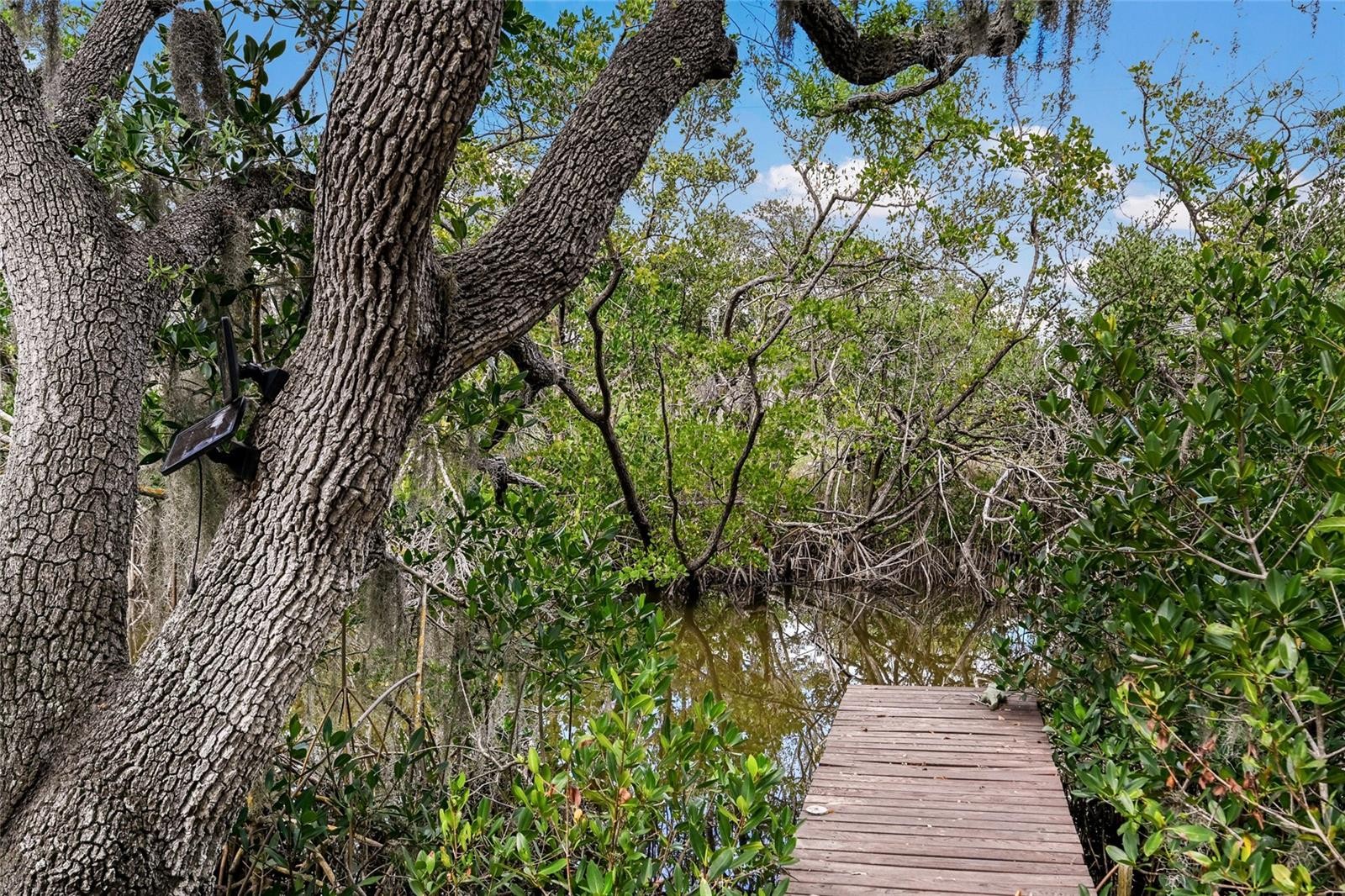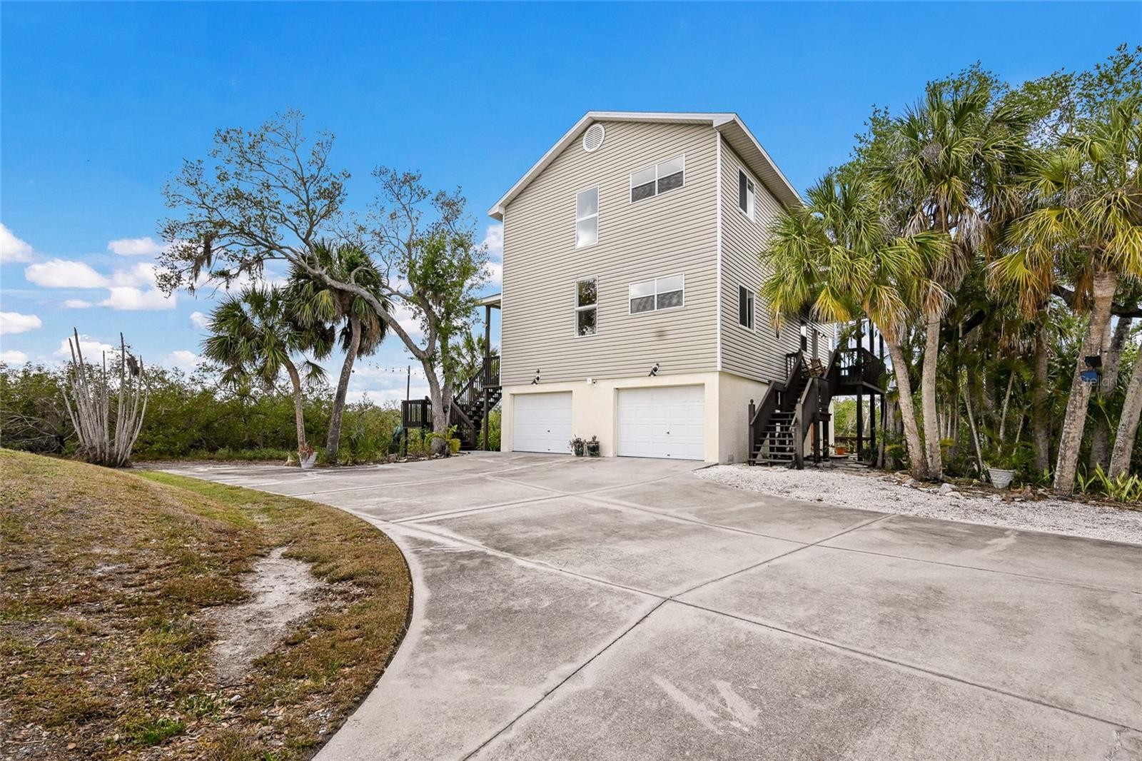 Tucked away in a private, natural setting, this highly upgraded 3 bedroom, 3 bathroom home offers a truly one-of-a-kind living experience with stunning distant views from nearly every room. Surrounded by lush scenery with no close neighbors, this property provides a rare sense of privacy. Filled with natural light, the home features walls of windows that bring the outdoors in and create an airy, treehouse-like feel throughout. Designed with quality craftsmanship and thoughtful detail, the open concept main living area showcases tongue and groove ceilings, wood wrapped beams, intricate trim work, and crown molding. The beautifully appointed kitchen features quartz countertops, a breakfast bar, wine fridge, and high-end stainless steel appliances, all flowing seamlessly into the spacious living and dining areas. The main floor includes the living room, dining area, kitchen, two decks, one guest bedroom, and a full bath. The top floor features the primary suite, complete with large windows, a fireplace, oversized closet, and a private balcony with endless views. The ensuite bath offers a Jacuzzi tub, dual vanities, and a walk-in shower. Also on the upper level is an additional bedroom and full bathroom. The first level offers a large garage space with room for water toys, storage, and a game room setup. Adding to the charm of this exceptional property is a unique crow’s nest, offering the perfect perch to take in breathtaking sunset views. Outdoors, a small saltwater canal creates a private kayak tunnel leading out to the open bay, where you can fish, island hop, and fully enjoy the Florida waterfront lifestyle. Offered fully turn-key, this property may be purchased furnished and includes kayaks, bikes for cruising the island, and a UTV, making it ready to enjoy from day one. A rare opportunity to own a distinctive property that combines privacy, character, exceptional finishes, and an unmatched connection to nature, the water, and the Florida lifestyle.