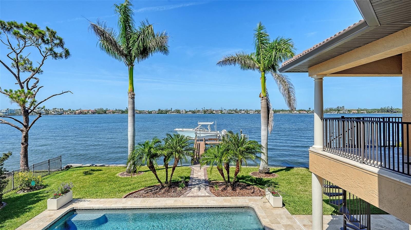 Spectacular Bayfront Location. Nestled on a cul-de-sac with 104 feet of water frontage, this Mediterranean style luxury estate offers unobstructed panoramic views of Sarasota Bay. This delightful setting includes a tropical backyard with a private L-shape 320 sq ft dock equipped with a new 13,000 lb. boat lift – perfect for fishing, kayaking, and boating. A newly-crafted paver designed circular driveway enhances the home’s exceptional curb appeal. The front stairway leads to double solid crafted wood doors that open to 5,175 square feet of living space with multiple upgrades highlighted by 5 bedrooms, 5 ½ bathrooms, and a large bonus room. Engineered hard wood floors seamlessly blend the living areas of this functional floorplan. Stunning water views and an inviting formal living room set the tone upon entering the home with soaring high ceilings extending past the second floor and anchored by a striking gas fireplace creating an elegant focal point. The high-end custom kitchen – a chef’s dream – features stunning solid hand-crafted wood cabinetry, two copper sinks, 6-burner gas range with custom hood, two ovens, granite countertops, a large island with a breakfast bar, sub-zero refrigerator, and top-tier appliances. Adjacent to the kitchen, the epic sitting room with a wall of windows provides captivating views for a serene living environment. The covered outside terrace gives an expansive, airy feel to the kitchen and living areas with breathtaking views of the pool area, the bay, and beyond. The generous primary suite provides a tranquil escape with additional bay views, as well as offering an updated en-suite bathroom and a large walk-in closet. Generous closet storage with thoughtfully designed built-ins adds to the function of this suite. The second floor offers a large bonus room with a wet bar, 3 bedrooms with their own private guest baths for added convenience. The 5th bedroom with an en-suite bath is currently being used as an office. Step outside to your private oasis: a large, covered patio overlooking the pool and spa with stylish tiled decking. The outdoor space continues with a manicured landscaped yard, leading to a staircase down to the dock, which is equipped with electric and water hookups for ultimate convenience. This residence boasts architectural features including crown molding, custom fireplace with built-ins, and tall custom baseboards. Other features include an elevator, large laundry room, split 3-car garage, new updated garage vented shutters, new roof, new gutters, new paint, new pool equipment, a new boat lift with an extra dock for your jet-ski, kayak or paddleboard, new water heater and more. Located in a coveted West of Trail Buccaneer Bay neighborhood that offers proximity to Siesta Key beach, restaurants, shopping, and downtown Sarasota. A premier waterfront property combines elegant craftsmanship and incredible views to create an unparalleled Florida lifestyle.
