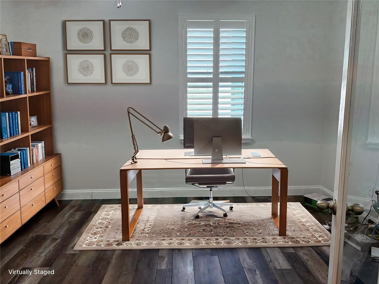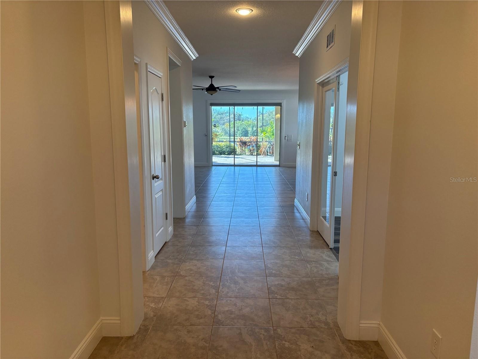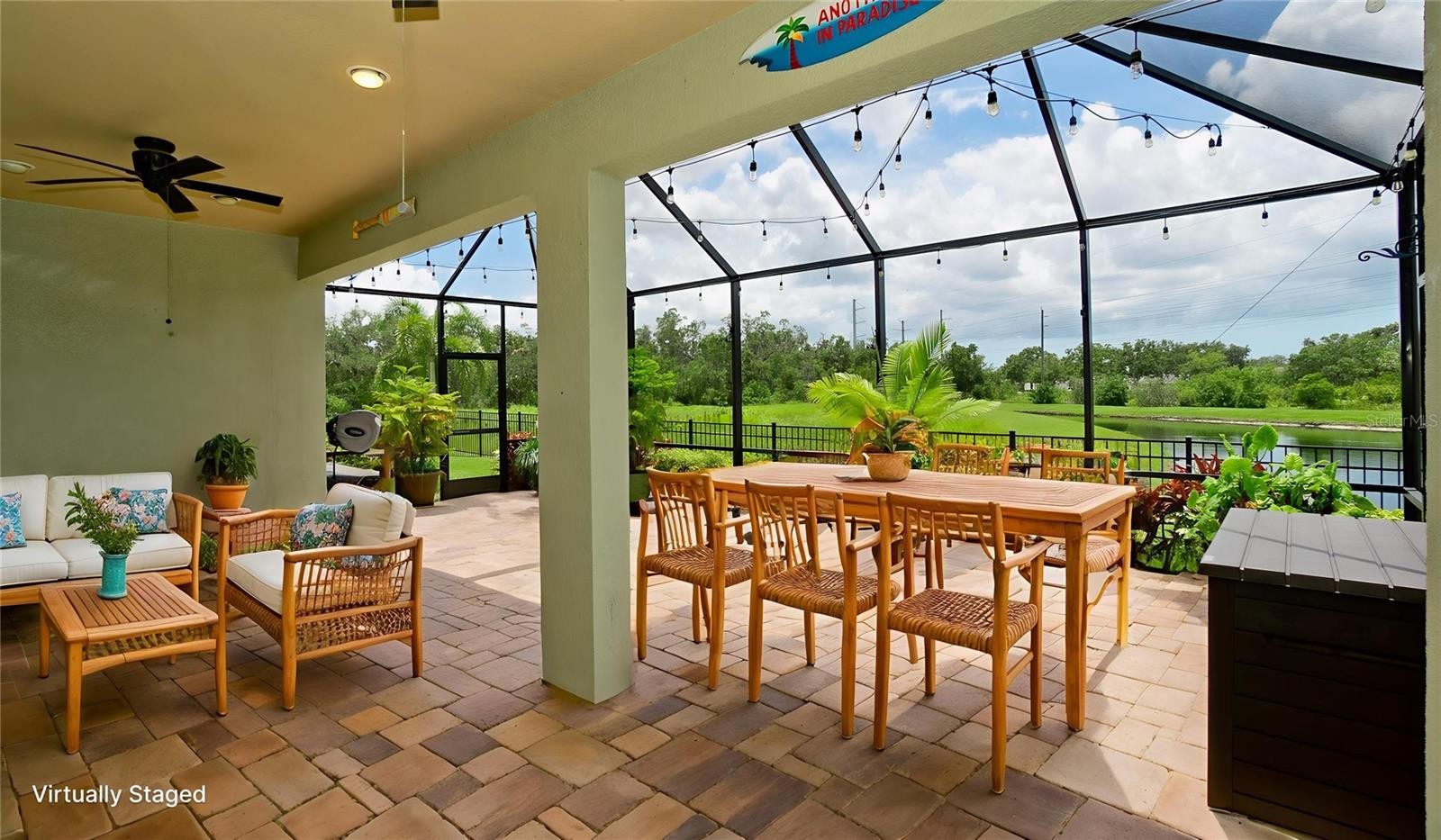 Welcome to this immaculately maintained original home in the desirable community of Stoneledge. With 3 bedrooms, a den, and 2.5 baths across 2,035 square feet, this residence offers a seamless blend of comfort, style, and thoughtful upgrades. Freshly painted interior 11/2025. Nestled on a fully fenced homesite overlooking a tranquil pond, the backyard is your private oasis—complete with an extended screened lanai, pavered patio, Edison-style lighting, and concrete under the rear fence for added security. Enjoy spectacular evening sunsets right from your backyard. Inside, you’ll find tile flooring throughout the main living areas, luxury vinyl waterproof plank flooring in the office, and carpet in primary & one guest bedroom. The wide entry foyer, custom crown molding, updated baseboards, and plantation shutters at the dining room and office enhance the home’s elegant character. The gourmet kitchen is equipped with stainless steel appliances, 42-inch wood cabinetry, granite countertops, under-cabinet lighting, USB-equipped, pendant lights over the island, and slide-out drawers in the lower cabinets. A pantry with durable steel shelving completes the space. Additional highlights include: Accordion and roll-down hurricane shutters throughout, included generator, 20-amp service in the den for an extra fridge or freezer, Primary suite with double vanities, soaking tub, and separate shower, large front-load washer and dryer with storage shelves, closet upgrades with double-door entry and blackout curtains in one guest room. Low monthly HOA of just $92, covering ponds, common areas, entrance, dog park, and mailboxes. New AC system (Feb 2024) with transferable 10 year warranty. Average electric bill of just $125/month. Every detail has been thoughtfully designed and lovingly cared for—this is truly a move-in-ready gem in a sought-after neighborhood.