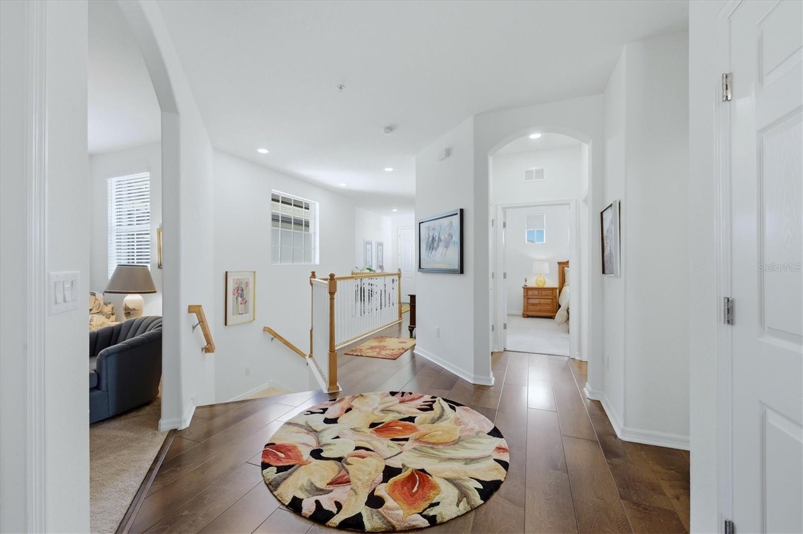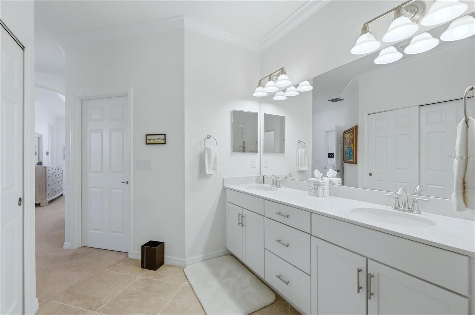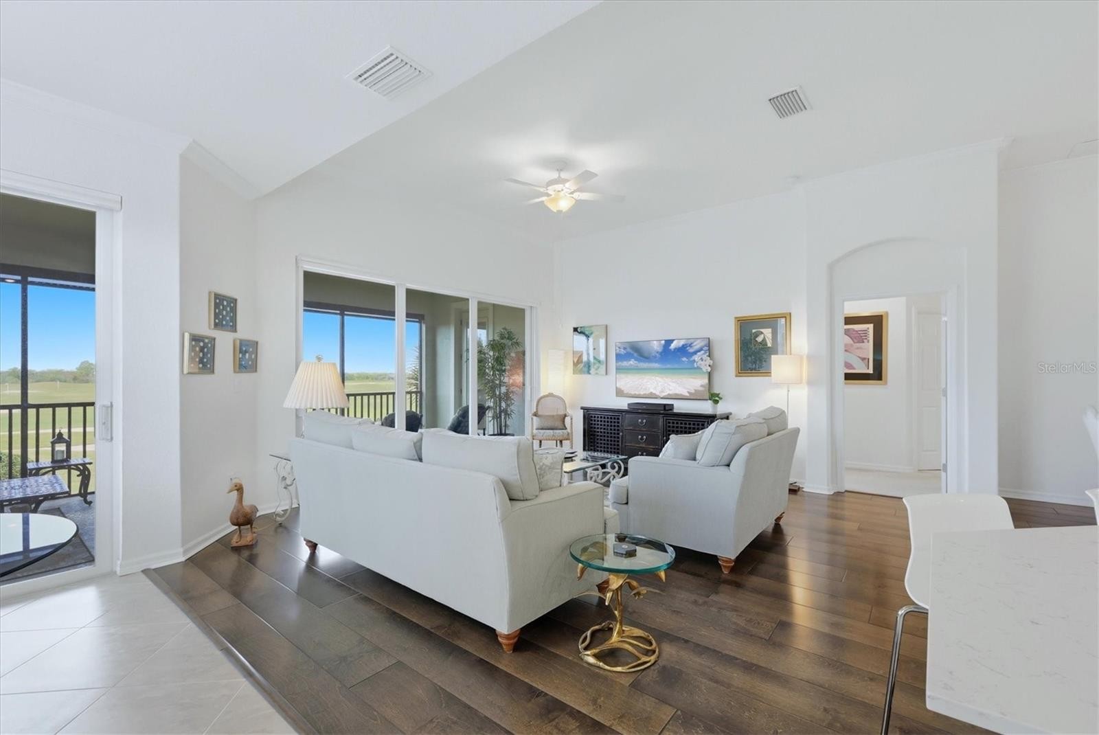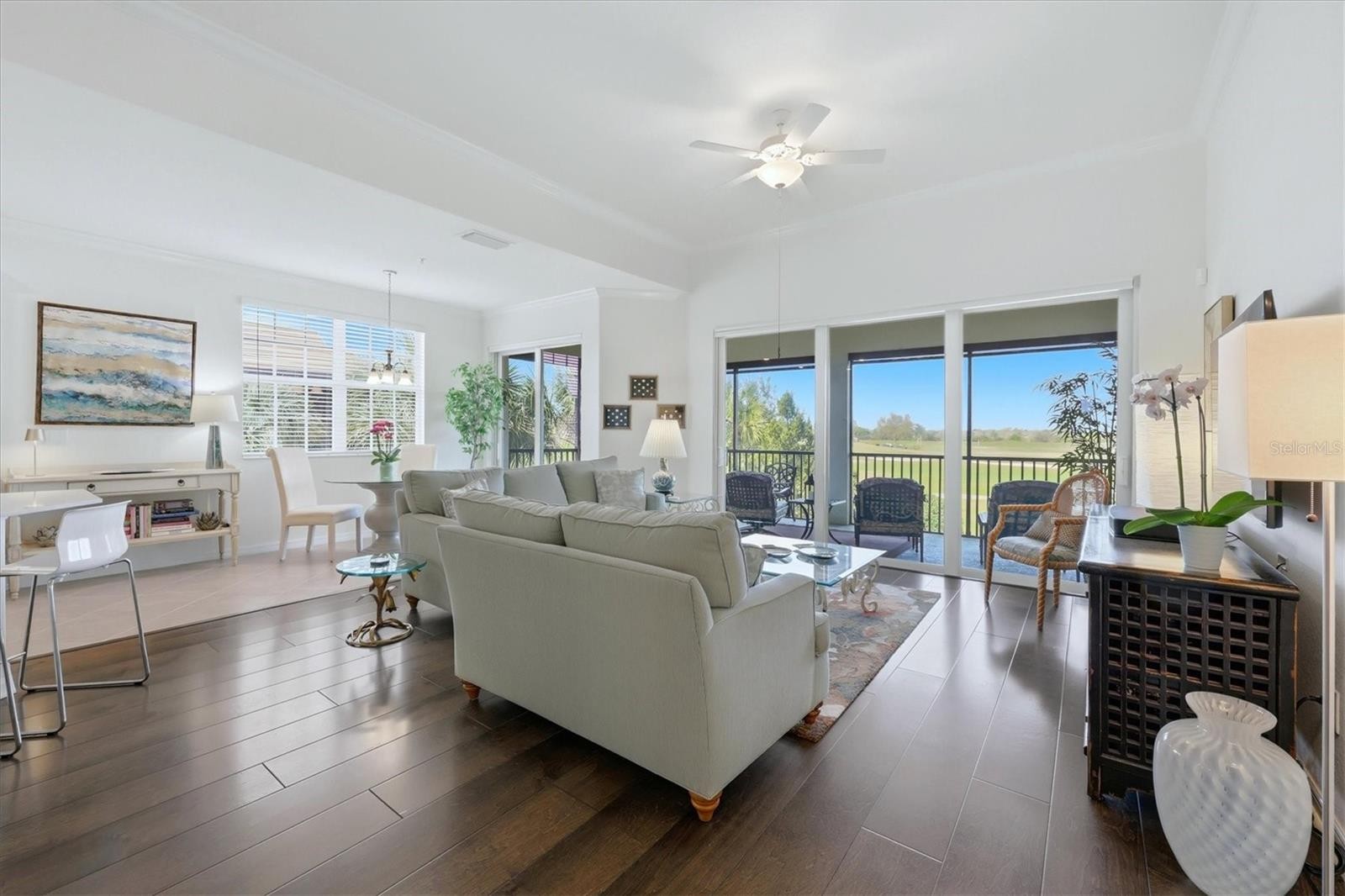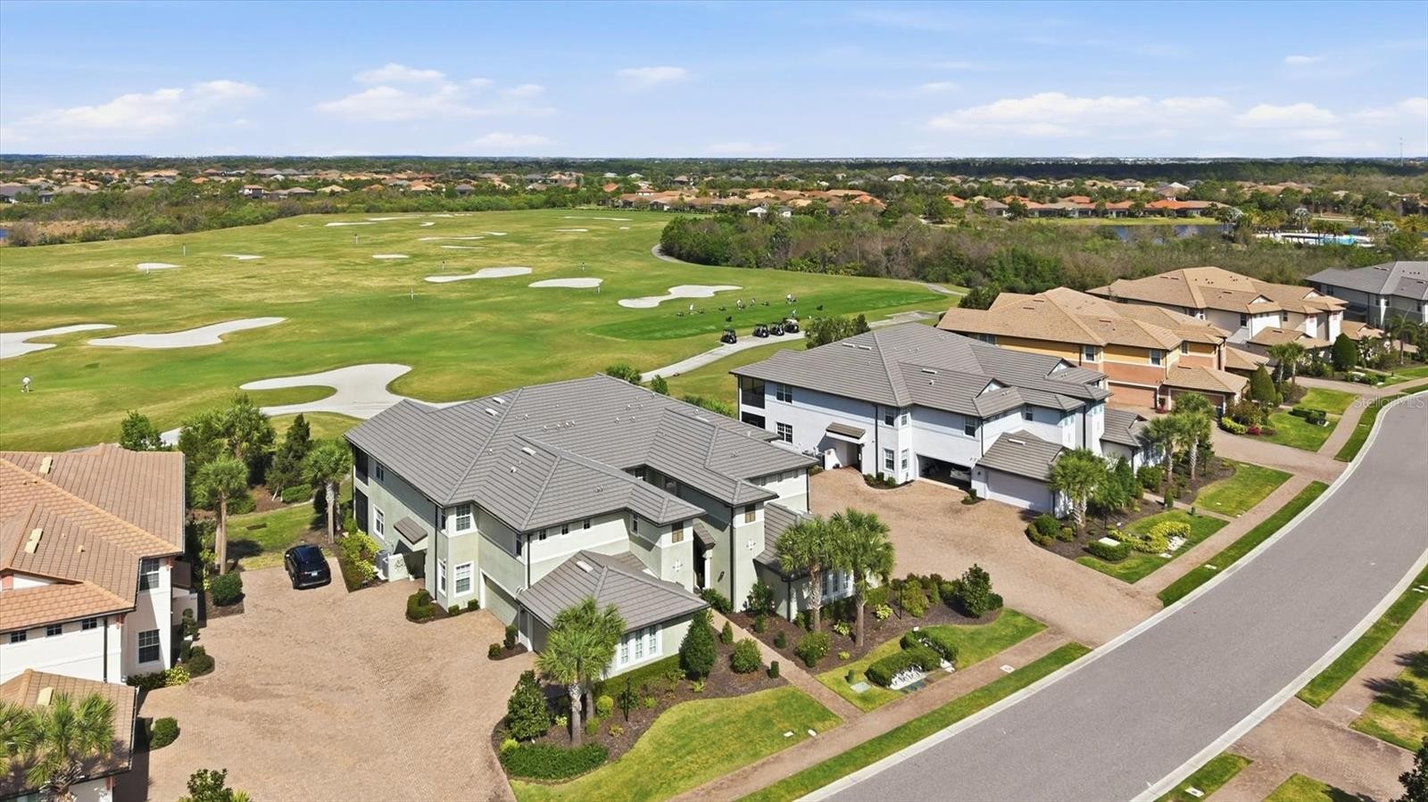 Fantastic, Immaculately Clean, Meticulously Maintained 2nd Floor 3 Bedroom, Den, 2 Bath SPACIOUS coach home Clubside in Country Club East of Lakewood Ranch. SPECTACULAR LONG RANGE GOLF COURSE VIEW! THIS VIEW IS A WOW! No cart path in sight. Gated, and Private Guard House Entrances into your upscale and well kept community. Beautifully decorated Great Room living space with engineered hardwood floors and crown molding. Tall Ceilings, Hunter Douglas Blinds and Plantation Shutters enhance the decor. Hurricane Impact Triple and Double sliders with access to the extra wide lanai with extra comfy seating to enjoy the amazing backdrop. Light and Bright! Open concept Kitchen with 42" tall white cabinetry and white quartz countertops, stainless steel appliances and a gas range. Huge One level Island to gather round when entertaining! Dining area can accommodate a large table and additional eating area for a smaller table. Primary Bedroom suite with same golf course view, Crown Molding, Coffered ceilings, ensuite Bath with dual sinks, quartz counters, large linen closet, walk in closet, and a frameless shower enclosure. Guest Bedrooms split plan in the front of the unit with a full guest bathroom in between. Comfy Den/Study across from Guest bedrooms. Plenty of closet space and oversized attached two car garage. Never run out of hot water with a Tankless Gas Water Heater. All Windows and Doors are Hurricane Impact rated. The Retreat is an amazing upscale Clubhouse for residents and their guests only. Gorgeous Pool, Fitness Center, and Patio Situated on The Royal Lakes Golf Course offering beautiful Golf Course and Lake vistas. The Lodge and several Golf courses Require an additional Country Club Membership. Lakewood Ranch is an award-winning master-planned community with glorious weather, top-rated schools, and a perfect inland location. Enjoy proximity to world-renowned beaches (Siesta Key, Lido, Longboat, and Anna Maria), public golf courses, boating, fishing, biking, walking trails, UTC Mall, and countless restaurants. Downtown Sarasota and Bradenton offer vibrant dining, rooftop bars, arts, and cultural venues. Multiple international airports within an hour. Welcome to the Gulf Coast lifestyle!