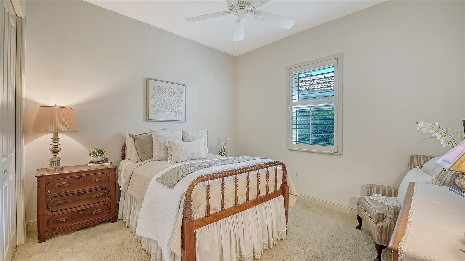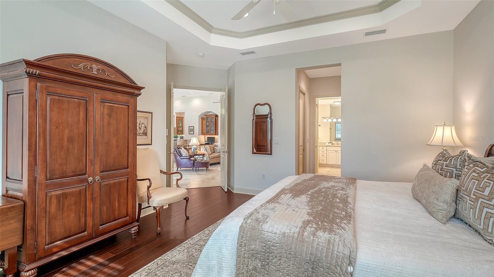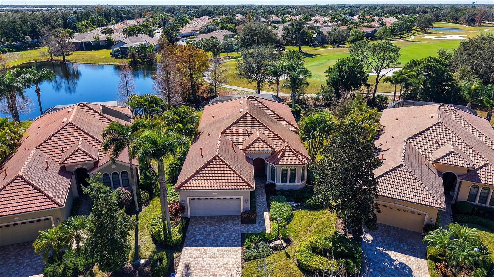 Welcome home to this beautifully updated three-bedroom residence in the charming, maintenance-free neighborhood of Riviera Cove, nestled within the gated Lakewood Ranch Country Club. This Gibraltar-built Matisse model combines timeless design with modern peace of mind. Sun-filled interiors showcase soaring 12-foot ceilings and dual sets of upgraded impact-rated sliding glass doors, framing tranquil south-facing views of the lake and lush, mature landscaping. The outdoor living space is a true retreat, featuring a screened lanai with heated pool and spa, dedicated pool bath, wood paneled ceiling, electric hurricane shutter, and outdoor kitchen—perfect for al fresco dining and relaxed Florida living. Inside, new impact-rated front entry doors welcome you into a spacious foyer and open-concept floor plan. The elegant dining room offers plantation shutters, designer lighting, and a convenient pass-through to the gourmet kitchen. The heart of the home features granite countertops, rolls outs in lower cabinets, stainless steel appliances with natural gas, breakfast bar, built-in desk area, and a sunny dinette that flows seamlessly into the great room—ideal for entertaining or unwinding. The private primary suite with engineered wood flooring overlooks the lake and includes plantation shutters, two custom walk-in closets, and a beautifully updated spa-style bath with dual sinks, vanity station, wood cabinetry, private water closet, and a large walk-in shower. Bedrooms two and three are located at the front of the home with easy access to the updated secondary bath. A versatile study with wood floors offers the flexibility to create a fourth bedroom, fitness room, nursery, or creative space. Additional upgrades include all impact glass windows and sliders, a new Trane HVAC system in 2025, and thoughtful finishes throughout—offering both comfort and storm-ready security. Riviera Cove residents enjoy a private community pool and convenient access to the rear residents-only gate to Lorraine Road. Optional Lakewood Ranch Country Club memberships provide access to four championship golf courses, 20 lighted tennis courts, pickleball, a state-of-the-art athletic center, an Olympic-size pool, two clubhouses, and more. Located within one of the nation’s top master-planned communities, you’ll also enjoy top-rated schools, and premier shopping and dining at Waterside Place and University Town Center. This exceptional home offers the perfect blend of lifestyle, value, and location—schedule your private showing today.