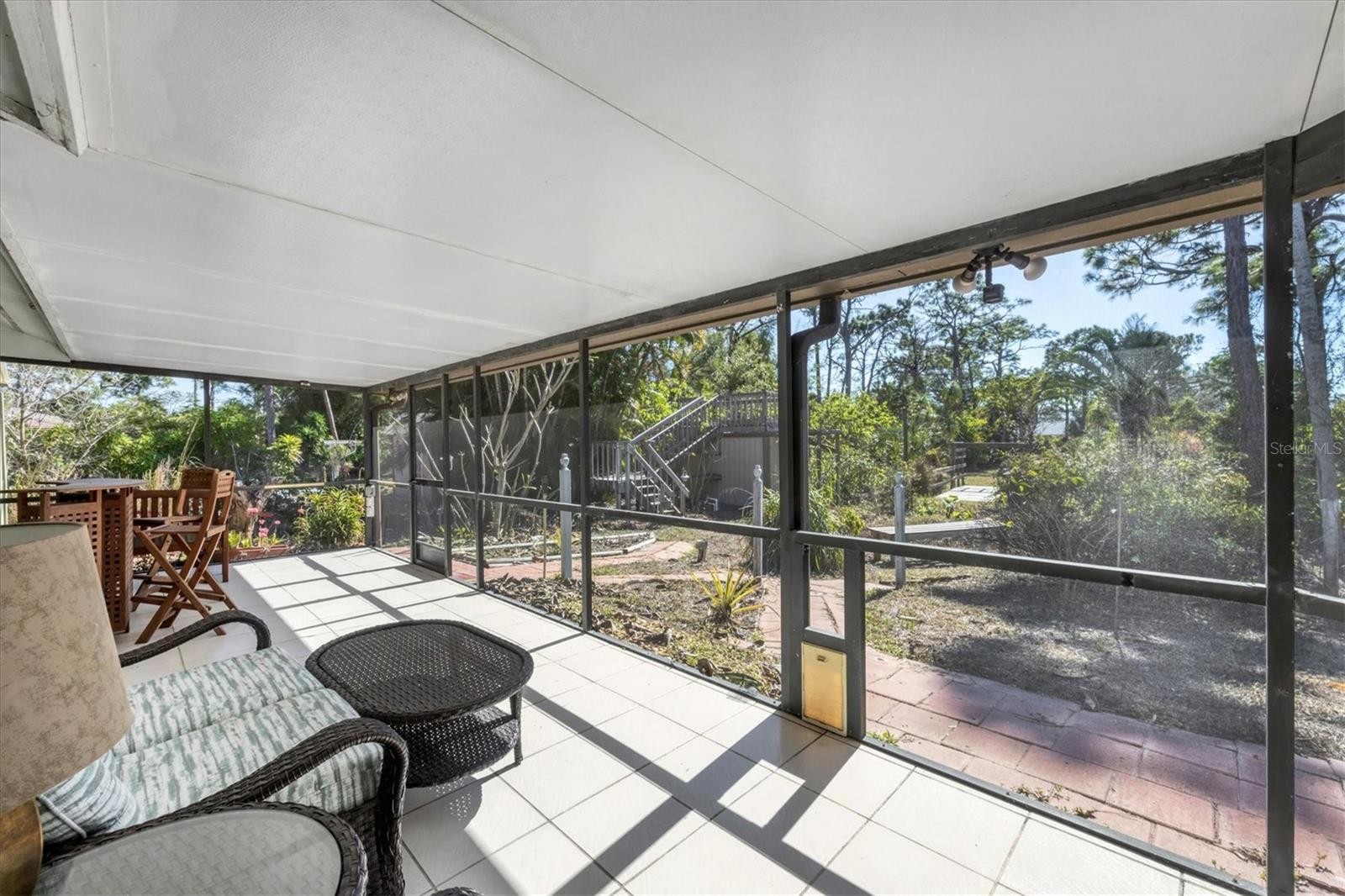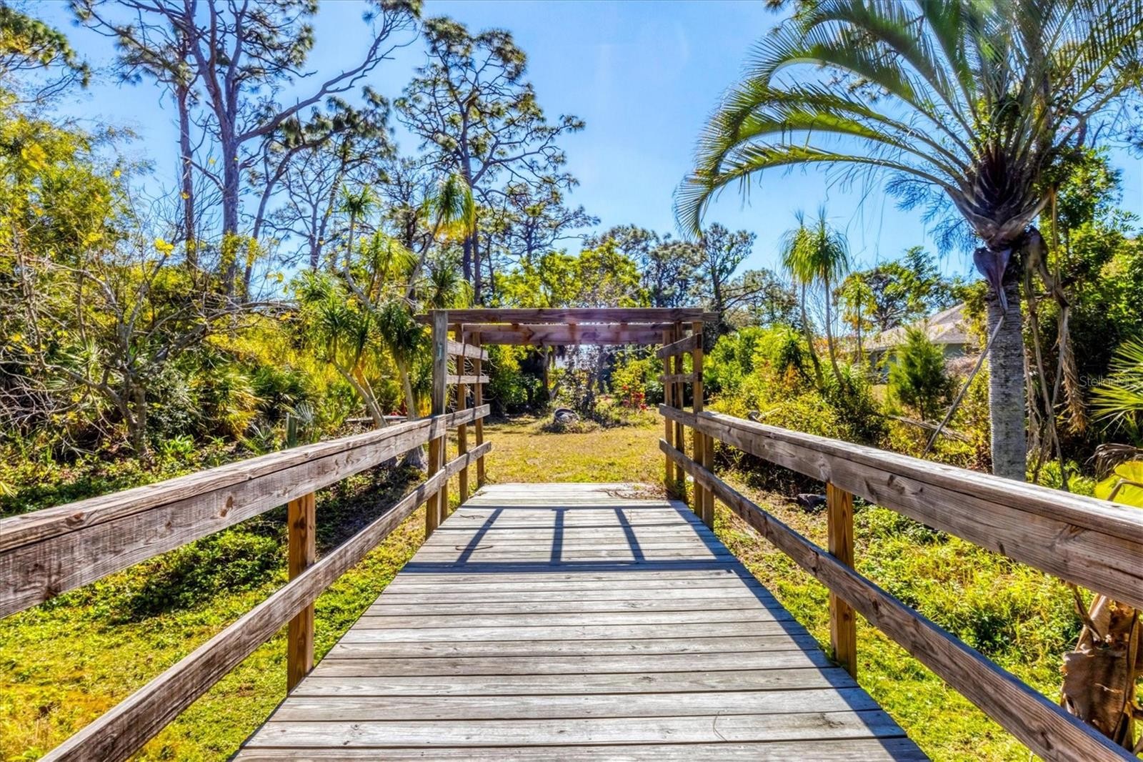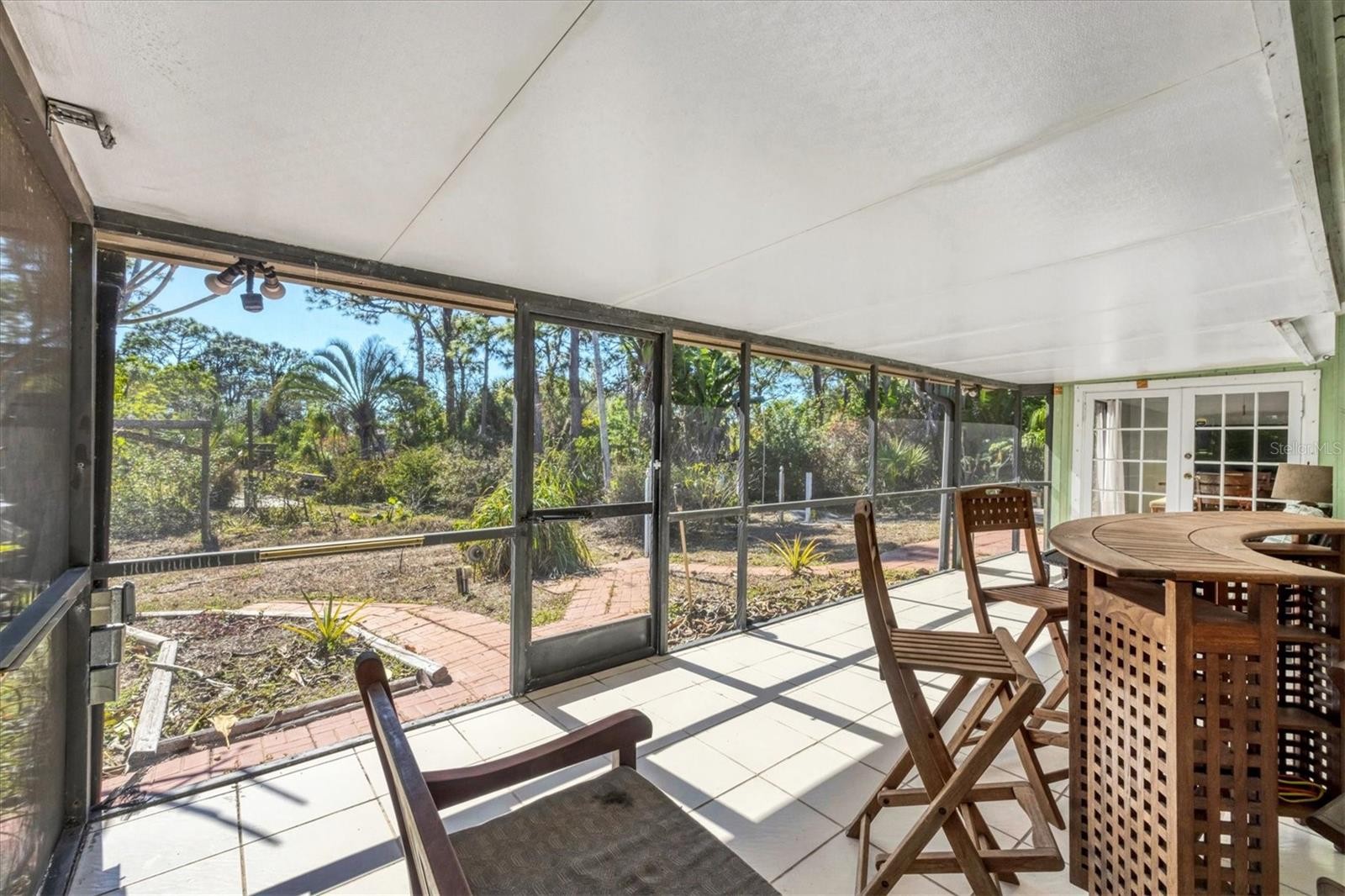 Nestled at the end of a quiet cul-de-sac, this property provides both privacy and potential, making it a truly special find. A beautifully designed brick-paved driveway winds through lush, tropical landscaping bursting with butterfly-friendly flowers, leading to the welcoming front entrance. Step through the front door and be greeted by high ceilings and a stone, wood-burning fireplace that serves as the heart of the home. Designed for both functionality and privacy, the split floorplan ensures a serene retreat for the primary suite. Crown molding accents add a refined touch, while expansive windows flood the home with abundant natural light. The kitchen features spacious solid corian countertops, rich wood cabinetry, and clever built-in organizers. Unique stained glass accent doors lend an artistic flair, and the breakfast bar provides a cozy space for casual dining. The primary bedroom serves as a private sanctuary, complete with an en suite bath and French doors that open to the serene backyard. The second bedroom is highly versatile, offering generous built in storage and the flexibility to become a home office, library, or creative space. Step outside to your very own OUTDOOR PARADISE (just needs a little work to bring it back to its amazing self). A screened-in patio invites relaxation, while an open-air deck is perfect for entertaining. Follow the meandering pathways through the beautifully landscaped grounds, filled with pollinator-friendly plants that enhance the natural surroundings. Rest easy with significant updates, including a NEW ROOF (2022), a RECENTLY REPLACED AC, a WATER HEATER updated 2-3 years ago, and a NEWER ELECTRICAL PANEL. Hurricane protection on all windows and doors provides extra peace of mind and no hurricane damage or flooding (X flood zone) from recent storms. Located in the highly desirable Old Englewood area (no HOA), this remarkable property is just moments from historic Dearborn Street, Lemon Bay Park, charming shops, delicious restaurants, and the breathtaking Gulf Coast beaches.