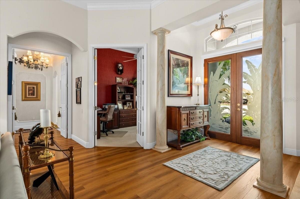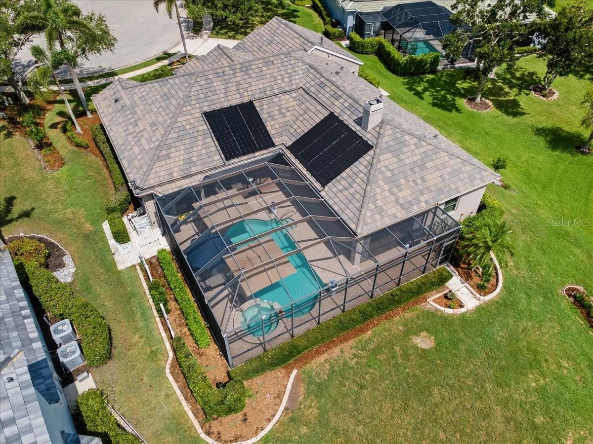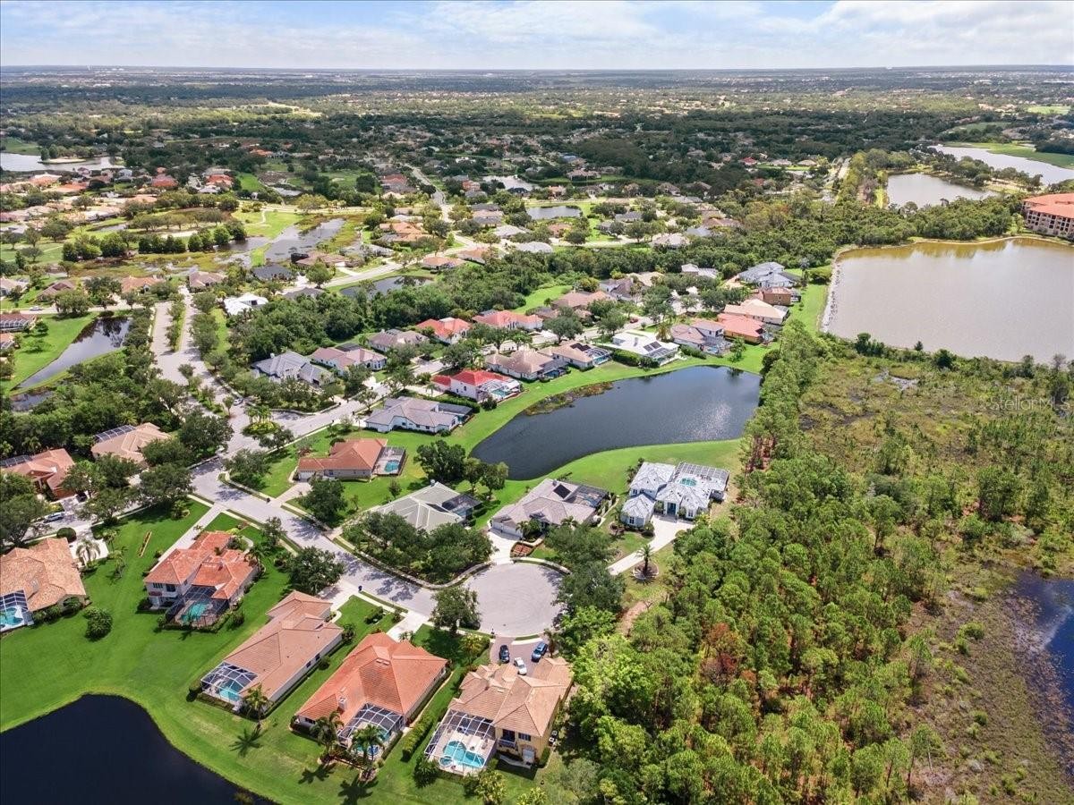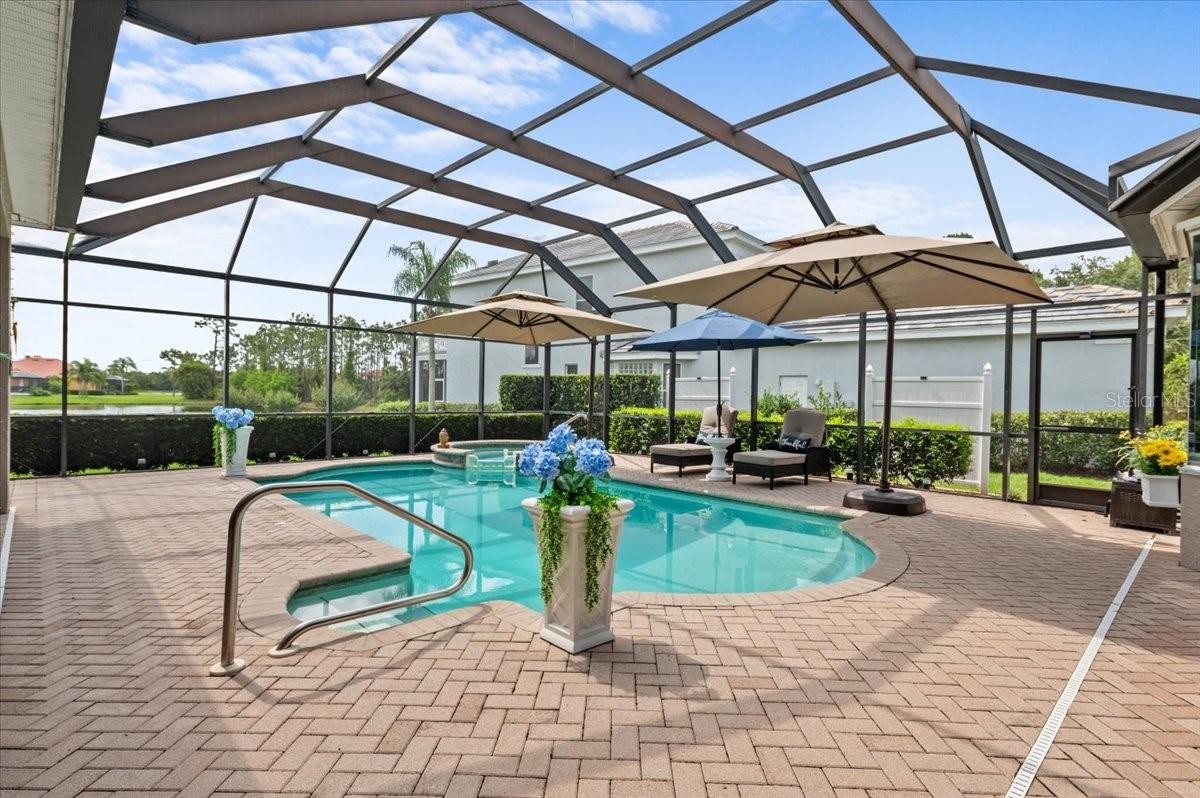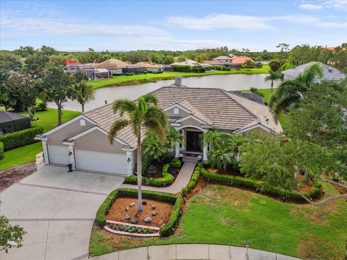 ***NO CDD *** 2024 ROOF*** This Private, Serene, Smart Home, is set in Lakewood Ranch's desirable River Club. Set on a quiet cul-de-sac of just eight homes, this 4-bedroom, 3-bathroom, Plus office/bonus room one-story home is a rare find in the coveted River Club community. Thoughtfully designed for privacy, comfort, and style, this meticulous home sits on an oversized lot with staggered placement for added seclusion, panoramic pond views, and lushly landscaped, lighted islands that bloom year-round. This home combines modern convenience, advanced security, and luxurious outdoor living in a peaceful, park-like setting. Located just minutes from top-rated schools, Lakewood Ranch Main Street, University Town Center, I-75, and world-famous Gulf beaches, this is more than a home—it’s a lifestyle. Inside, you're welcomed by expansive views of the pool, spa, and lake from the moment you step through the front door. The home features a 3-car garage, attic storage, and an ideal split floor plan with both formal and casual living areas, a separate dining room, and a flexible 4th bedroom or office with pool access. The chef's kitchen is equipped with stainless steel appliances, wood cabinetry, a central island, breakfast bar, pantry, and dinette—perfect for everyday living and entertaining. The primary suite is a tranquil retreat with pool views, lanai access, dual vanities, a soaking tub, and a walk-in shower. Multiple sliders from the living room, family room, primary bedroom, and den open to the screened lanai, ideal for seamless indoor-outdoor living Ample guest parking thanks to oversized cul-de-sac lot Features That Set This Home Apart: Solar-heated pool & spa with updated surface finish Google Smart Home: voice-activated lighting throughout Eight outdoor security cameras with on-site 2TB video storage Powered sunshades on family room sliders and windows for daytime movie viewing. Hurricane-rated double-hung windows, clear LEXAN panels, and Kevlar storm curtains for full storm protection Natural gas, 14KW generator for home backup power. Natural gas cooking, heating, water heater, and dryer-ready. Multi-stage A/C compressor and variable-speed air handler for energy efficiency New roof (2024). Plantation shutters throughout. Low HOA fees and no CDD fees. Access to the public River Club golf course, with optional membership available.