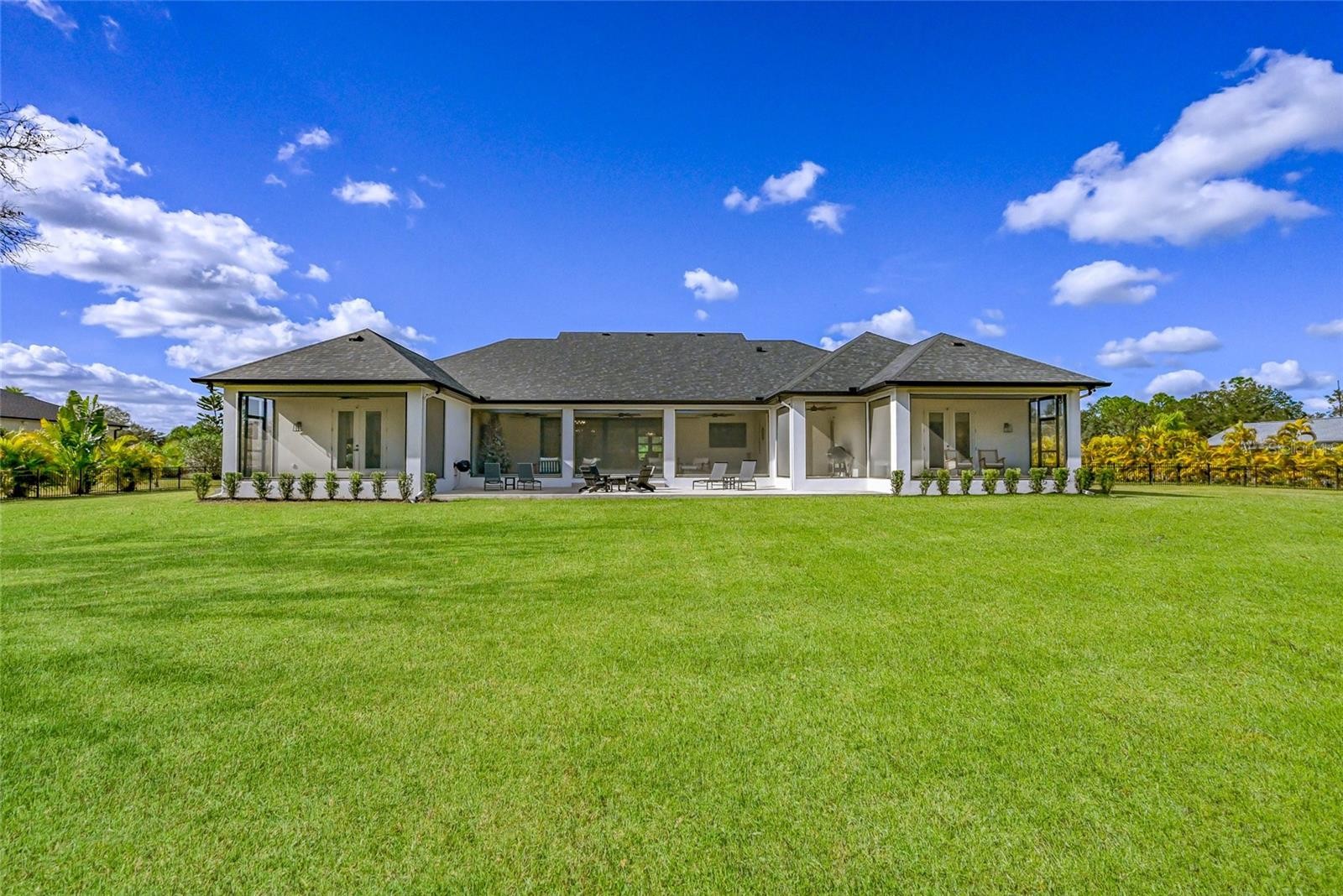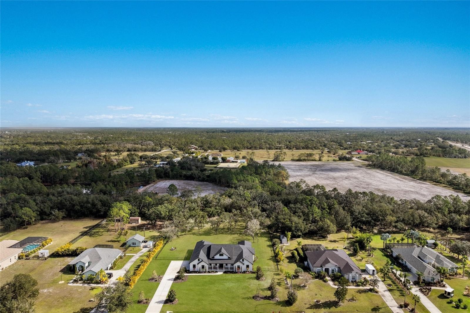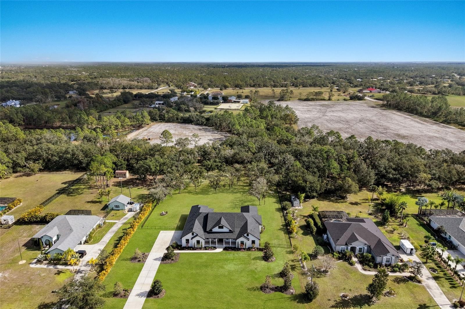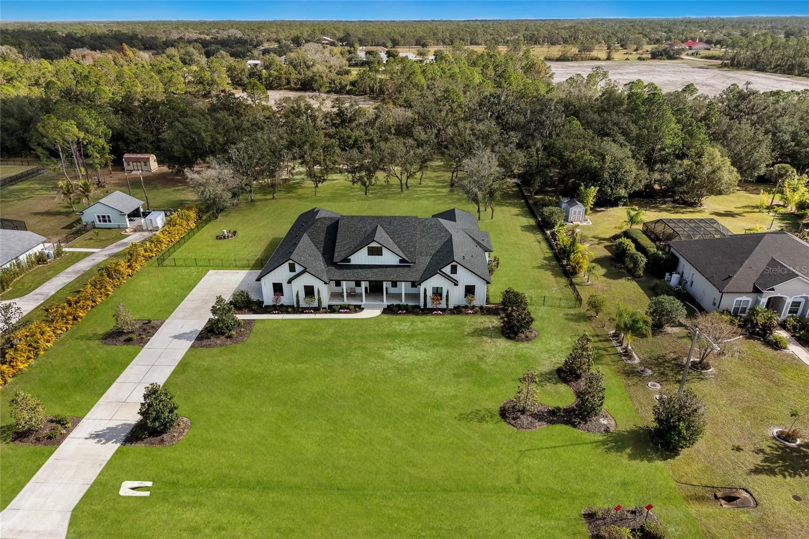 Welcome to Magnolia Oaks, a newly built modern farmhouse estate set on more than 1.7 acres of fully fenced, picturesque grounds in the heart of Lakewood Ranch. Framed by majestic oak trees and expansive open skies, this exceptional property offers a rare blend of space, privacy, and refined craftsmanship—an inspired blank canvas for elevated living. Spanning over 3,900 square feet, the thoughtfully designed residence features four bedrooms, four full baths, a private office, and a versatile bonus room, all wrapped in timeless farmhouse elegance. Soaring 12-foot ceilings grace the main living areas, enhancing the expansive open-concept floor plan with an abundance of natural light and an inviting atmosphere ideal for both everyday living and entertaining. At the heart of the home, the chef’s kitchen is a true showpiece—equipped with a professional-grade cooktop, dual ovens, oversized refrigerator, elegant walk-in pantry, and a stunning oversized island with sink, perfectly designed for gatherings, conversation, and culinary creativity. Designed for both beauty and peace of mind, the home is outfitted with impact-rated windows and sliding glass doors throughout, and is further enhanced by a whole-house generator, providing year-round security, comfort, and uninterrupted living. Indoor-outdoor living takes center stage with four inviting porches, including an extraordinary 1,000+ square-foot covered back lanai featuring a custom roll-up screening system for year-round enjoyment. Additional private porches extend from the primary suite and in-law suite, while the oversized front porch offers the perfect setting for sunset views and peaceful moments beneath the oaks. Each bedroom is designed as a private retreat, with three en-suite bedrooms providing exceptional comfort and privacy for family and guests. The flexible bonus room—currently utilized as a gym—can easily transition into an additional bedroom, nursery, office, or dream closet. A private in-law suite with its own porch offers independence and comfort, ideal for extended family or visitors. Completing the residence is an oversized 939-square-foot three-car garage, providing ample space for vehicles, storage, and hobbies. Outdoors, Magnolia Oaks truly comes alive. The beautifully landscaped grounds provide endless opportunities to roam, entertain, or simply relax in the shade of mature oak trees. The property also allows for the addition of a casita or guest house, creating exciting possibilities for future expansion. More than just a home, Magnolia Oaks is a lifestyle—a serene, private oasis where you can stretch out, breathe deeply, and create something truly special. This is modern farmhouse living at its finest.