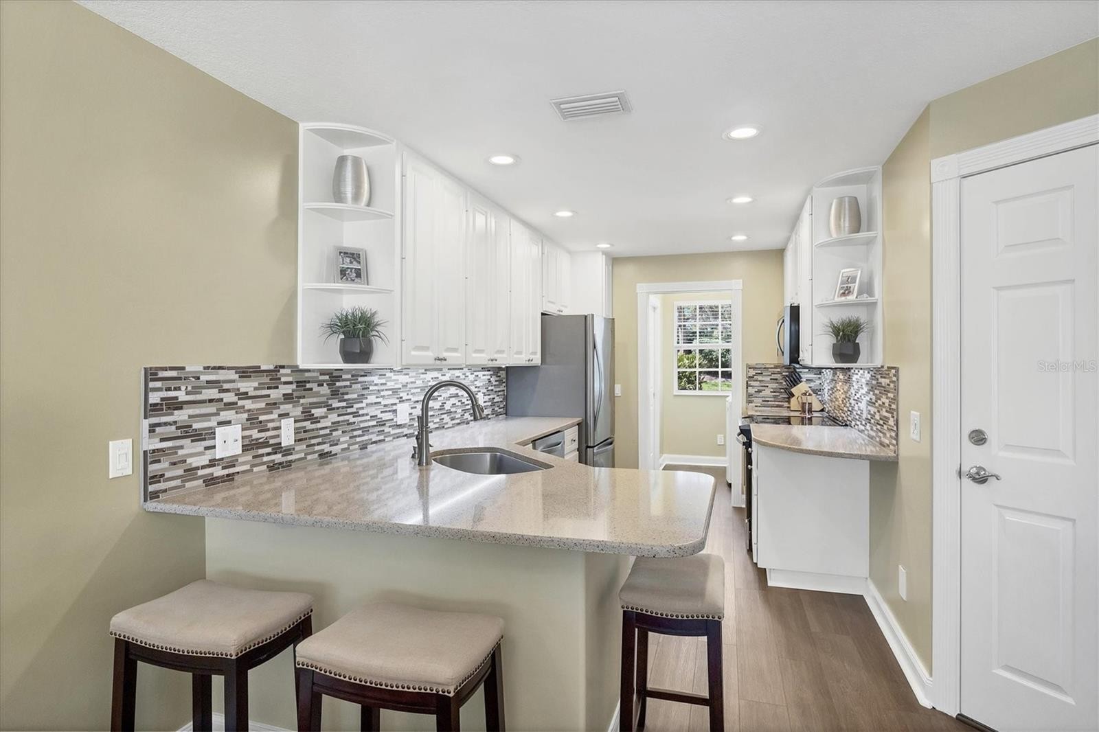 Truly a Birders Delight! Nothing beats the view from your backyard home overlooking a beautiful lake. One of the best views in VillageWalk! A 3-bedroom, 2.5-bath Catalina model townhome, tastefully remodeled and updated, perfect for buyers seeking tons of activities, and a multitude of amenities. Located in the highly desirable, resort-style community of VillageWalk, stay social and active. Set on the end of a quiet, tree-lined street, this two-story residence features its own private heated salt water pool, with amazing lake view. The kitchen opens to the spacious great room which includes beautiful built-in cabinetry, where sliding glass doors lead to your private screened lanai and pool deck. Upstairs, a split-bedroom layout provides comfort and privacy for all. The spacious primary suite overlooks the greenery and features two closets (including a walk-in) main bathroom has dual vanities, a soaking tub, and separate shower. Two additional bedrooms — one with a walk-in closet — share a full bath. Additional highlights include central vacuum system, a half bath downstairs, an interior laundry room with cabinet storage, the best Janssen accordion (pull across) hurricane shutters on main windows, storm shutter panels for lanai sliders, tile roof, under-stair storage, and an attached one-car garage with custom SlatWall garage storage system throughout. Update inside ceiling fixtures and fans, including a partially covered lanai with new ceiling fans. Built by Divosta, with reinforced steel and poured concrete walls. Thoughtfully remodeled and updated townhome throughout including, all new luxury flooring and carpeting, tastefully tiled bathrooms, updated kitchen quartz counters and glass tiled backsplash, quality appliances and new water heater, and updated pool heater and pool pump in the last 5 years. Located within the award-winning, gated, and maintenance-free community of VillageWalk, resort-style amenities include: a geo thermal lap pool, and lagoon geo thermal pool with Tikki-Bar, excellent fitness center, six Har-Tru tennis courts, pickleball, basketball, bocce ball, and miles of scenic walking and biking trails across the 500 acre community. The charming Town Center includes a café, bar, salon, gift shop, meeting space, on-site gas station, 24-hour guardhouse, and a full calendar of clubs and social events — located minutes from Siesta Key Beach, Legacy Trail, top-rated schools, and all the culture, dining, and recreation that Sarasota’s Palmer Ranch has to offer. Perfect for full-time residence or a seasonal retreat, this home offers Furnishings available for purchase under a separate contract.