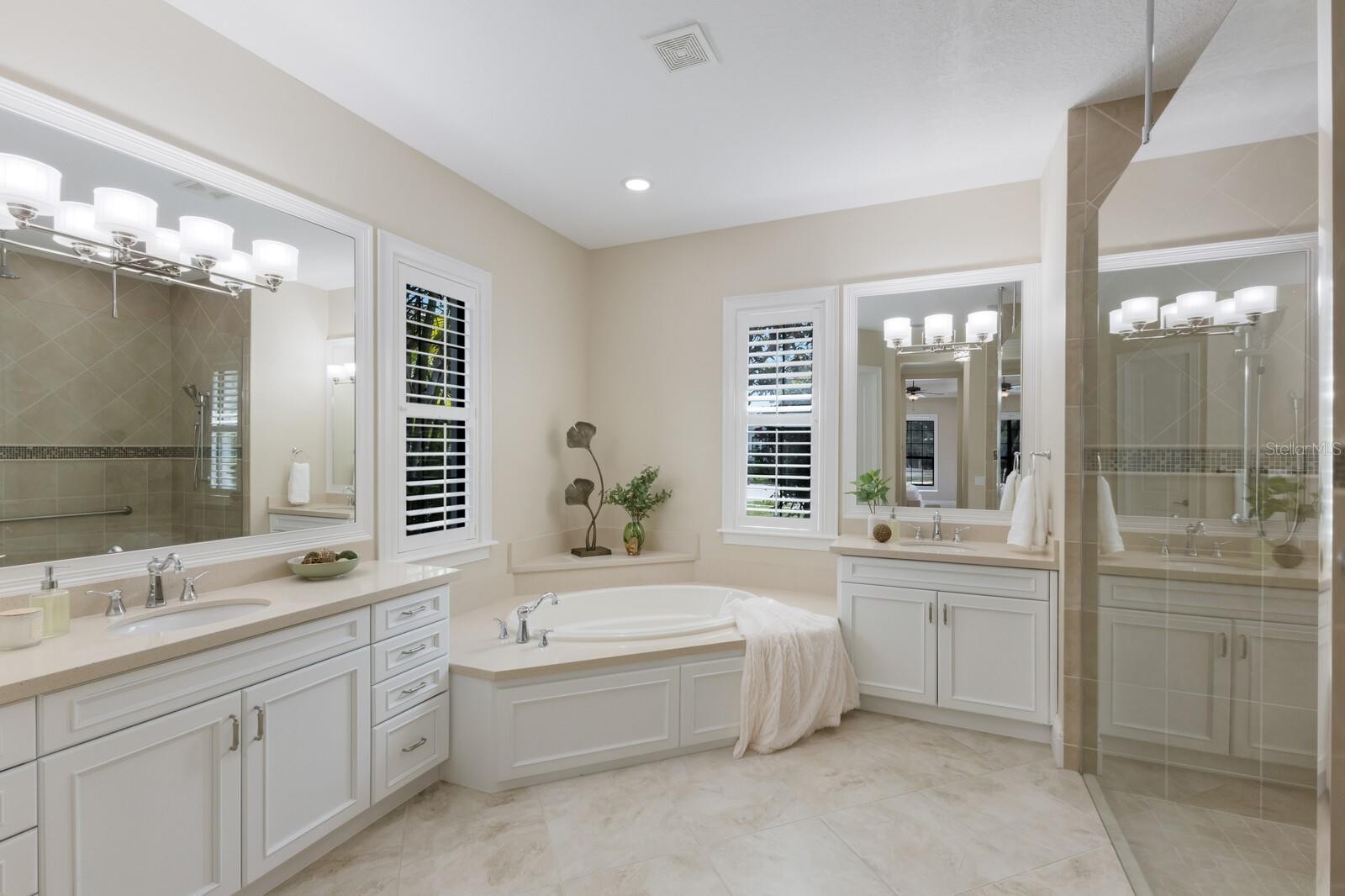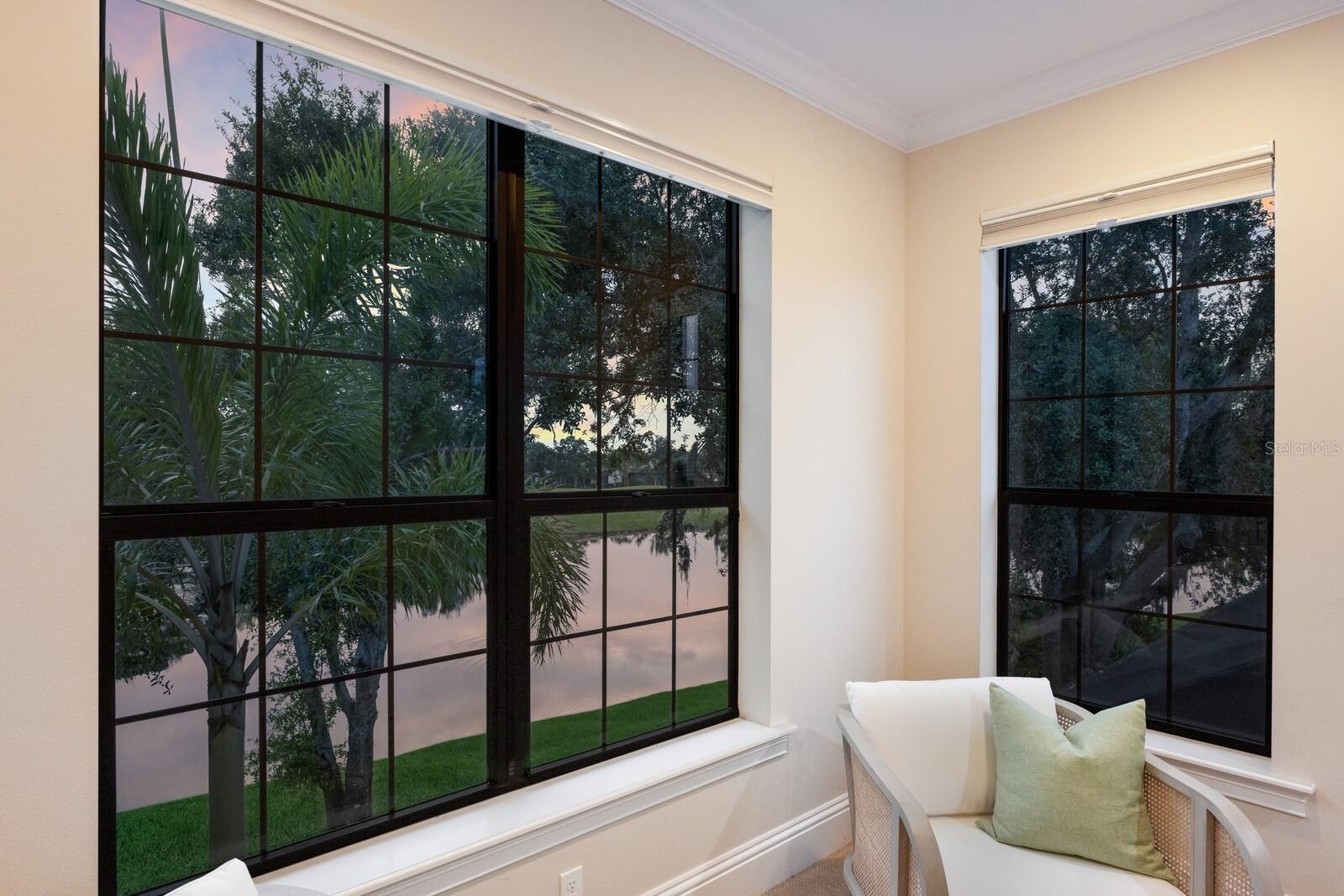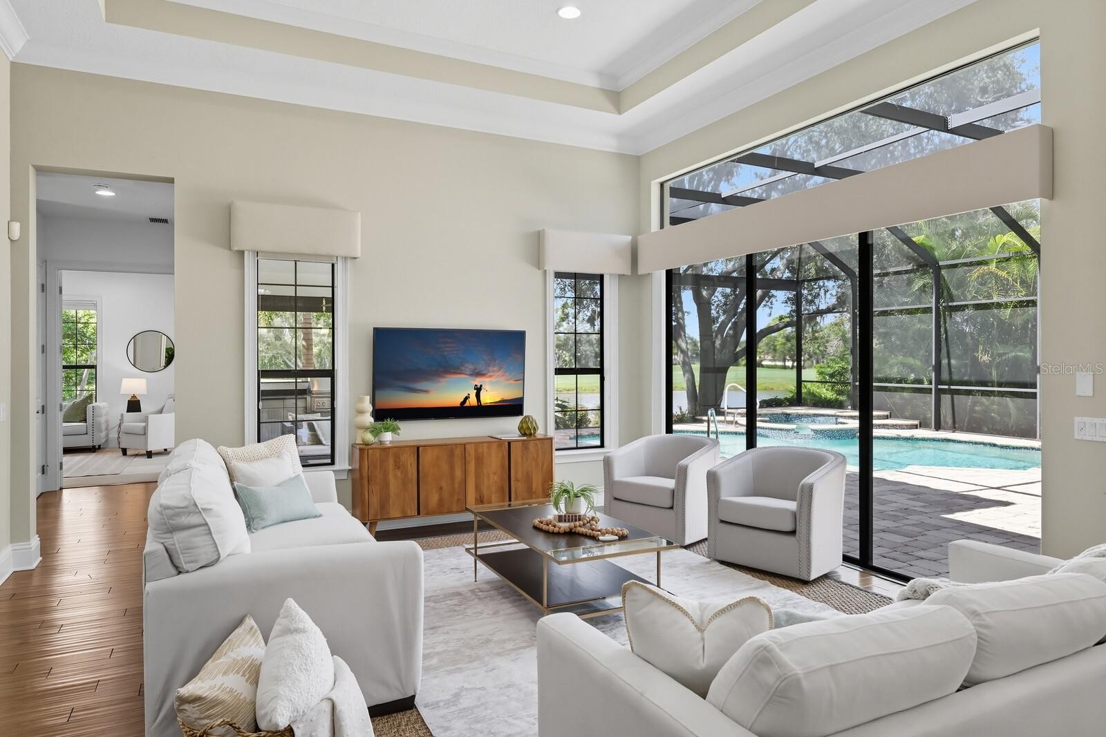 Savor one of the most breathtaking lake, golf, and preserve settings in Lakewood Ranch from this beautifully appointed Westover II model nestled in a serene, private setting on the King’s Dunes golf course in The Country Club. The light and bright 3,885 square foot residence custom built by Neal Signature Homes boasts westerly views showcasing perfectly proportioned spaces, exceptional design, newly painted interior and exterior, volume ceilings, engineered wood flooring, and stunning sunsets nightly. The recently installed new panoramic screened lanai cage further accentuates the outdoor living experience, along with the heated pebble tec pool/spa with sun shelf, two separate covered areas, gas fireplace and an outdoor Summer kitchen. The surrounding vistas bring the unmatched optic experience indoors seamlessly via sliding glass doors and a plethora of transom windows, with architectural details and designer touches throughout, including tray ceilings, crown moldings, and trimmings at every turn. An invitingly large great room open to the kitchen where form, function and design reigns cohesively with sprawling granite counters, wood cabinetry, high performance appliances, breakfast bar, a walk-in pantry, and a breakfast nook area adorned with the surrounding views beyond. Off the kitchen is a butler’s pantry with a wine fridge connecting to a lovely formal dining area and equally elegant living room infused with natural light. Unwind in the owner’s retreat positioned on its own private wing on the main level, offering two walk-in customized closets and a luxuriously appointed spa-like bath with separate vanity stations, stand-alone shower, and a free-standing soaking tub. Family and overnight visitors alike will be right at home with the three additional guest rooms , two on the main level anchored by a full bath, while a third guest room is located upstairs off the home’s fourth full bath. On the upper level, there is also an expansive bonus room offering multiple flex living space options boasting some of the most incredible golf views in Lakewood Ranch. Other notable highlights of this all-encompassing 5,351 square foot four bedroom four full bath maintenance free residence includes a perfectly located main level office/den at the rear of the residence with picturesque views just off the pool bath, a generously sized laundry room with sink and cabinetry, hurricane shutters, and an oversized 3-car garage. Within the #1 top-selling master-planned community known for its vibrant lifestyle, dining, shopping, A-rated schools and non-mandatory membership opportunities to become a member of Lakewood Ranch Golf & Country Club, which include four 18-hole championship golf courses, tennis, state-of-the-art Fitness center, clubhouses, junior Olympic-sized pool, pickleball and more.