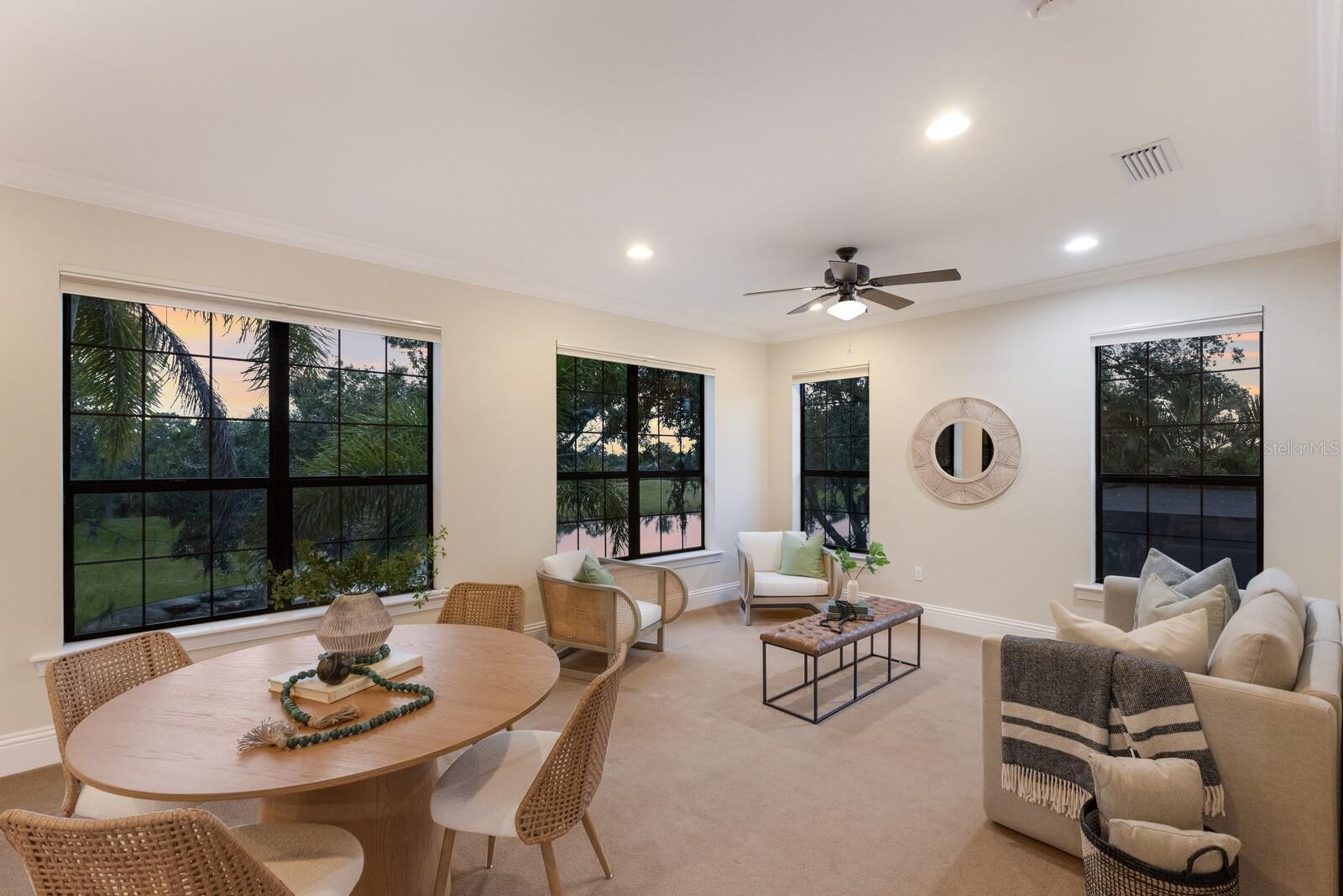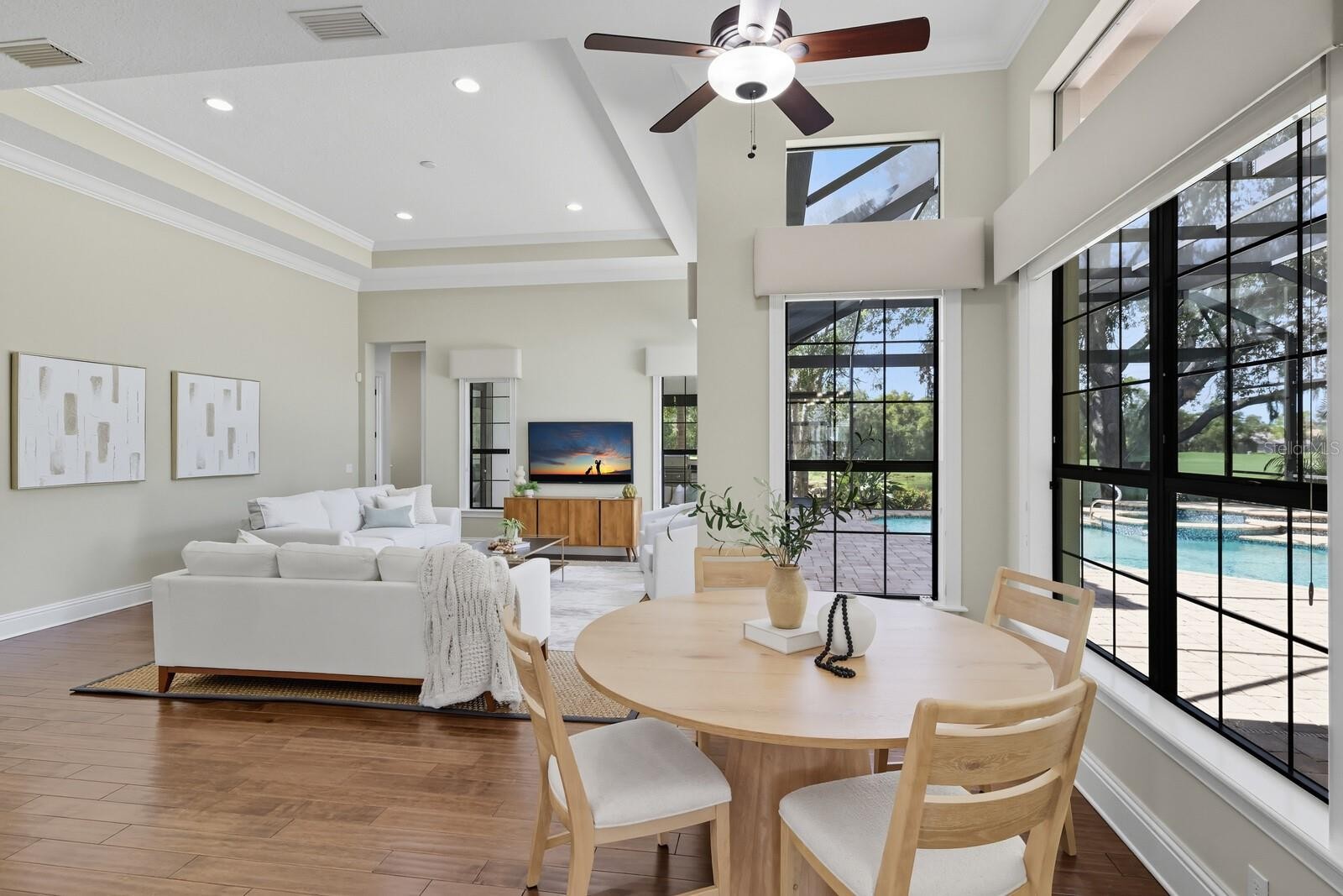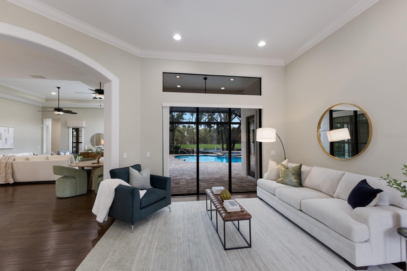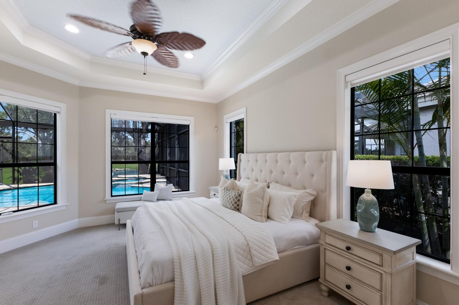 Savor one of the most breathtaking lake, golf, and preserve settings in Lakewood Ranch from this beautifully appointed Westover II model nestled in a serene, private setting on the King’s Dunes golf course in The Country Club. The light and bright 3,885 square foot residence custom built by Neal Signature Homes boasts westerly views showcasing perfectly proportioned spaces, exceptional design, newly painted interior and exterior, volume ceilings, engineered wood flooring, and stunning sunsets nightly. The recently installed new panoramic screened lanai cage further accentuates the outdoor living experience, along with the heated pebble tec pool/spa with sun shelf, two separate covered areas, gas fireplace and an outdoor Summer kitchen. The surrounding vistas bring the unmatched optic experience indoors seamlessly via sliding glass doors and a plethora of transom windows, with architectural details and designer touches throughout, including tray ceilings, crown moldings, and trimmings at every turn. An invitingly large great room open to the kitchen where form, function and design reigns cohesively with sprawling granite counters, wood cabinetry, high performance appliances, breakfast bar, a walk-in pantry, and a breakfast nook area adorned with the surrounding views beyond. Off the kitchen is a butler’s pantry with a wine fridge connecting to a lovely formal dining area and equally elegant living room infused with natural light. Unwind in the owner’s retreat positioned on its own private wing on the main level, offering two walk-in customized closets and a luxuriously appointed spa-like bath with separate vanity stations, stand-alone shower, and a free-standing soaking tub. Family and overnight visitors alike will be right at home with the three additional guest rooms , two on the main level anchored by a full bath, while a third guest room is located upstairs off the home’s fourth full bath. On the upper level, there is also an expansive bonus room offering multiple flex living space options boasting some of the most incredible golf views in Lakewood Ranch. Other notable highlights of this all-encompassing 5,351 square foot four bedroom four full bath maintenance free residence includes a perfectly located main level office/den at the rear of the residence with picturesque views just off the pool bath, a generously sized laundry room with sink and cabinetry, hurricane shutters, and an oversized 3-car garage. Within the #1 top-selling master-planned community known for its vibrant lifestyle, dining, shopping, A-rated schools and non-mandatory membership opportunities to become a member of Lakewood Ranch Golf & Country Club, which include four 18-hole championship golf courses, tennis, state-of-the-art Fitness center, clubhouses, junior Olympic-sized pool, pickleball and more.