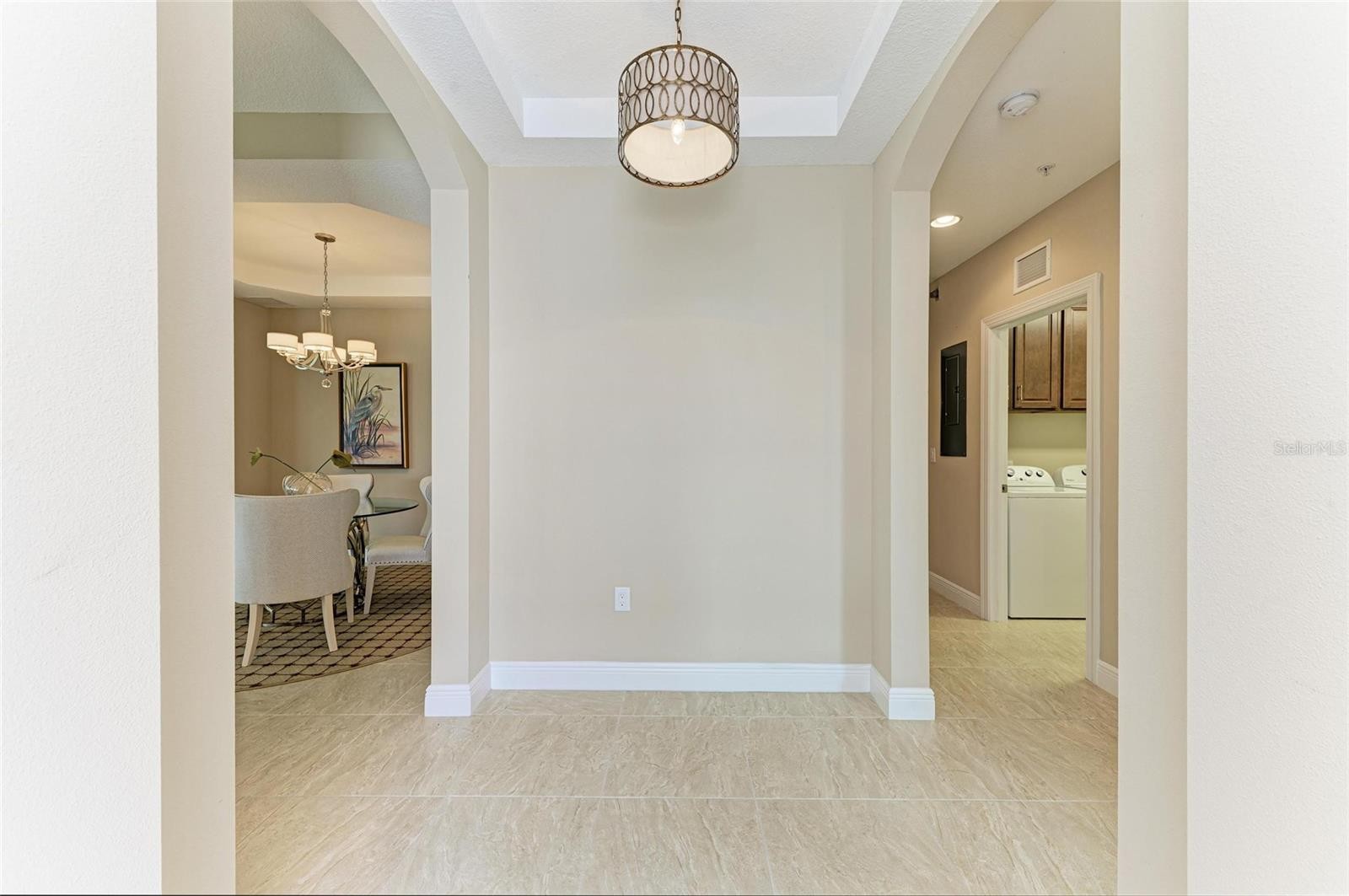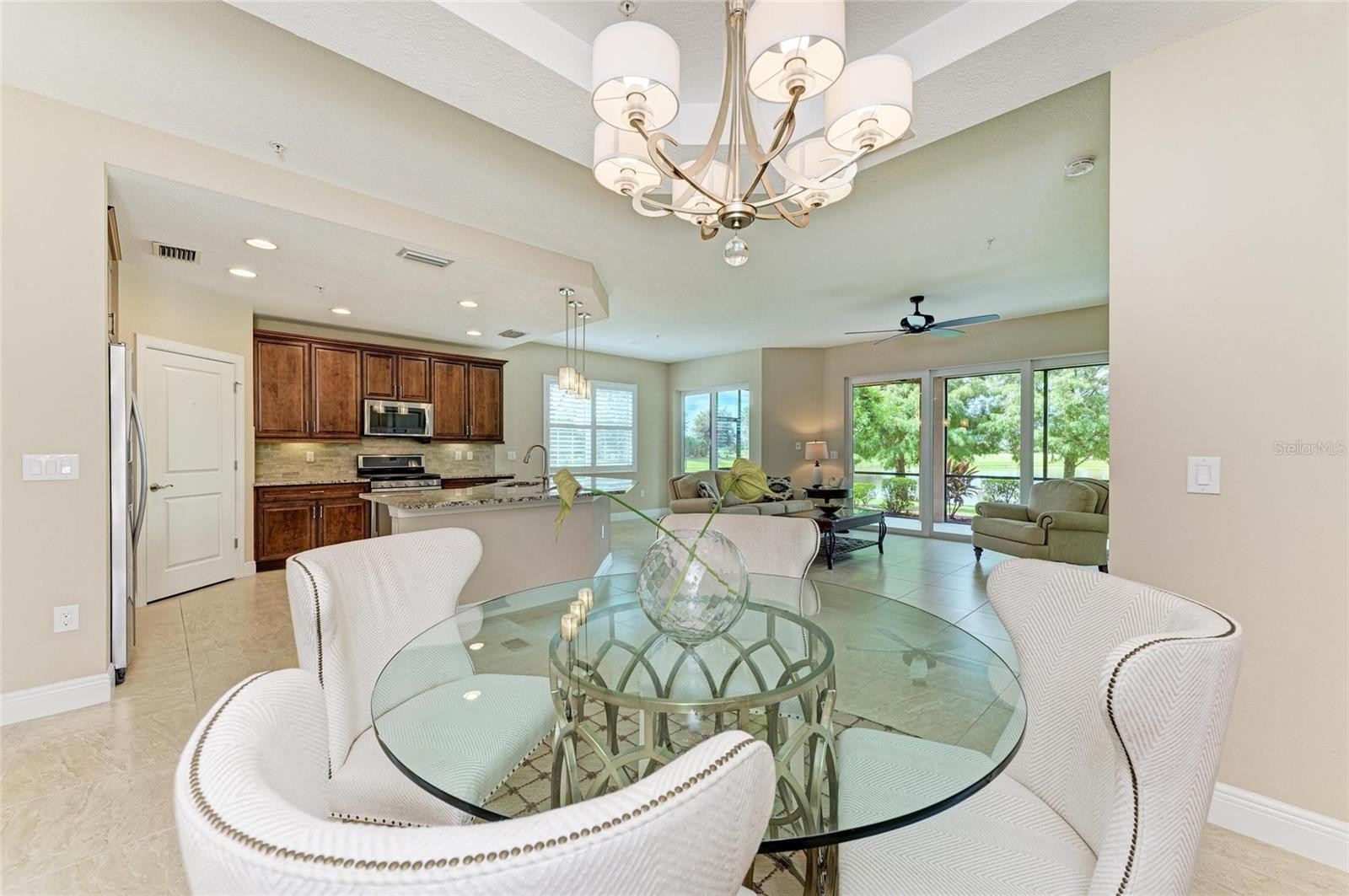 Welcome to refined living in the prestigious gated golf community of Country Club East at Lakewood Ranch, where timeless elegance meets modern convenience. This immaculate three-bedroom, two-bathroom end-unit condo offers a rare combination of privacy, upscale finishes, and effortless access to world-class amenities. Situated on the ground floor and framed by a tranquil water view, this residence delivers the serene Florida lifestyle that discerning buyers seek. From the moment you step inside, the thoughtful upgrades and design details are evident. The kitchen is the true heart of the home, featuring upgraded cabinetry with crown molding, under-cabinet lighting, and convenient pullout drawers. Solid-surface countertops and stainless-steel appliances create a seamless balance of style and function, while the open layout connects effortlessly to the great room, breakfast nook, and dining area. Ceiling details in the kitchen, dining room, and primary suite add a touch of architectural sophistication that elevates every gathering. The primary suite is a private retreat, complete with a spa-inspired bathroom showcasing raised cabinetry with additional storage, luxury plumbing fixtures, upgraded lighting, a full-width mirror, and a spacious walk-in shower. Secondary bedrooms are well-sized for guests or a home office, ensuring flexibility for today’s lifestyle. A large utility room with upgraded cabinetry, a laundry sink, and a premium washer and dryer adds everyday convenience. Perfect for year-round indoor-outdoor living, the expansive covered and screened lanai is ideal for morning coffee, quiet evenings, or entertaining friends while enjoying the pond’s scenic backdrop. A two-car garage provides additional storage and peace of mind. Just a short walk from your front door, The Lodge serves as the community’s social hub, complete with a full bar and restaurant and tennis courts. Residents can have access to state-of-the-art fitness center, and a resort-style swimming pool. Within minutes, residents enjoy everything Lakewood Ranch is celebrated for: vibrant downtown dining and entertainment, boutique shopping, medical facilities, top-rated schools, and convenient access to I-75. For those seeking culture and leisure, Downtown Sarasota is a short drive away, offering theaters, art galleries, and fine dining. And when it’s time to unwind by the water, the world-renowned Gulf beaches—including Siesta Key, Lido Key, and Anna Maria Island—await less than 35 minutes from home. Whether as a full-time residence or a seasonal retreat, this condo provides the ideal blend of comfort, luxury, and location. Every detail has been carefully curated to create a residence that lives as beautifully as it looks. Discover the best of Lakewood Ranch living in this exceptional Country Club East condo—where elegance, amenities, and lifestyle come together in perfect harmony.