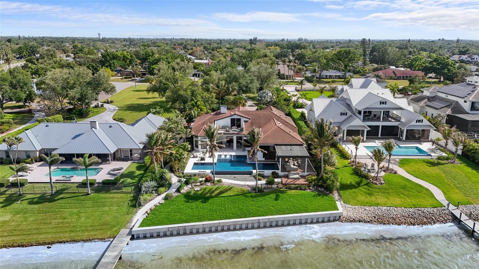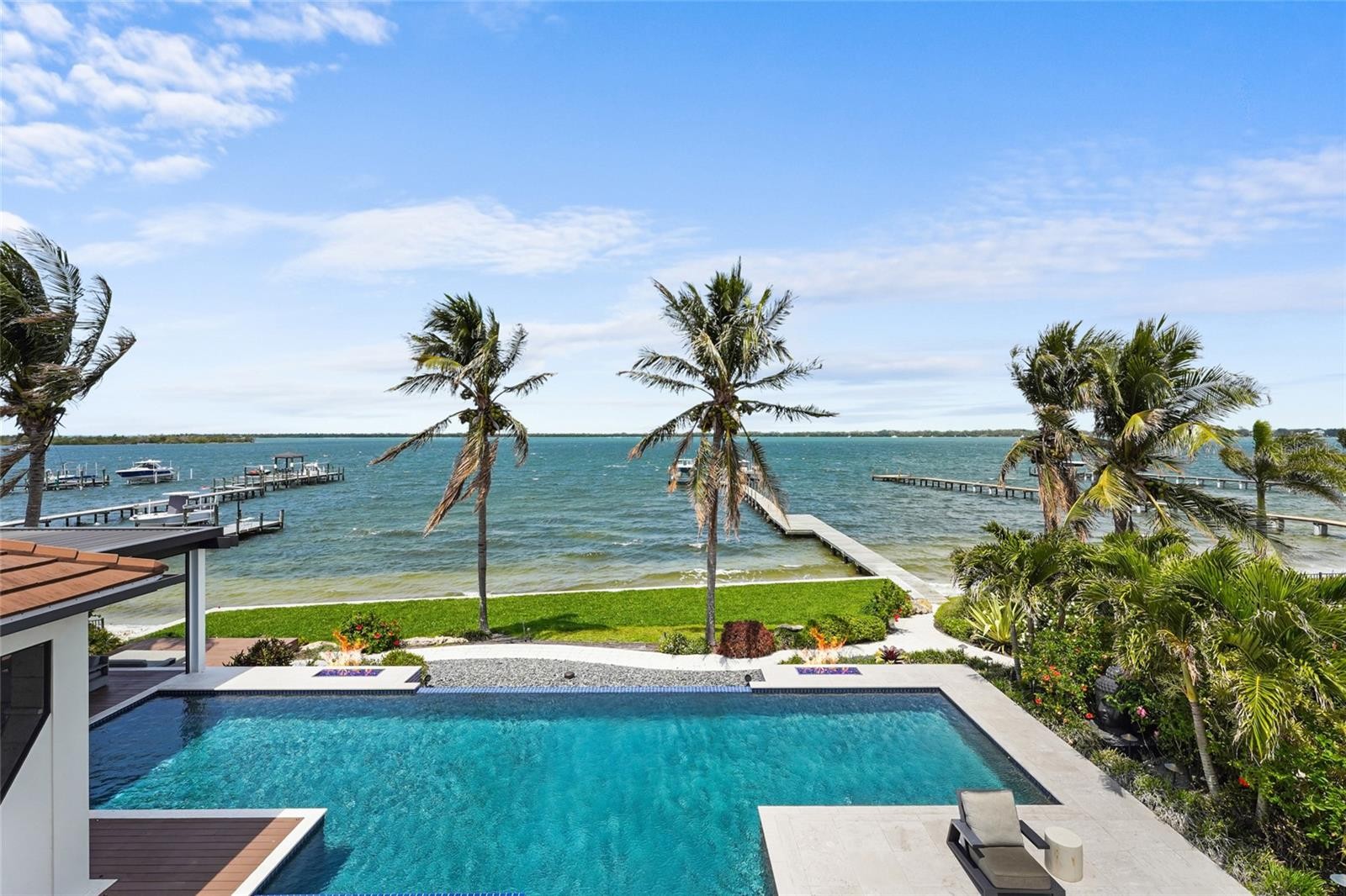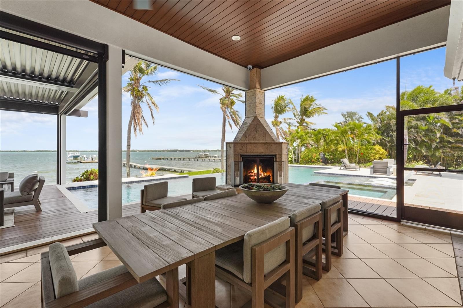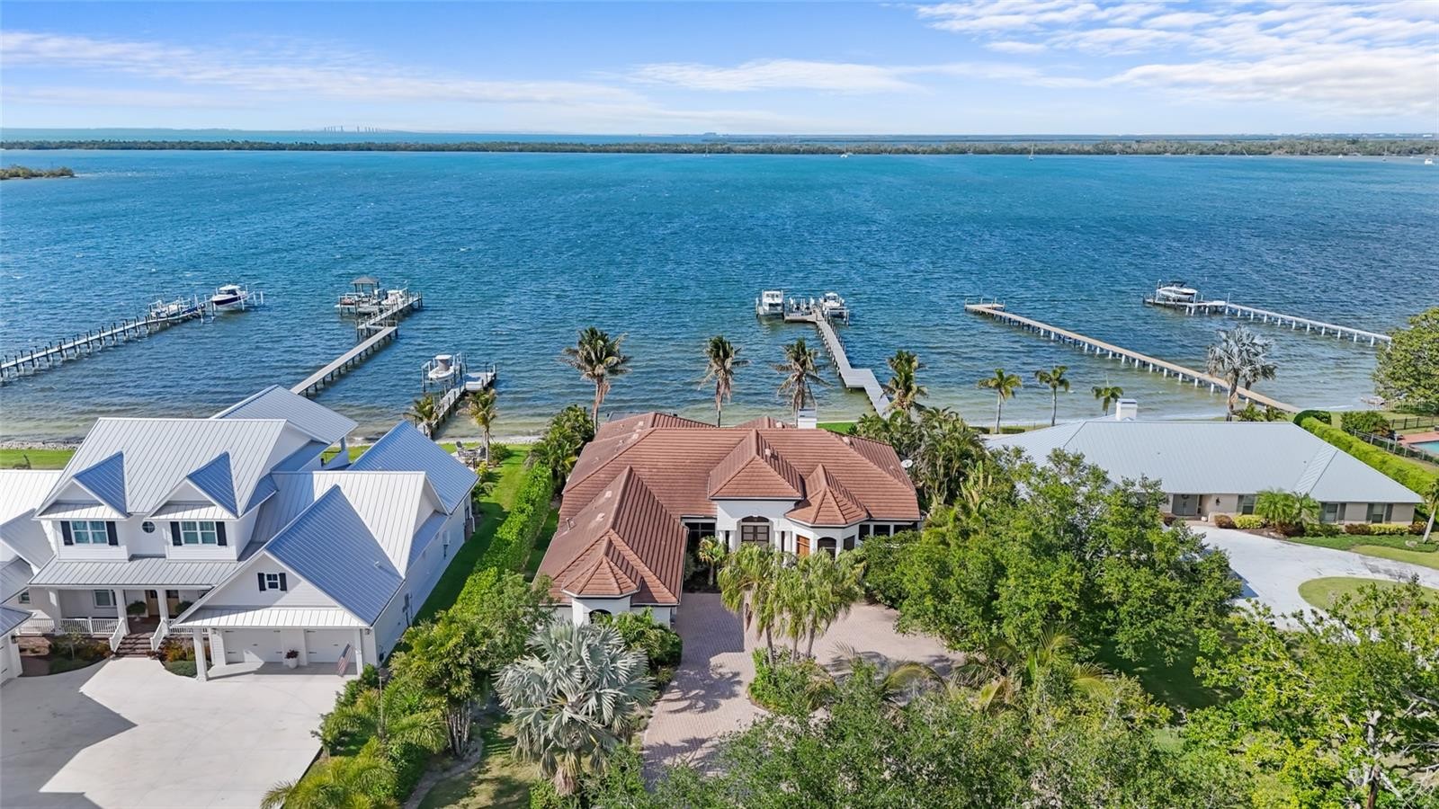 A rare waterfront estate along the Manatee River. Set on a private homesite with expansive water views stretching toward the Skyway Bridge, this property offers a unique combination of land, water frontage, and open water views. From sunrise reflecting across the river to evening sunsets along the horizon, the setting is centered around the water. The first floor is designed for a seamless blend of living and entertaining, featuring a primary suite with water views and a spa-like en-suite bathroom with a walk-in shower overlooking tropical greenery and a soaking tub positioned near large windows. Two additional bedrooms and two and a half bathrooms complete the level. Formal living and dining spaces—including a dining room with wine wall, a living room with fireplace, and a custom study with rich wood built-ins and West Indies-inspired architectural detailing—flow effortlessly into an expansive family room overlooking the water. At the center of the home, a high-end kitchen anchors the living space, opening to the main areas where walls of glass frame the water beyond and create a natural gathering point.Upstairs, a loft-style en-suite retreat offers a sense of privacy and flexibility, complete with custom wall cabinetry, a full bathroom, walk-in closet, and access to a private balcony with water views—well suited for guests or additional living space. Outdoor living is thoughtfully arranged to maximize the waterfront setting. A covered patio features an outdoor kitchen and grilling area, complemented by an outdoor shower. Just beyond, the infinity-edge pool and integrated spa are positioned along the water’s edge, creating a seamless visual connection to the water. A sun shelf and generous deck space provide multiple areas for lounging and entertaining, all oriented toward the expansive views. For boating enthusiasts, a deep-water dock with T-head platform, 16,000-pound boat lift, and jet ski lift extends into open water with access to Tampa Bay and the Gulf of Mexico. A new seawall lines the waterfront. The approach is enhanced by an extended pavered driveway with multiple parking areas, complemented by a three-car garage, providing generous space for vehicles and guest arrivals. The home has been extensively updated, including a new roof, generator, well system, HVAC components, hurricane-rated window and transom installation, refinished and expanded outdoor living areas with updated lighting and landscaping, and a renovated outdoor shower. Interior improvements include new flooring, custom built-ins, renovated bathrooms, upgraded closet systems, and smooth-finish walls throughout, along with refined design details. Located near Robinson Preserve, De Soto National Memorial, the property offers convenient access to trails, kayaking, preserved land, and local markets. Gulf beaches, including Anna Maria Island and Longboat Key, are approximately 6–8 miles away, providing easy access to coastal destinations while maintaining a private residential setting.