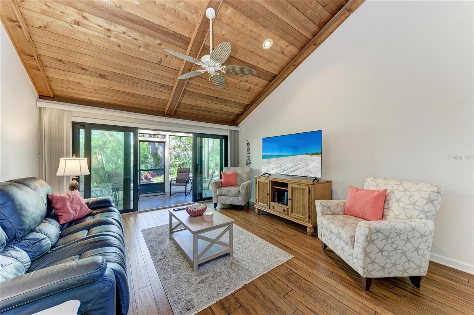Just minutes from the beaches of Anna Maria Island, this stunning end-unit villa is located in the highly desirable Pine Bay Forest community and offers exceptional privacy, natural light, and tranquil views. Enjoy peaceful mornings and unforgettable sunsets from the screened lanai, overlooking lush tropical landscaping and serene surroundings—an ideal setting for relaxing or entertaining. This immaculate 3-bedroom, 2-bath residence features all new windows(2024), the sought-after Hearthstone floor plan and is located in an X flood zone, where flooding is unlikely. The property was unaffected by recent hurricanes, with no flooding or damage. Upon entry, gleaming hardwood floors and vaulted cedar ceilings in the spacious Great Room create a bright, airy atmosphere that flows seamlessly into the lanai, highlighting the home’s indoor-outdoor living. The split floor plan provides privacy for owners and guests, while the updated kitchen offers wood cabinetry and granite countertops with ample space for daily living or hosting. The generous primary suite features his-and-hers walk-in closets, direct access to the lanai, and an en-suite bathroom with dual sinks. Additional highlights include a dedicated laundry room with washer, dryer, and extra storage. Residents of Pine Bay Forest enjoy resort-style amenities, including a private heated pool with spa, saunas, showers, and restrooms, as well as a regulation tennis court and shuffleboard. Take an evening stroll to the community overlook and experience breathtaking sunset views over Palma Sola Bay and Anna Maria Island. Offered furnished, this villa is perfectly suited as a primary residence, seasonal getaway, or low-maintenance Florida retreat in an unbeatable coastal location. **Note: Property Information received from third-party sources is considered reliable but not guaranteed. All Information should be independently verified by buyers and buyers agent.
