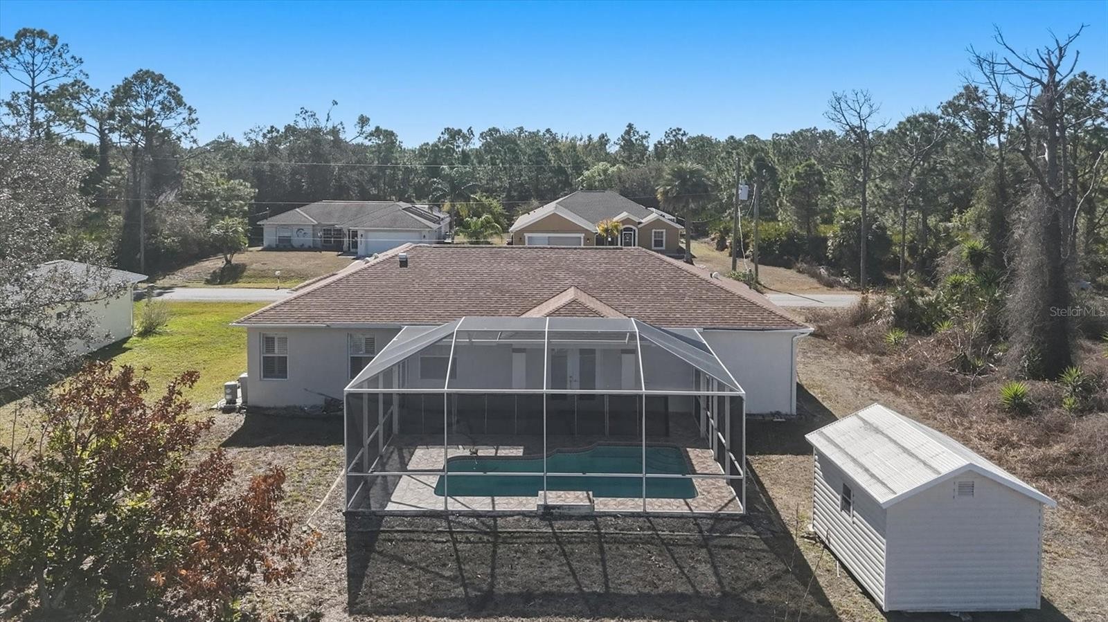 This beautifully maintained 4-bedroom, 2-bath home offers 1,827 square feet of comfortable living space with a desirable split floor plan. Featuring high ceilings and fresh interior and exterior paint, the home feels bright and inviting throughout. The open kitchen flows seamlessly into the main living areas and includes a cozy breakfast nook perfect for casual dining. Step outside to enjoy the screened-in pool, ideal for relaxing or entertaining year-round. Additional highlights include a spacious 2-car garage and a large shed providing plenty of storage space.