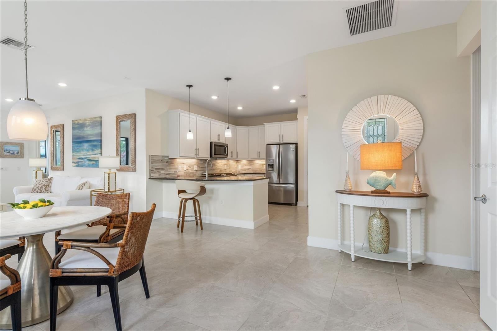 Move right into this stunning, spacious, clean, open and bright maintenance-free, 2 bedroom 2 bathroom extended Capri III model. This absolutely gorgeous home has many updates and so much to offer!!! To begin, the kitchen and bathrooms feature updated gorgeous Cambria quartz countertops. There is tile flooring throughout the entire home. The kitchen is perfectly positioned for entertaining overlooking the great room, dining room, extended family room with sliding glass doors that lead to your very private screened lanai and a beautifully landscaped backyard perfect for family cookouts. The split bedroom arrangement offers two master suites, walk-in closets, updated bathroom countertops, and under-counter lighting. Just when you think this beauty cannot be more perfect, you will find hurricane shutters, a central vacuum, and a freshly painted interior!! Village Walk is one of Sarasota's premier resort-style communities offering a 24-hour guarded gate, 2 geo-thermal heated and cooled pools (lagoon and lap), 6 Har-Tru tennis courts, clubhouse, state-of-the-art fitness center, 2 pickleball courts, and miles of walking/biking trails. In The Town Center you will find a cafe, card room, library, ballroom, arts and crafts studio, gas station, hair salon/barber shop, post office, and a gift shop/boutique! Village Walk is one of the best-managed communities in Palmer Ranch, and also has among the lowest HOA fees! Such a wonderful location, just minutes to shopping, restaurants, the Legacy Bike Trail, A-rated schools, fantastic golf courses, and Sarasota's famous Siesta Key Beach as well as quiet Nokomis Beach on South Casey Key! What a fun, healthy, affordable neighborhood, so conveniently located, that has all this to offer!!