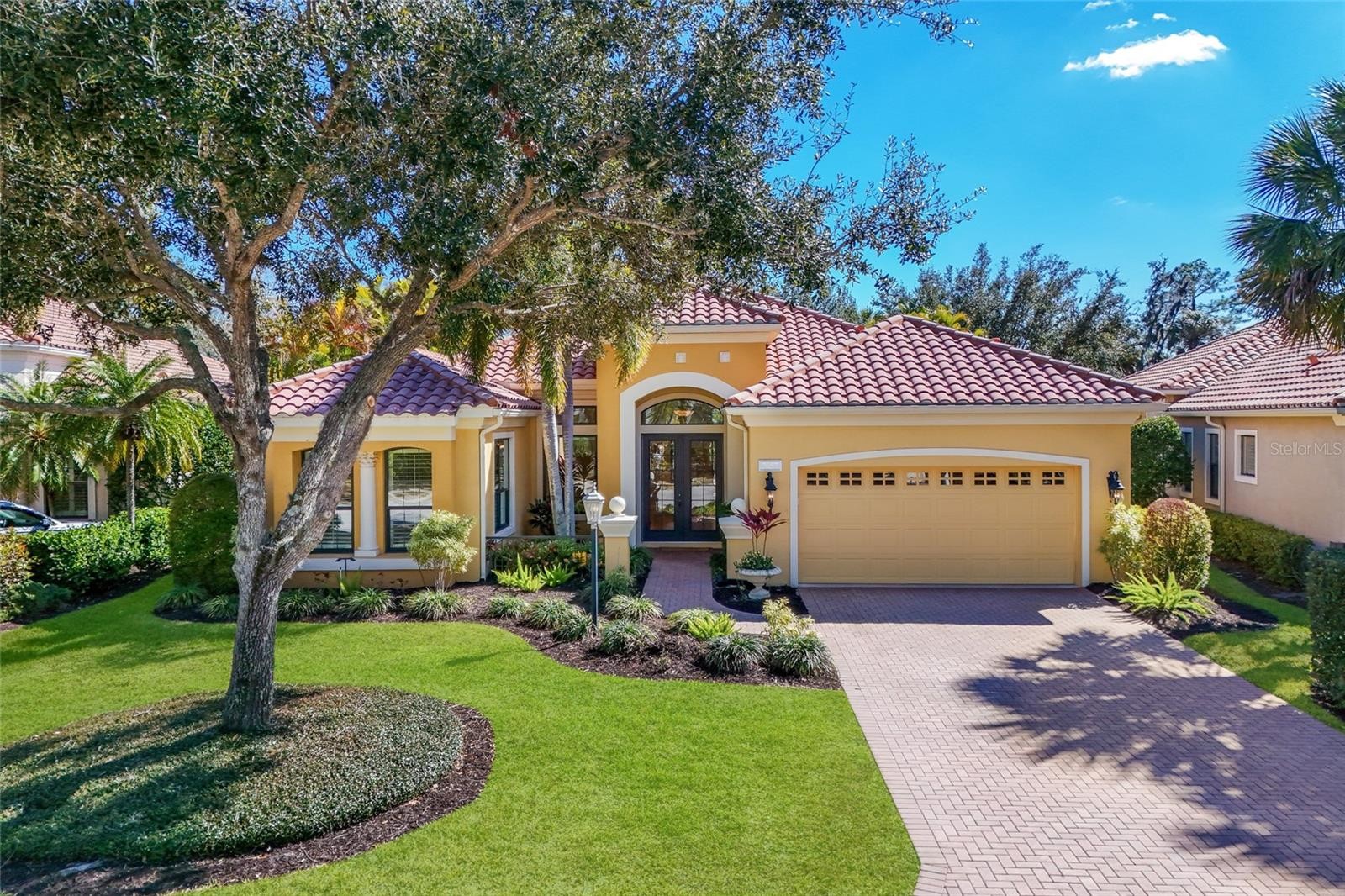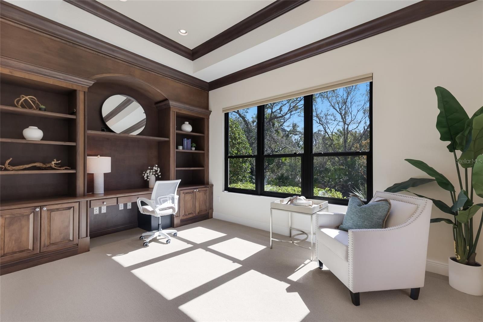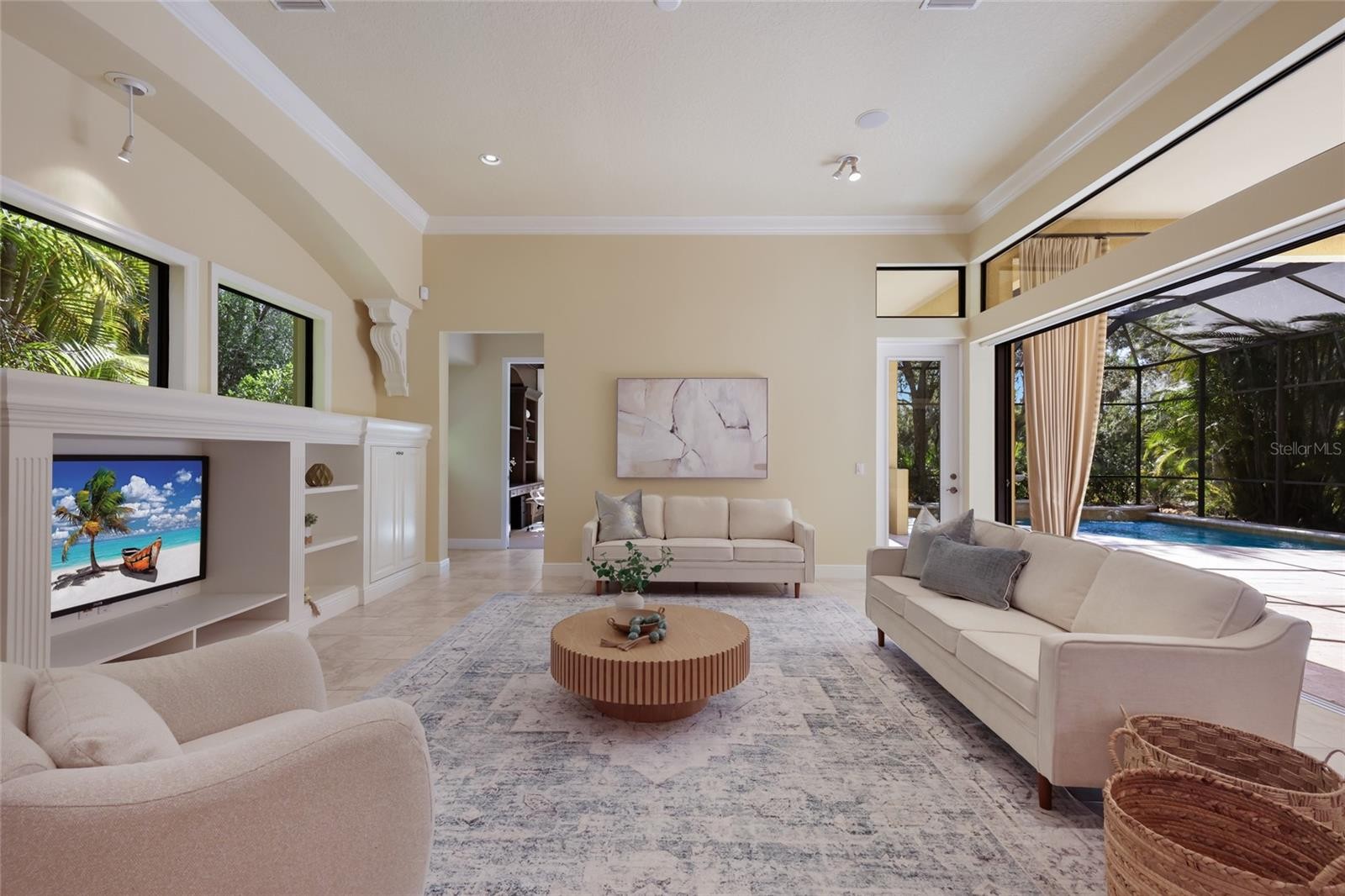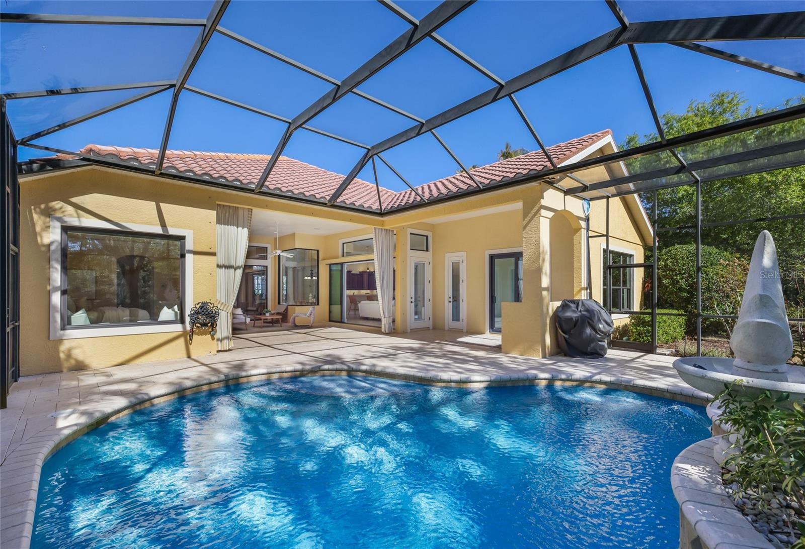 Under contract-accepting backup offers. Situated on a lushly private and open south-facing preserve setting in The Country Club of Lakewood Ranch, this one-story three bedroom plus den residence showcases elegant architectural detailing throughout, volume coffered designer ceilings, a combination of IMPACT windows/sliders and hurricane protection throughout, and even a GENERATOR. Enlarged by four feet from Neal Signature’s original Salerno floor plan offering 2,805 square feet of one-story living with an inviting lanai, abundant under cover entertainment spaces, a large heated pool, travertine decking, and pre-plumbed for an outdoor kitchen. Seamlessly connecting this resort-styled lanai to the oversized great room, living room, kitchen and den are glass doors that reveal a large open living concept with voluminous designer ceilings, large scale windows, crown moldings, corinthian columns and built-in details. Chefs will delight in the well appointed kitchen with sprawling counters, wood cabinetry, stainless steel appliances, wine fridge, a large walk-in pantry, an oversized breakfast nook area, and a light-filled formal dining room. Relax and unwind in the elegant owner’s retreat offering two walk-in closets, direct lanai access, wood flooring, remote window coverings, and a spa-like bath with a dual sink vanity, large soaking tub, invigorating shower and separate water closet. Guests will be right at home in this split bedroom floorplan with two additional guest suites with plantation shutters, newly installed carpeting, and centered by a full bath. Additionally this fine residence offers a privately situated den with built-in office, double tray ceilings, plantation shutters, and the home’s third full bath strategically positioned with direct access off lanai doubling as the home’s pool bath. Other notable highlights of this all encompassing 3,773 total square foot residence in the gated and maintenance-included enclave of Silverwood includes, GENERATOR, a combination of hurricane enclosures and impact windows/slider, 2024 and 2019 AC units, a large laundry room with sink and cabinetry, 8’ interior doors, a 2024 pool heater, and a two-car garage. Within the #1 top-selling master-planned community Lakewood Ranch, known for its vibrant lifestyle and proximity to dining, shopping, polo, community events, etc. PLUS non-mandatory membership opportunities to become a member of Lakewood Ranch Golf & Country Club, which include four 18-hole championship golf courses, tennis, state-of-the-art Fitness center, clubhouses, junior Olympic-sized pool, pickleball and more.