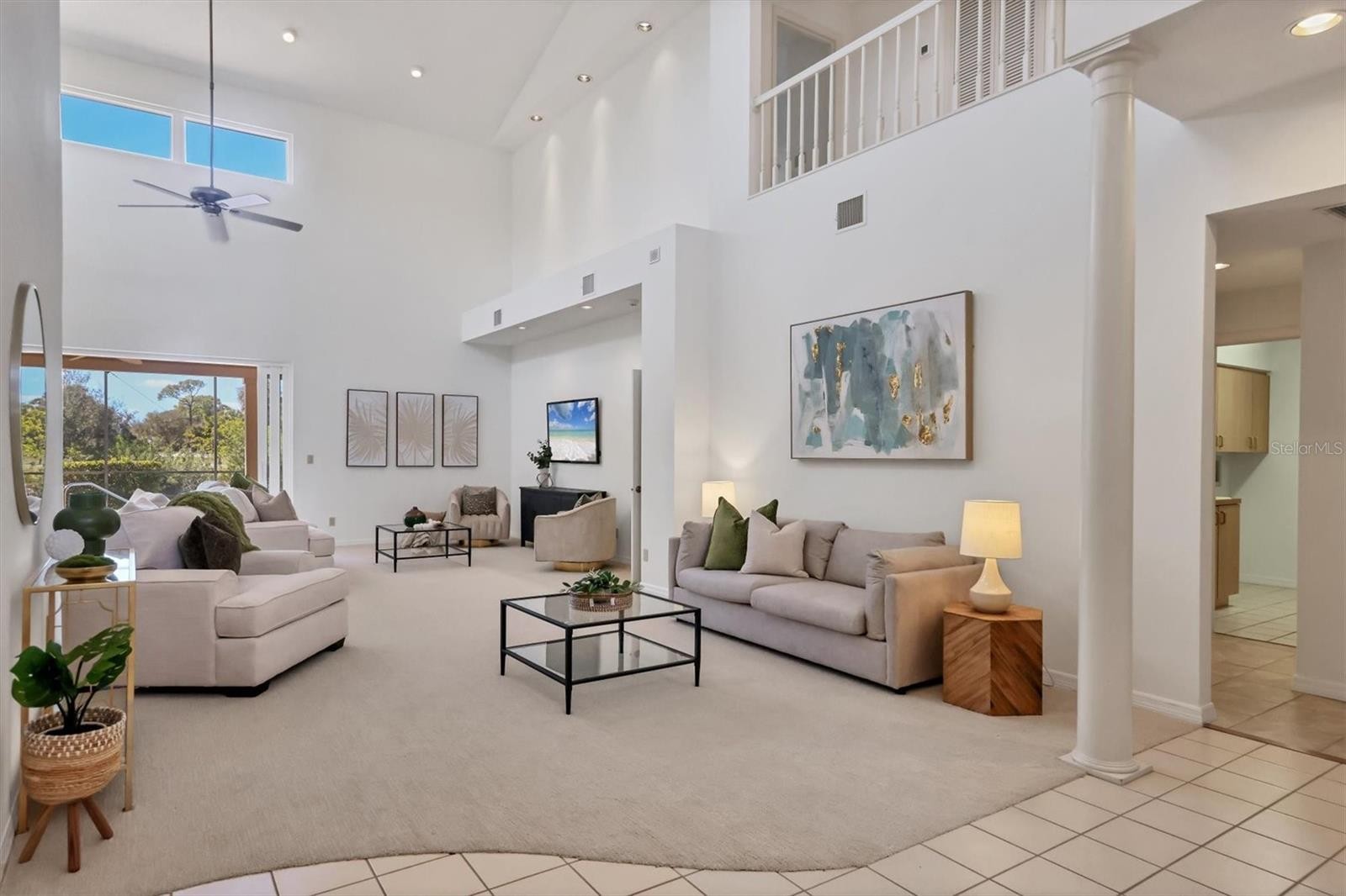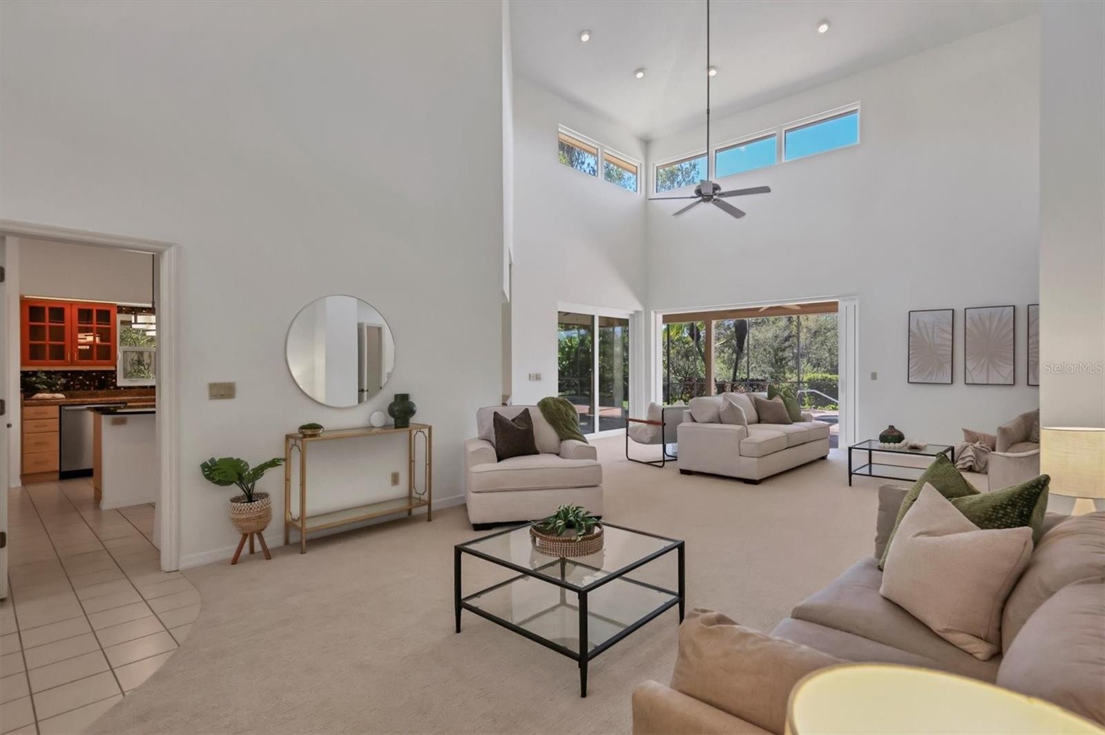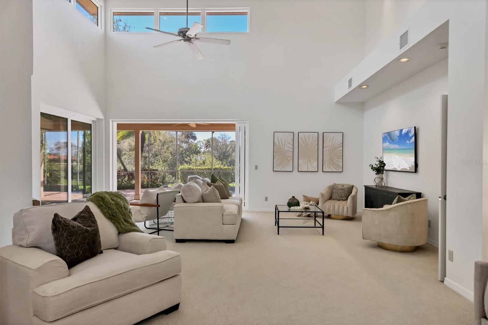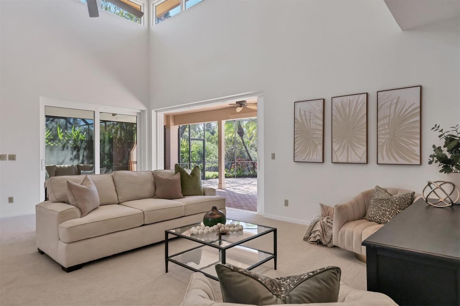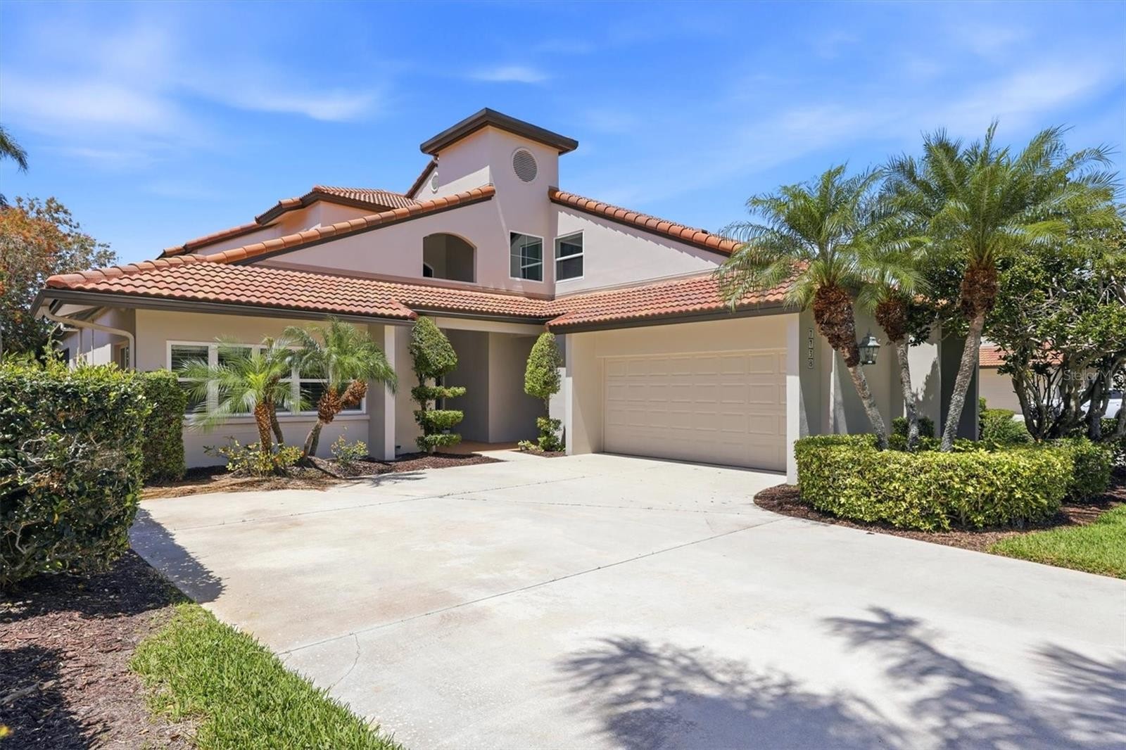 Experience the ease of refined living in this beautiful La Vista single-family villa, nestled within one of Prestancia’s most sought-after maintenance-free enclaves. Perfectly situated within walking distance of the TPC Clubhouse, this residence offers an ideal blend of comfort, elegance, and convenience. Recently refreshed with new interior paint and carpeting, the home exudes understated sophistication and provides an inviting canvas for your personal style. Soaring vaulted ceilings and expansive windows fill the interiors with natural light, creating a warm and open ambiance—ideal for showcasing art and entertaining in effortless style. The spacious living room flows seamlessly to the outdoors through pocketing sliding glass doors that open to an L-shaped covered patio and screened lanai—perfect for enjoying Florida’s signature indoor-outdoor lifestyle. The thoughtfully designed kitchen features a large center island with seating, abundant counter space, wall oven and microwave with warming drawer, dual sinks, and a charming breakfast nook surrounded by sliding glass doors. A formal dining room offers an elegant space for gatherings and celebrations. The primary suite serves as a tranquil retreat with direct lanai access, plantation shutters, a generous closet, and a spa-inspired bath with dual vanities, a soaking tub, and a glass-enclosed shower. A guest suite with a private bath, a powder room, and a laundry room complete the main level. Upstairs, two additional bedrooms share a full bath—each offering privacy and ample closet space. Hurricane-impact glass throughout provides comfort and peace of mind. The lanai is an outdoor sanctuary featuring both covered and open seating areas, a sparkling solar-heated pool, and serene views that encompass a lush preserve, peaceful water, and TPC Prestancia’s 18th fairway beyond. Residents of Prestancia enjoy 24-hour guard-gated security, beautifully manicured grounds, and the option to join the prestigious TPC Prestancia Golf Club—home to two championship 18-hole courses and a vibrant social community. Ideally located near Siesta Key’s world-renowned beaches, The Legacy Trail, and Sarasota’s acclaimed shopping, dining, and arts scene. Discover the best of Florida living in this lovely home and community—you won’t be disappointed.