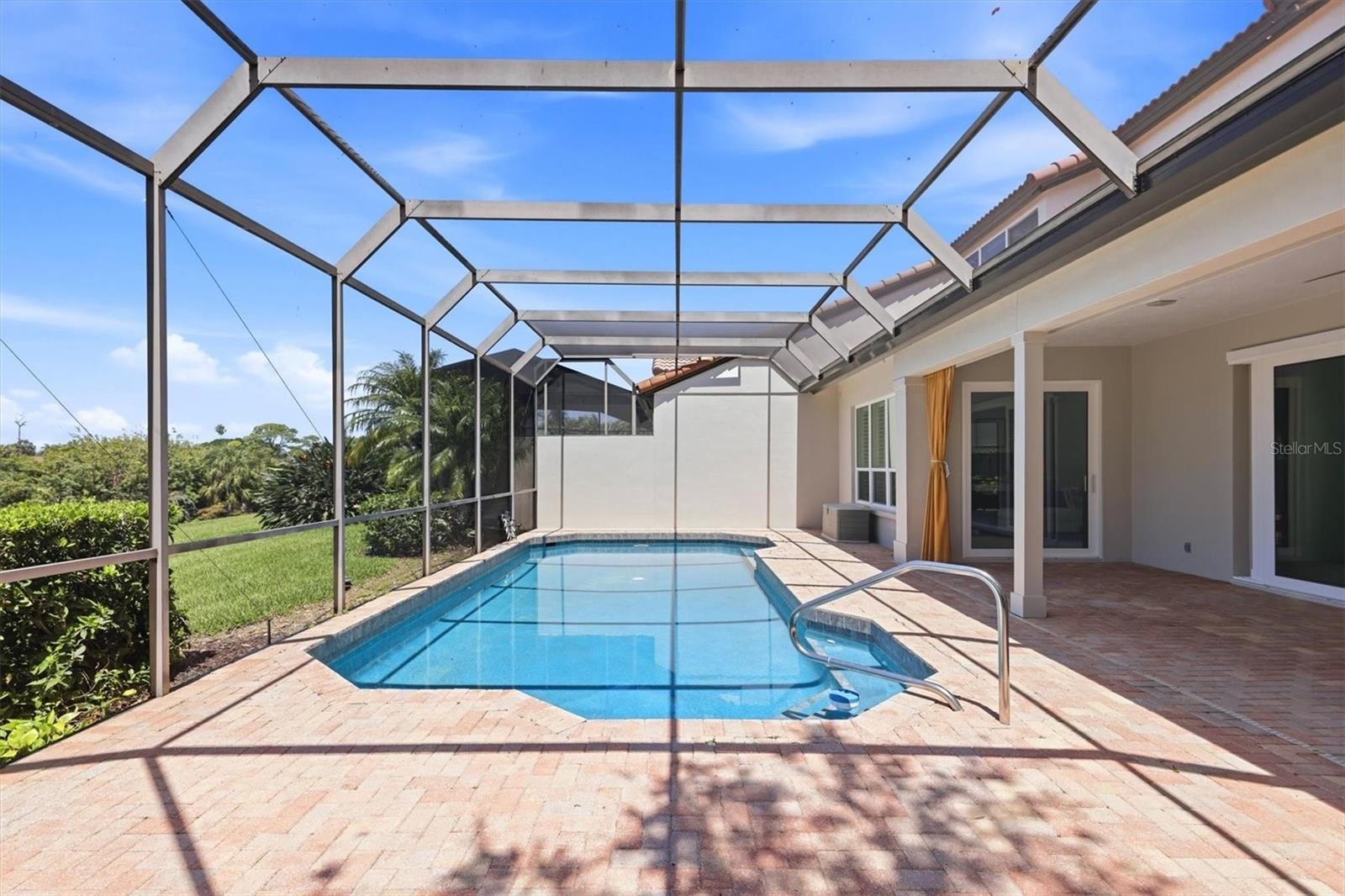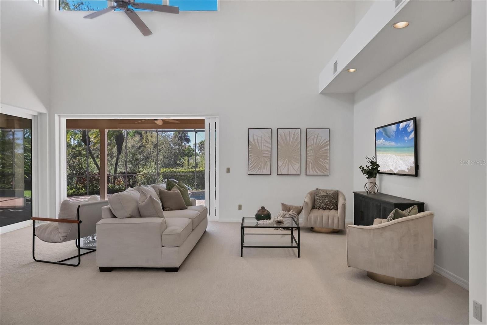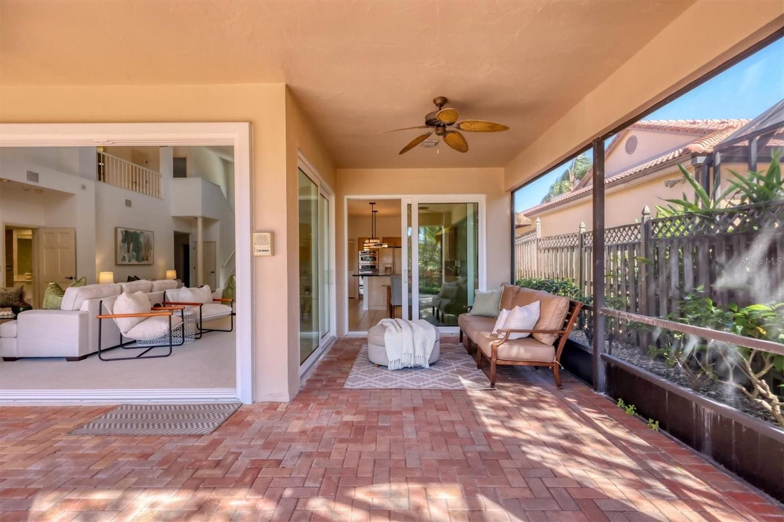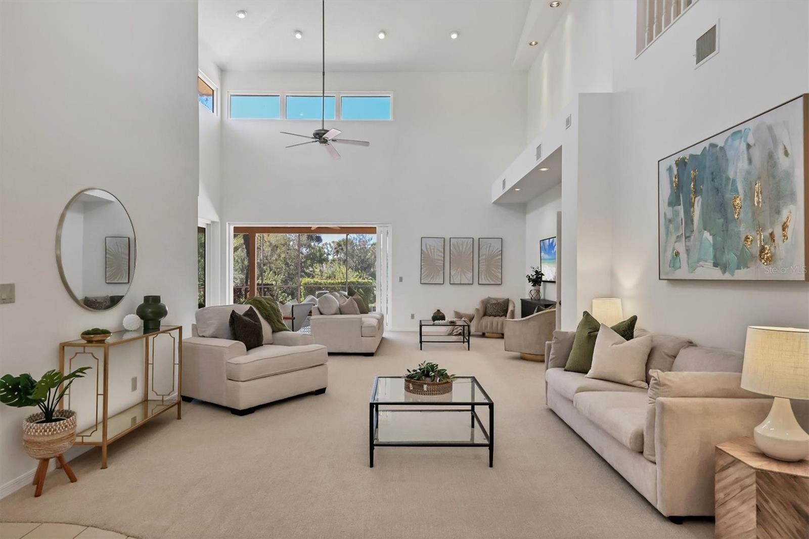 Experience the ease of refined living in this beautiful La Vista single-family villa, nestled within one of Prestancia’s most sought-after maintenance-free enclaves. Perfectly situated within walking distance of the TPC Clubhouse, this residence offers an ideal blend of comfort, elegance, and convenience. Recently refreshed with new interior paint and carpeting, the home exudes understated sophistication and provides an inviting canvas for your personal style. Soaring vaulted ceilings and expansive windows fill the interiors with natural light, creating a warm and open ambiance—ideal for showcasing art and entertaining in effortless style. The spacious living room flows seamlessly to the outdoors through pocketing sliding glass doors that open to an L-shaped covered patio and screened lanai—perfect for enjoying Florida’s signature indoor-outdoor lifestyle. The thoughtfully designed kitchen features a large center island with seating, abundant counter space, wall oven and microwave with warming drawer, dual sinks, and a charming breakfast nook surrounded by sliding glass doors. A formal dining room offers an elegant space for gatherings and celebrations. The primary suite serves as a tranquil retreat with direct lanai access, plantation shutters, a generous closet, and a spa-inspired bath with dual vanities, a soaking tub, and a glass-enclosed shower. A guest suite with a private bath, a powder room, and a laundry room complete the main level. Upstairs, two additional bedrooms share a full bath—each offering privacy and ample closet space. Hurricane-impact glass throughout provides comfort and peace of mind. The lanai is an outdoor sanctuary featuring both covered and open seating areas, a sparkling solar-heated pool, and serene views that encompass a lush preserve, peaceful water, and TPC Prestancia’s 18th fairway beyond. Residents of Prestancia enjoy 24-hour guard-gated security, beautifully manicured grounds, and the option to join the prestigious TPC Prestancia Golf Club—home to two championship 18-hole courses and a vibrant social community. Ideally located near Siesta Key’s world-renowned beaches, The Legacy Trail, and Sarasota’s acclaimed shopping, dining, and arts scene. Discover the best of Florida living in this lovely home and community—you won’t be disappointed.
