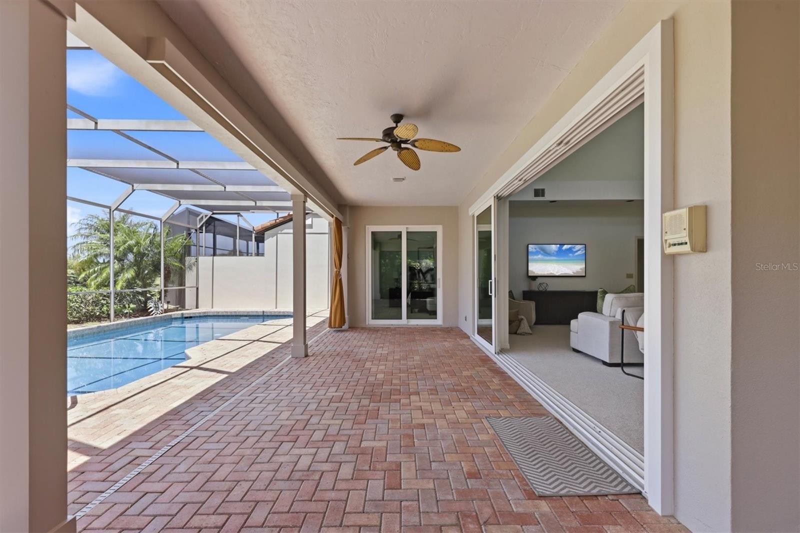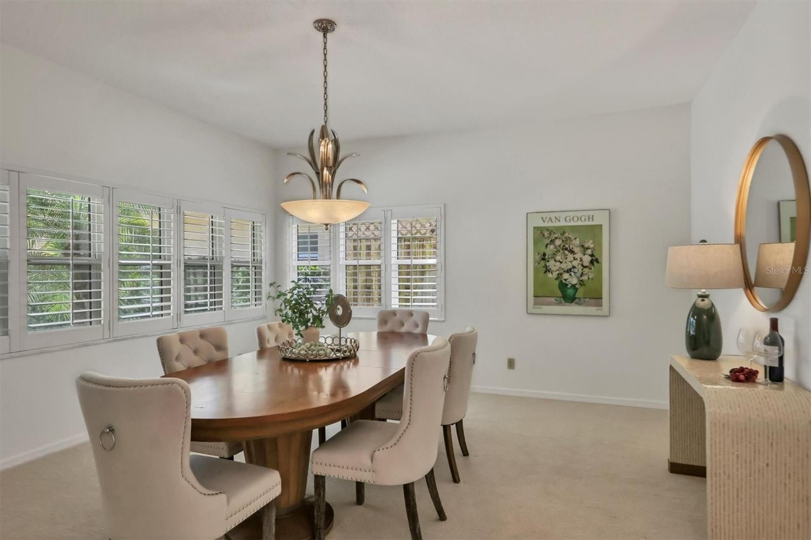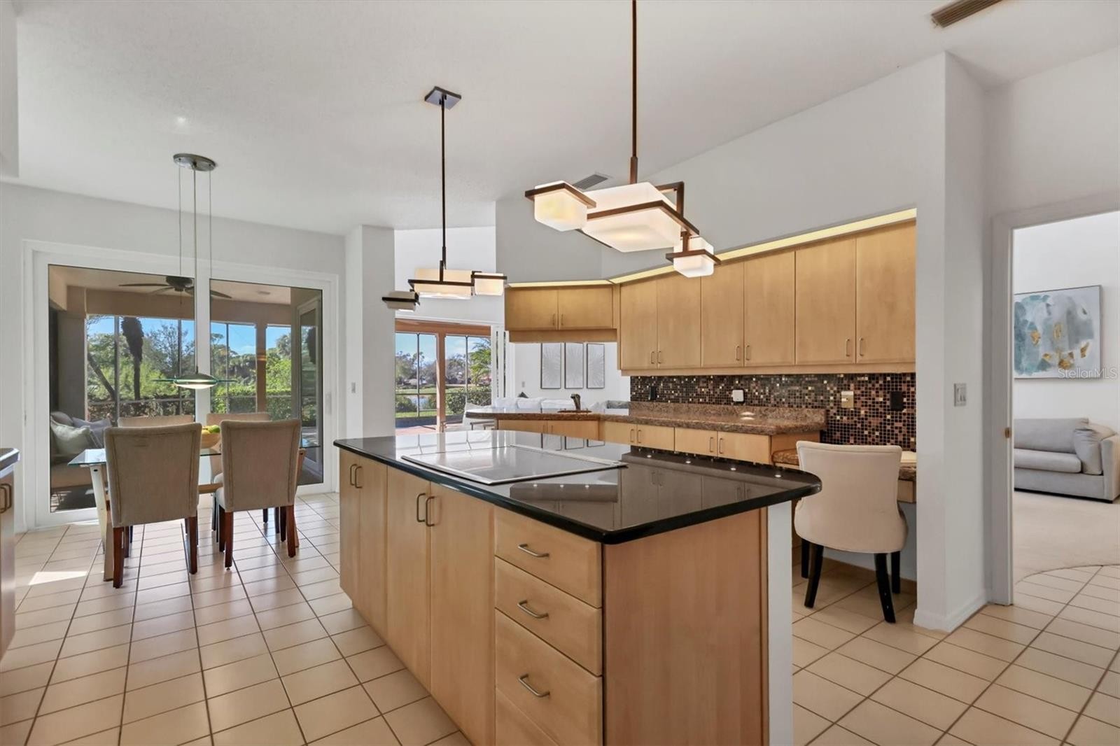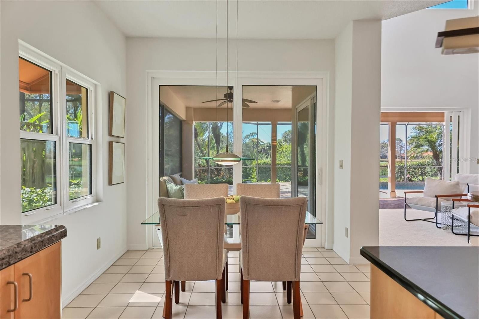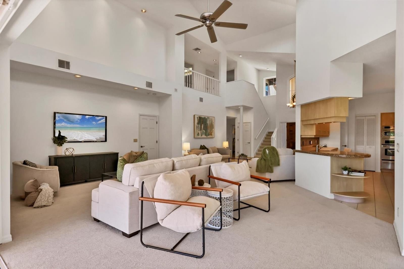 Experience the ease of refined living in this beautiful La Vista single-family villa, nestled within one of Prestancia’s most sought-after maintenance-free enclaves. Perfectly situated within walking distance of the TPC Clubhouse, this residence offers an ideal blend of comfort, elegance, and convenience. Recently refreshed with new interior paint and carpeting, the home exudes understated sophistication and provides an inviting canvas for your personal style. Soaring vaulted ceilings and expansive windows fill the interiors with natural light, creating a warm and open ambiance—ideal for showcasing art and entertaining in effortless style. The spacious living room flows seamlessly to the outdoors through pocketing sliding glass doors that open to an L-shaped covered patio and screened lanai—perfect for enjoying Florida’s signature indoor-outdoor lifestyle. The thoughtfully designed kitchen features a large center island with seating, abundant counter space, wall oven and microwave with warming drawer, dual sinks, and a charming breakfast nook surrounded by sliding glass doors. A formal dining room offers an elegant space for gatherings and celebrations. The primary suite serves as a tranquil retreat with direct lanai access, plantation shutters, a generous closet, and a spa-inspired bath with dual vanities, a soaking tub, and a glass-enclosed shower. A guest suite with a private bath, a powder room, and a laundry room complete the main level. Upstairs, two additional bedrooms share a full bath—each offering privacy and ample closet space. Hurricane-impact glass throughout provides comfort and peace of mind. The lanai is an outdoor sanctuary featuring both covered and open seating areas, a sparkling solar-heated pool, and serene views that encompass a lush preserve, peaceful water, and TPC Prestancia’s 18th fairway beyond. Residents of Prestancia enjoy 24-hour guard-gated security, beautifully manicured grounds, and the option to join the prestigious TPC Prestancia Golf Club—home to two championship 18-hole courses and a vibrant social community. Ideally located near Siesta Key’s world-renowned beaches, The Legacy Trail, and Sarasota’s acclaimed shopping, dining, and arts scene. Discover the best of Florida living in this lovely home and community—you won’t be disappointed.