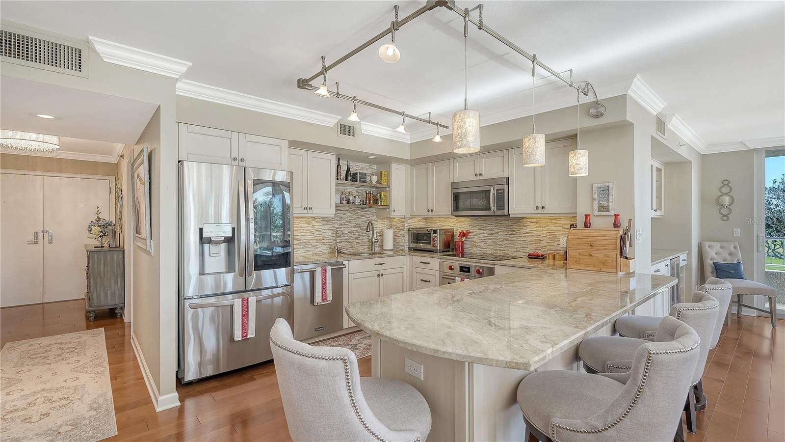 Located behind the gates of the Longboat Key Club, this updated residence at The Beaches of Longboat Key offers a rare blend of golf course views, Gulf proximity, and full-service amenities. Positioned close to the community’s social and recreational features, the home enjoys sun-filled vistas across the Links on Longboat golf course while being just steps from the island’s pristine shoreline. The well-designed interior features an open great room with wood flooring, crown molding, and a built-in wet bar—ideal for entertaining or relaxed everyday living. Sliding glass doors lead to a covered wraparound balcony, creating an effortless indoor-outdoor connection. The kitchen offers stone counters, solid wood cabinetry, high-end stainless-steel appliances, breakfast bar seating, and a layout that flows seamlessly into the living and dining areas. The primary suite includes a walk-in closet and an en-suite bath with dual sinks, stone countertops, and a glass-enclosed shower. A second bedroom is thoughtfully positioned for privacy and features its own en-suite bath with tub/shower combination, making it ideal for guests. Additional highlights include impact-rated windows in each room, split-bedroom layout, and ample storage throughout. This residence includes one under-building garage parking space and a private storage unit. The Beaches offers exceptional amenities, including on-site management, 24-hour concierge and security, updated lobby and corridors, a social room with catering kitchen, game room, 24-hour fitness center, tennis courts, and a resort-style heated pool and spa with expansive pavered deck. A private boardwalk provides direct access to the Gulf’s sandy beaches. Guest parking is abundant, with the entire ground level of the garage dedicated to covered visitor spaces. Ideally located on Longboat Key, residents enjoy immediate access to the Longboat Key Club’s golf and tennis facilities, nearby marinas, and the island’s tranquil coastal lifestyle. St. Armands Circle’s boutiques and dining are minutes away, while downtown Sarasota offers cultural attractions including the Ringling Museum, Van Wezel Performing Arts Hall, Selby Gardens, and waterfront parks—making this an exceptional opportunity to enjoy Gulf-front living with unmatched convenience.