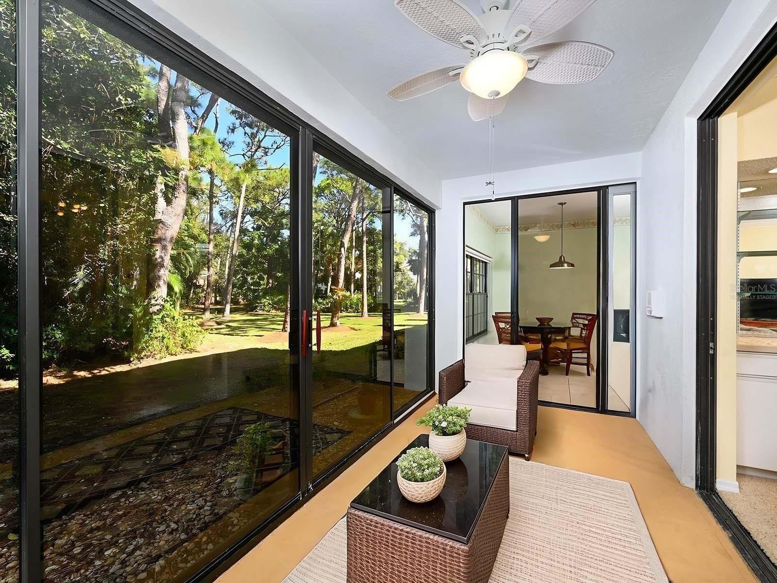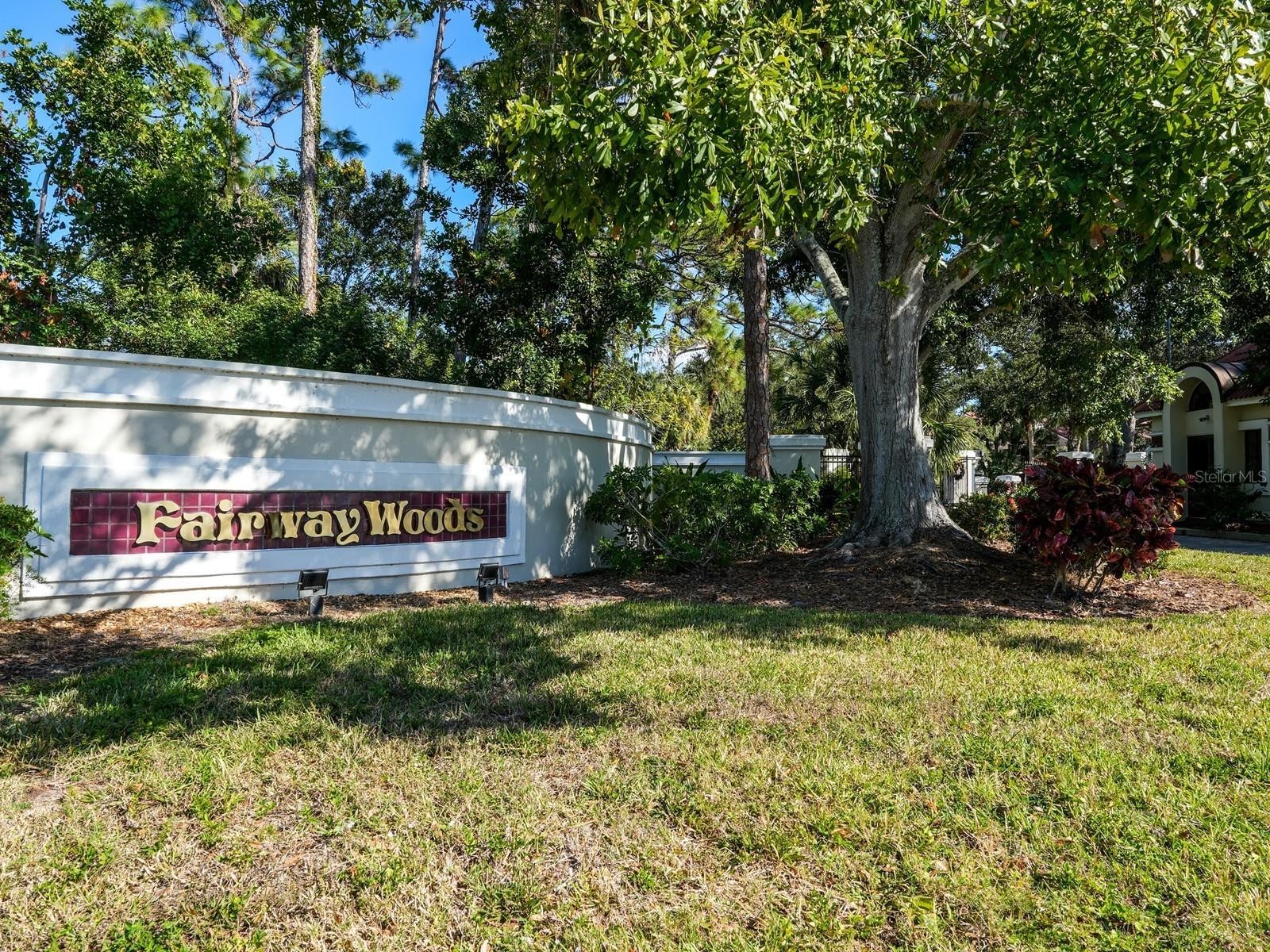 One or more photo(s) has been virtually staged. Experience the ultimate Florida lifestyle with this maintenance-free villa, nestled in a vibrant community designed for those who appreciate comfort and privacy. Welcome to this first-floor end unit, which offers a flexible layout that can easily accommodate dual primary suites, when needed. Boasting a total of three bedrooms and two bathrooms, enhanced with delightful features like a cozy fireplace, an elegant, mirrored bar, sophisticated crown moldings, stylish built-ins, pocket doors, gorgeous granite countertops, and quality cabinetry, along with track and recessed lighting. Wooded privacy can be seen through the sliding glass doors from the gracious formal living room. Formal dining is located between here and the kitchen, including a morning room. This inviting space showcases stunning maple cabinetry, sleek stainless-steel appliances, a lovely, tiled backsplash, a granite breakfast bar, and a convenient pantry, all highlighted by custom offset tile. It also leads through sliding glass doors to the private covered and screened lanai. Double doors at the front of the home provide a quiet area for a home office. This space has a built-in closet and features a pocket door to the secondary en suite, making it suitable as a bedroom or bonus area. A modern bathroom has an impressive walk-in shower with a glass door, contrasting granite countertops, and white raised-panel cabinetry, drop lighting, and tile floors. The Owner's Suite, the largest of all bedrooms, features a window seat overlooking private wooded views, two built-in closets, and a large walk-in closet in the personal bath. It includes a single vanity with a makeup table and dual sinks, a garden soaking tub, and a separate accessible shower. The interior is thoughtfully finished with a convenient laundry room and a door leading to the attached two-car garage. Located in Fairway Woods, a charming private community near Siesta Key Beach, which is known as one of the best beaches in the world. Surrounded by magnificent, mature trees, this area is a true gem that offers fantastic opportunities for boating, biking, and hiking. Golf enthusiasts will appreciate the nearby top-rated TPC golf course. Additionally, residents have convenient access to grocery stores, healthcare facilities, and the vibrant cultural scene in Downtown Sarasota. The association fee covers roof and exterior maintenance, enhancing homeowners' convenience. The community fosters a warm spirit and features amenities such as a heated pool, along with a variety of enrichment classes and social events. You can meander through the beautifully landscaped grounds and enjoy the peaceful conservation areas—making it a wonderful place to call home!
