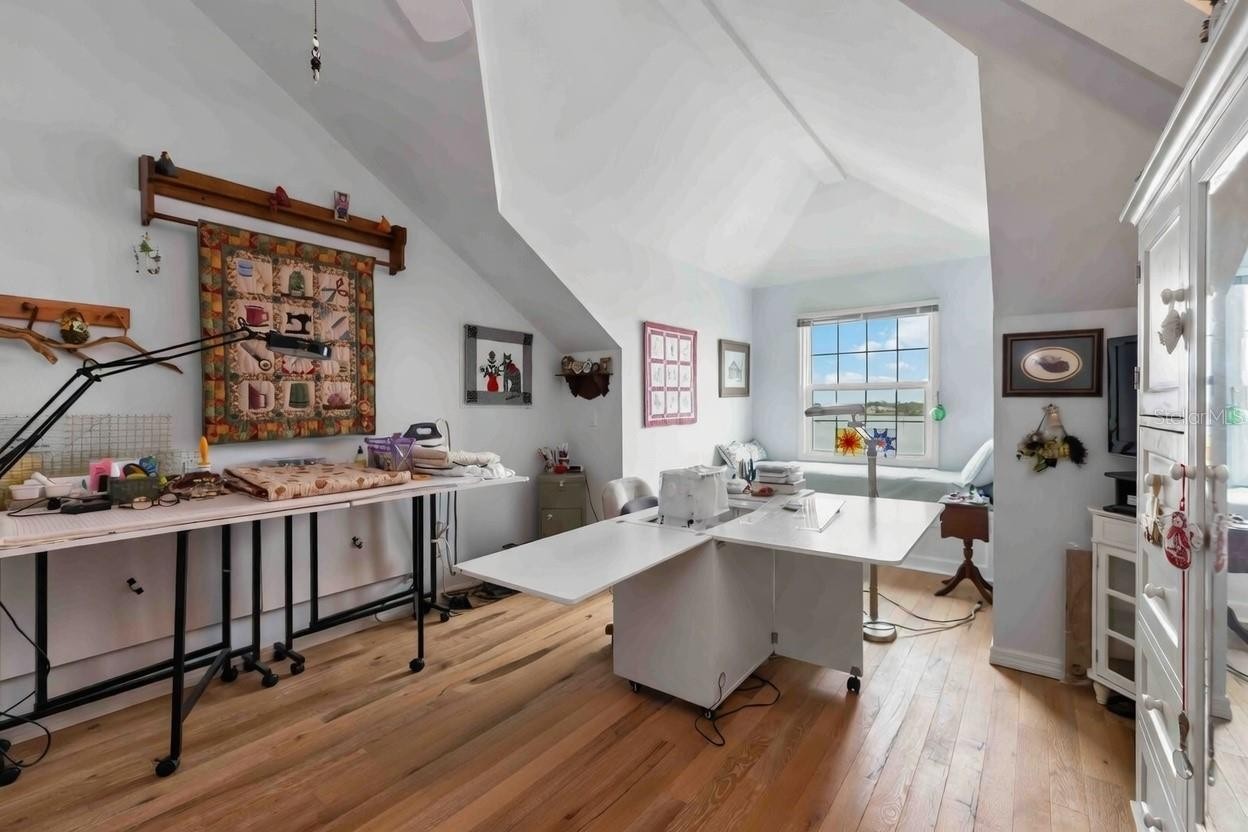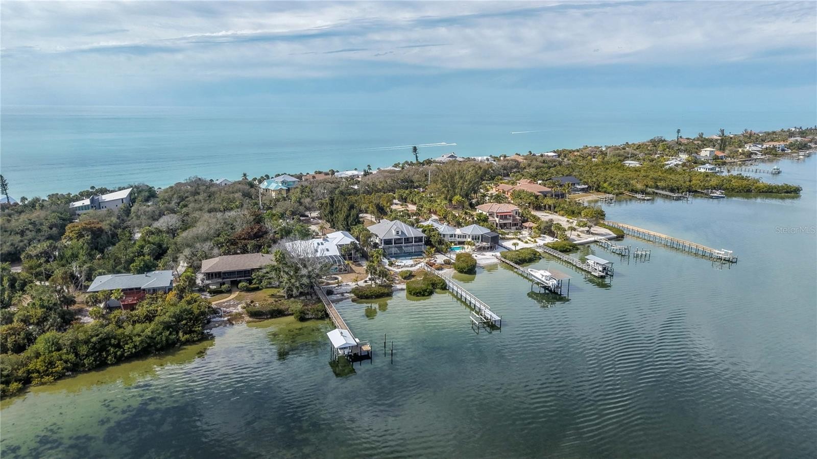 Perched on nearly an acre of prime Manasota Key waterfront, this exceptional 4-bedroom, 4-bathroom bayfront residence offers private deeded beach access to the pristine Gulf of Mexico. Sweeping panoramic views of serene Lemon Bay provide the perfect setting for refined island living. A palm-lined private drive leads to this custom-built architectural masterpiece. Soaring vaulted ceilings, bold angles, and abundant glass flood interiors with natural light, creating airy sophistication. Front and rear balconies invite immersion in lush island flora, tropical breezes, and resident ospreys. The open-concept design seamlessly integrates the grand living room, dining area, gourmet kitchen, and primary suite—all opening to a full-width screened balcony overlooking the 40-foot heated pool, brand-new dock, and tranquil bay. Ideal for sunrise coffee, sunset entertaining, or year-round outdoor living. The living room features a custom floor-to-ceiling built-in for library or home theater. The chef’s kitchen includes premium appliances, oversized dine-in bar with quartz waterfall edge, and direct Lemon Bay views—perfect for meals and gatherings. The spacious primary suite opens to the screened porch with unobstructed bay vistas and boasts a spa-like en-suite with dual vanities and oversized walk-in shower. Adjacent main-level guest bedroom easily converts to a home office or studio. A state-of-the-art elevator installed in 2023 provides effortless access to the upper level, where two mirrored guest suites feature soaring ceilings, dormer windows, and cozy window-seat alcoves—ideal retreats. Resort amenities include a pristine 40-foot heated pool with full bath and outdoor shower, plus a dedicated private workshop for woodworking, crafting, or creative projects. The backyard offers a relaxing deck and sandy shoreline for paddleboards, kayaks, or barefoot relaxation. A brand-new deep-water dock (installed 2025) with heavy-duty boat lift awaits your vessels. The oversized 4-car garage (tall ceilings, epoxy floors) fits vehicles, RV, boats, or toys, with exceptional built-in storage and modern security throughout. This rare bay-to-Gulf gem on exclusive Manasota Key delivers unmatched privacy, distinction, and modern luxury—where seamless indoor-outdoor flow and breathtaking views create a legacy residence for discerning owners.
