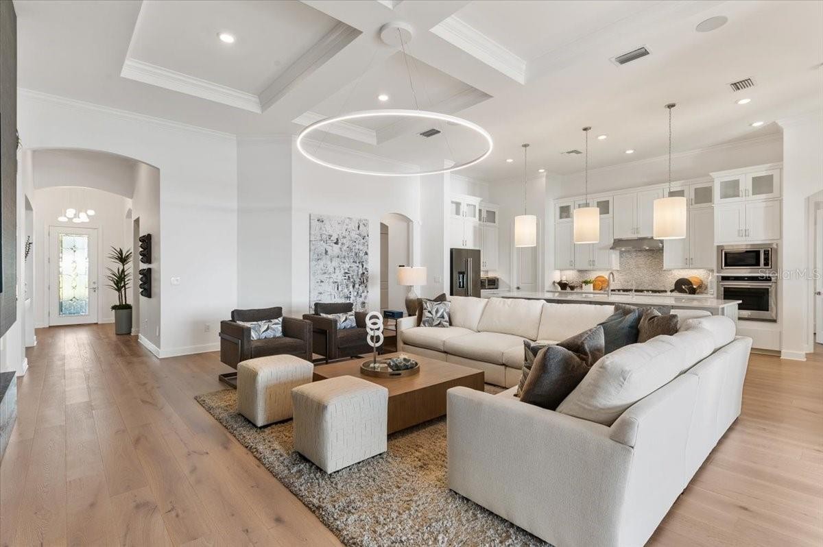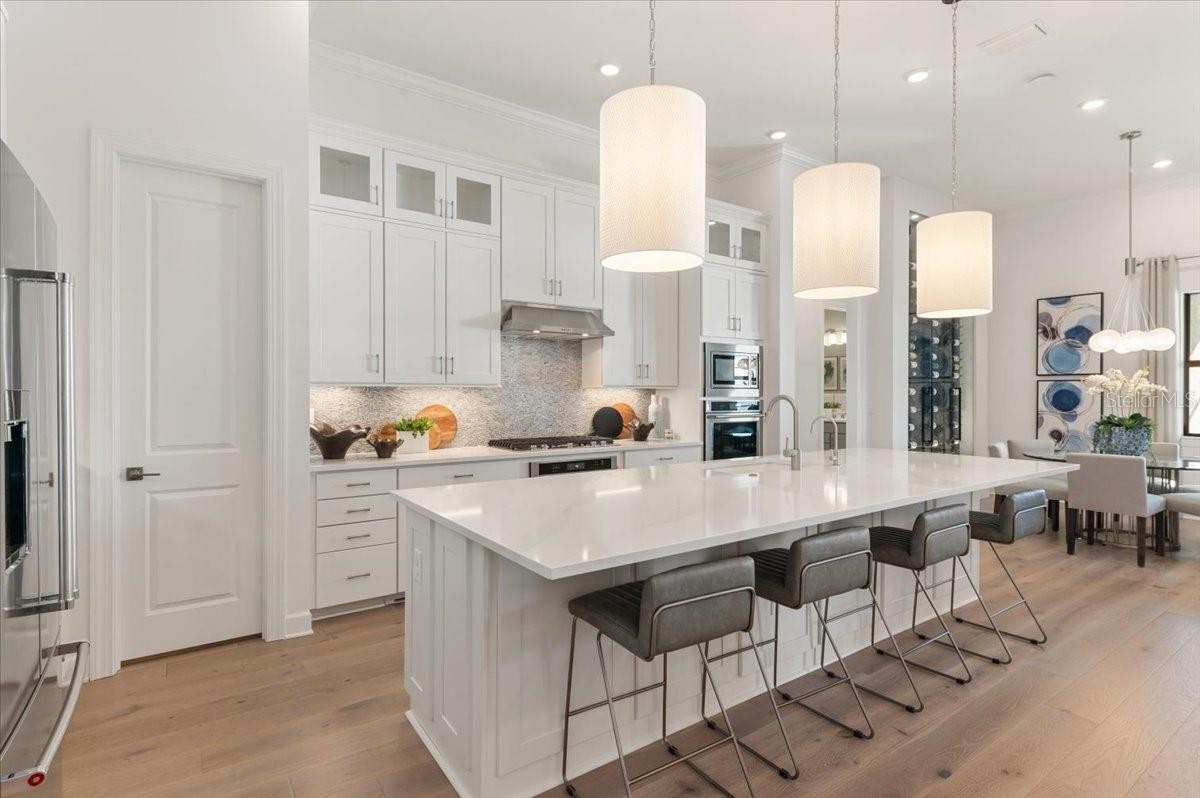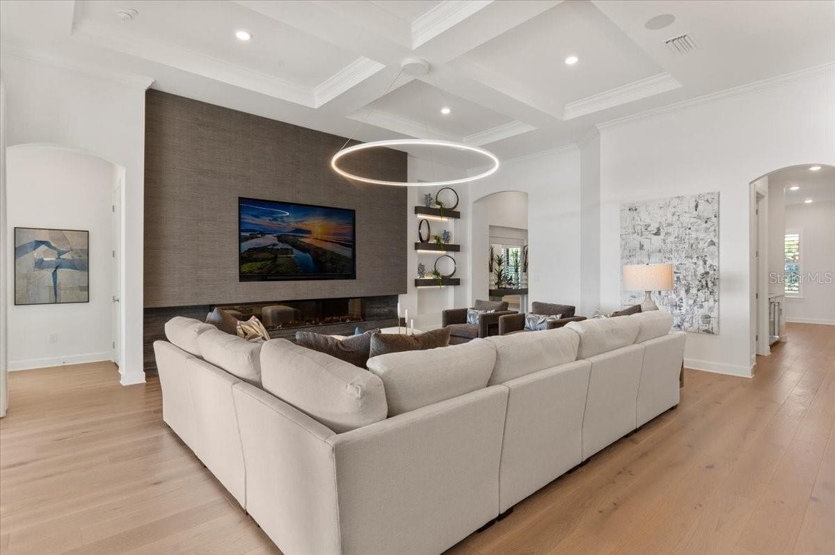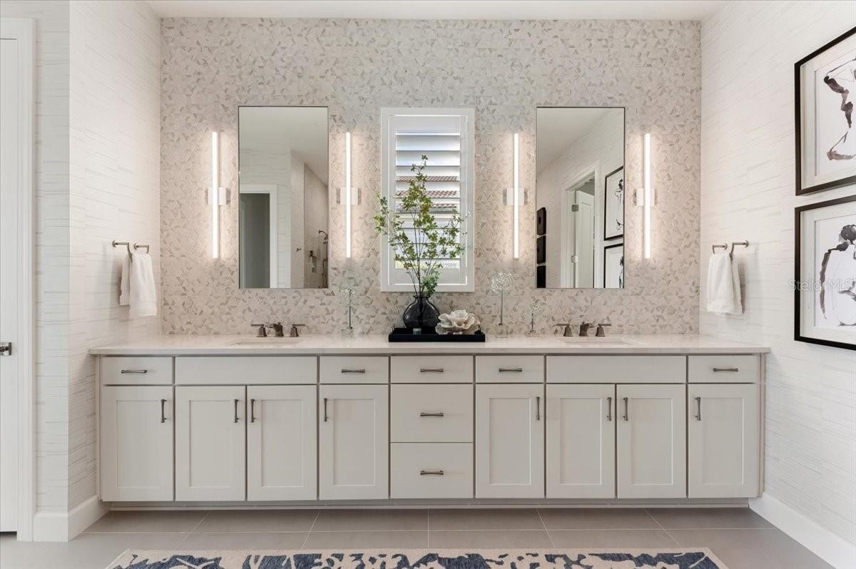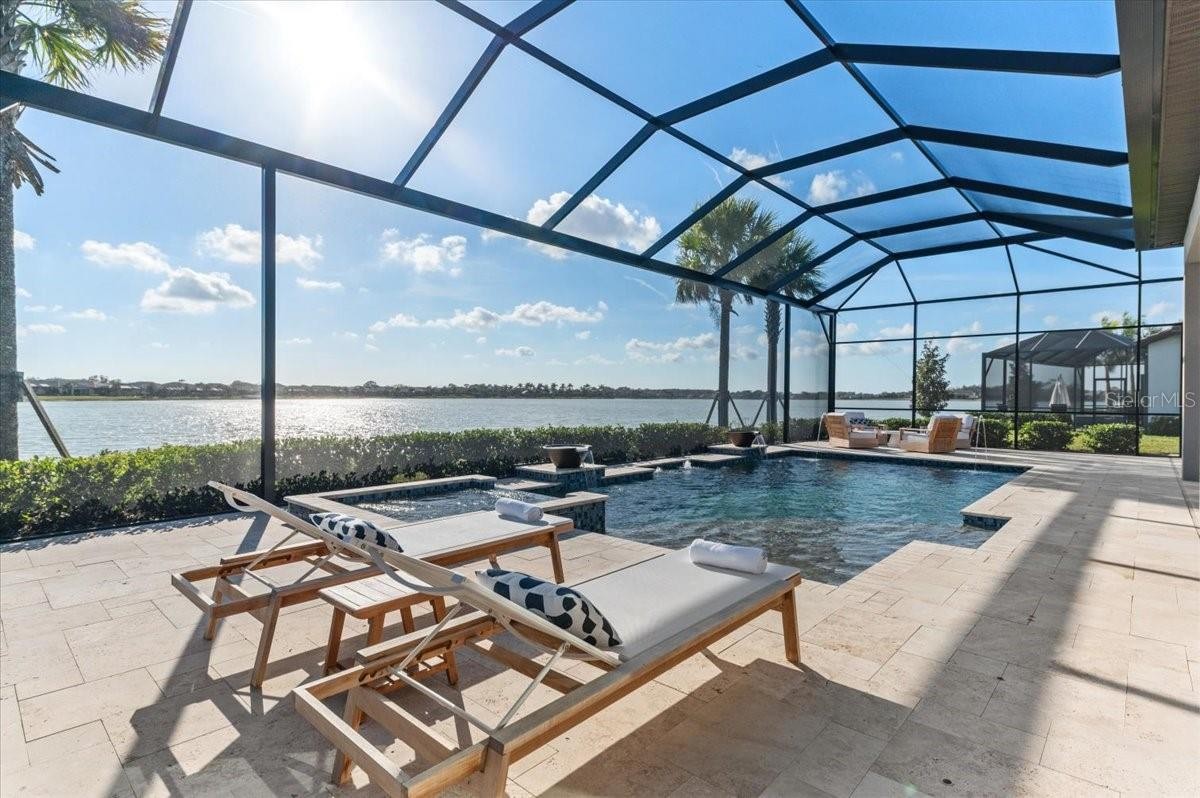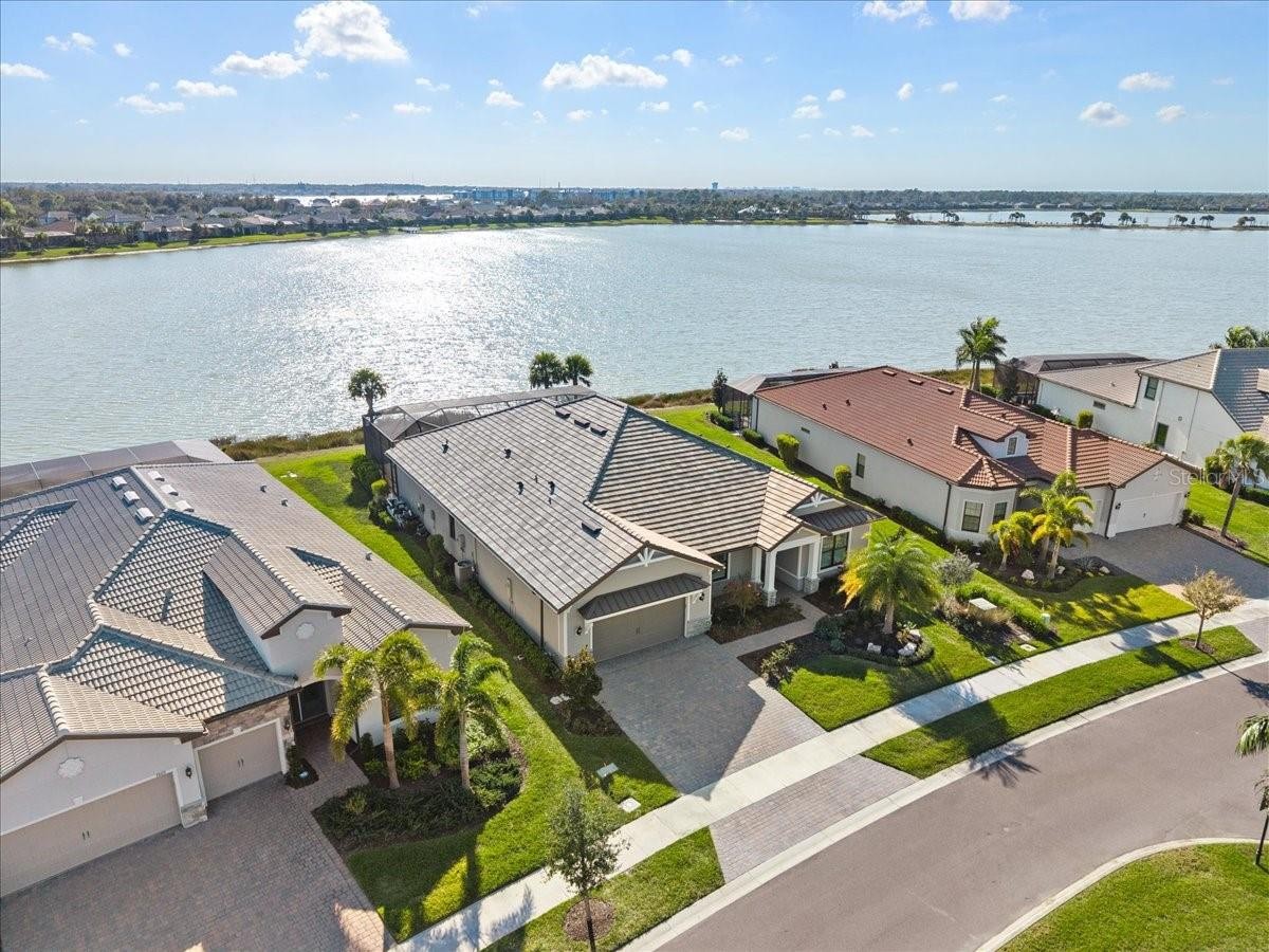 An extraordinary expression of lakeside luxury, this impeccably fully upgraded residence is perfectly positioned along one of the largest lakes in the highly sought-after community of Shoreview at Waterside. Fully upgraded with nothing left to be desired, this home offers four bedrooms, three full baths, two half baths, and a versatile flex room all one level. Upon entering, you will be welcomed by a captivating water view and rich wood flooring that flows throughout the main living spaces. The gourmet kitchen is expertly suited for entertaining with double ovens, quartz countertops, an oversized island with seating, reverse osmosis system, a walk-in pantry, a gas cooktop, and a custom tile backsplash. The great room impresses with soaring ceilings and a custom built-in TV wall with fireplace. Integrated Sonos speakers throughout the home create the perfect ambiance as upgraded 10-foot sliders open seamlessly to the outdoor retreat. Unwind in the resort-style pool and spa while taking in expansive water views and coveted southwest exposure. The entertaining space continues with an extended lanai, natural stone pavers, a convenient pool bath, and a fully equipped outdoor kitchen featuring a Coyote grill, side burner, beverage refrigerator, and sink. The owner’s retreat serves as a private sanctuary, highlighted by tray ceilings, motorized blinds, and a spacious sitting area. The adjoining primary bath offers a large soaking tub, a custom tile feature wall, and an expansive custom closet. Three separate guest suites—one with a private en-suite bath—provide comfortable accommodations for family and visitors. A dedicated flex space near the kitchen, complete with a wet bar, offers versatility and is ideal for a home office, bonus room or dining room. This home offers added peace of mind with impact windows, a security system, and exterior cameras. The two-and-a-half-car garage features epoxy flooring, an electric vehicle charger, built-in shelving, and dedicated golf-cart parking. Additional highlights include a designer powder room with upgraded tile, built-in wine wall, enhanced landscaping, easement for a dock, a widened driveway and custom closet systems throughout. Shoreview at Waterside Lakewood Ranch is a highly-sought-after community that features resort-style amenities such as a beach area, heated pool and spa, clubhouse, tennis and pickleball courts, and a state-of-the-art fitness center. This home is in close proximity to Waterside Place - Lakewood Ranch’s newest town center and the only waterfront retail and lifestyle destination in Sarasota. HOA includes all landscaping.