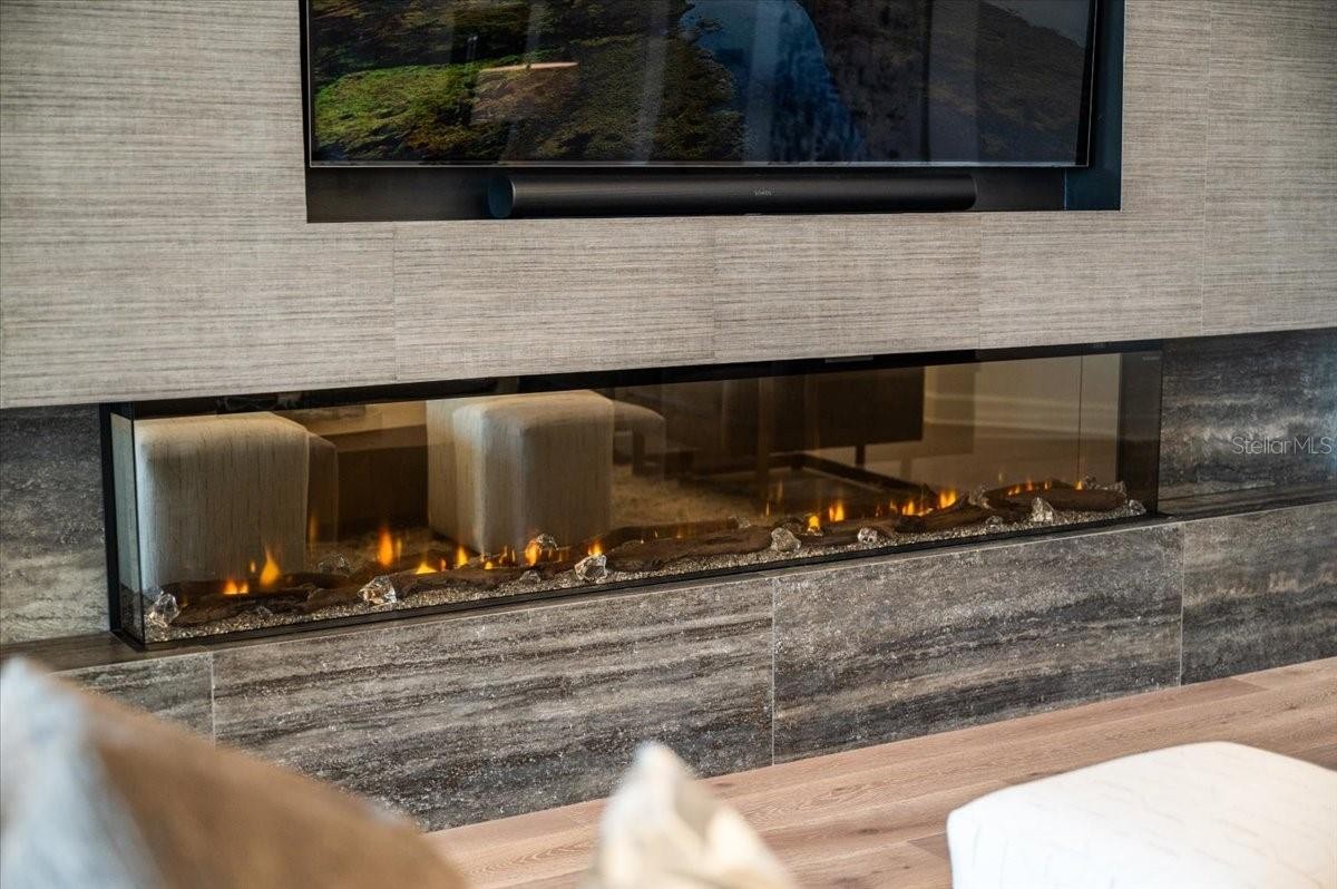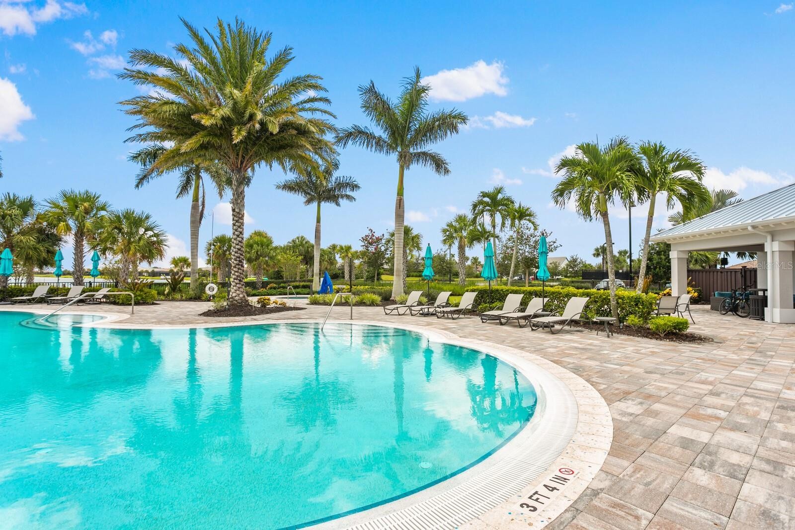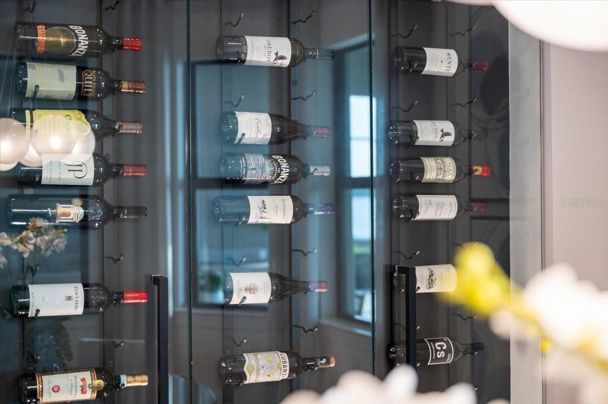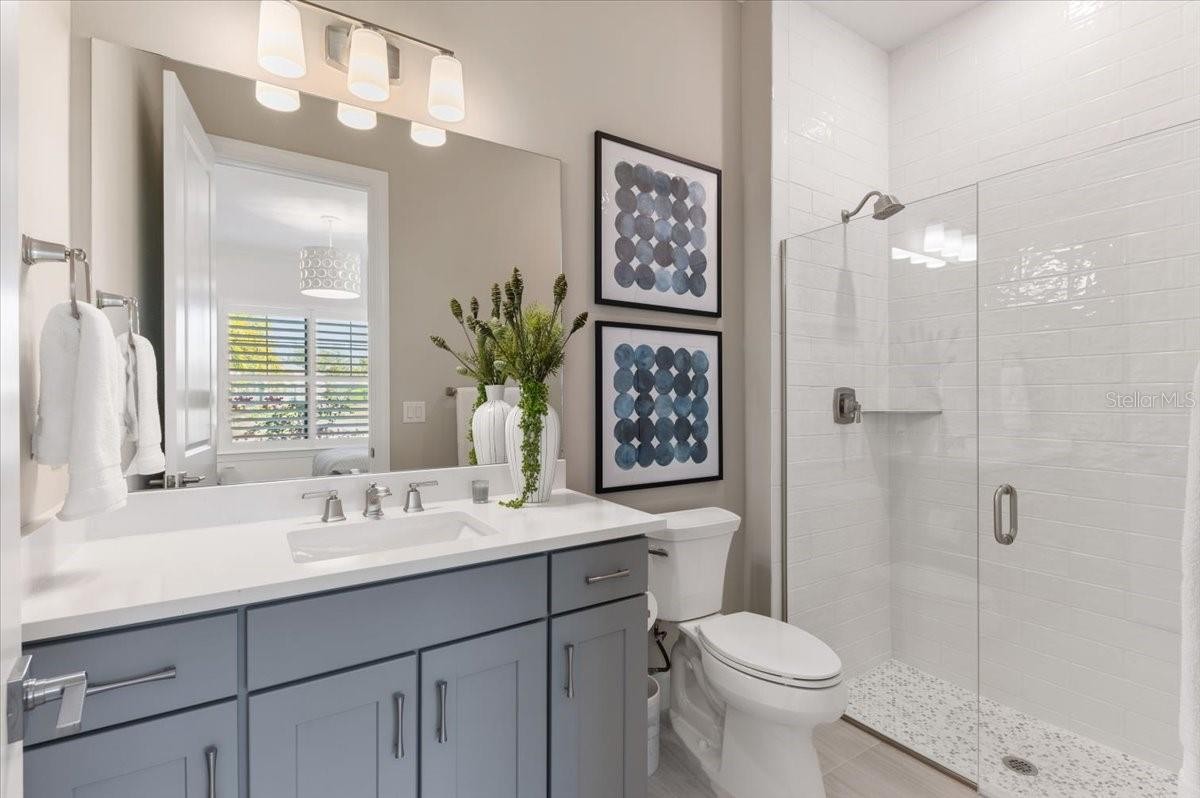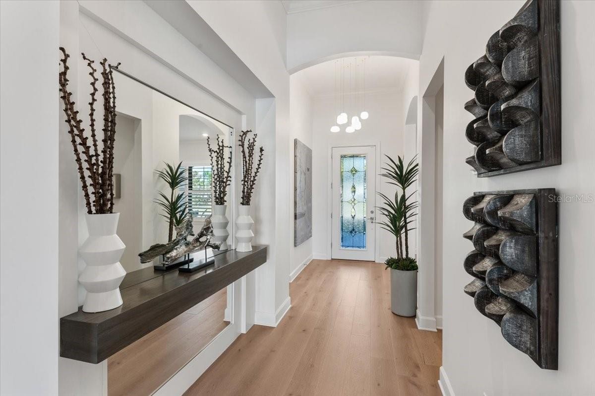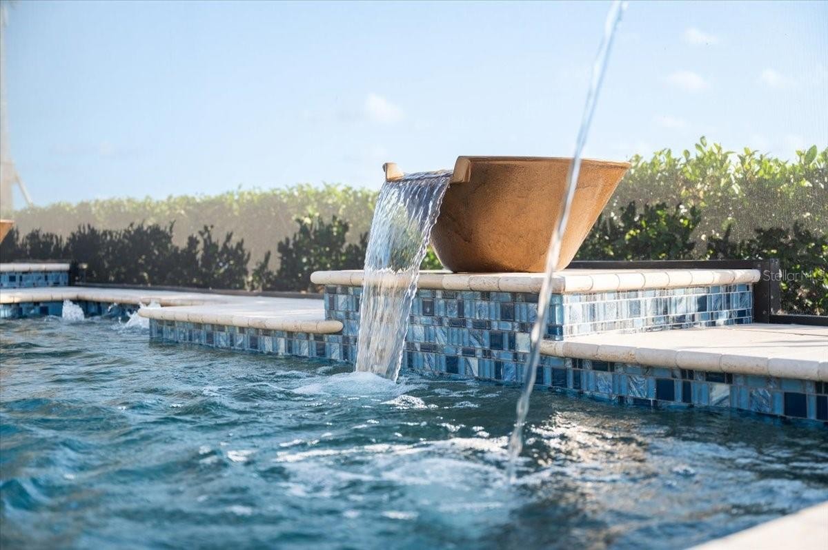 An extraordinary expression of lakeside luxury, this impeccably fully upgraded residence is perfectly positioned along one of the largest lakes in the highly sought-after community of Shoreview at Waterside. Fully upgraded with nothing left to be desired, this home offers four bedrooms, three full baths, two half baths, and a versatile flex room all one level. Upon entering, you will be welcomed by a captivating water view and rich wood flooring that flows throughout the main living spaces. The gourmet kitchen is expertly suited for entertaining with double ovens, quartz countertops, an oversized island with seating, reverse osmosis system, a walk-in pantry, a gas cooktop, and a custom tile backsplash. The great room impresses with soaring ceilings and a custom built-in TV wall with fireplace. Integrated Sonos speakers throughout the home create the perfect ambiance as upgraded 10-foot sliders open seamlessly to the outdoor retreat. Unwind in the resort-style pool and spa while taking in expansive water views and coveted southwest exposure. The entertaining space continues with an extended lanai, natural stone pavers, a convenient pool bath, and a fully equipped outdoor kitchen featuring a Coyote grill, side burner, beverage refrigerator, and sink. The owner’s retreat serves as a private sanctuary, highlighted by tray ceilings, motorized blinds, and a spacious sitting area. The adjoining primary bath offers a large soaking tub, a custom tile feature wall, and an expansive custom closet. Three separate guest suites—one with a private en-suite bath—provide comfortable accommodations for family and visitors. A dedicated flex space near the kitchen, complete with a wet bar, offers versatility and is ideal for a home office, bonus room or dining room. This home offers added peace of mind with impact windows, a security system, and exterior cameras. The two-and-a-half-car garage features epoxy flooring, an electric vehicle charger, built-in shelving, and dedicated golf-cart parking. Additional highlights include a designer powder room with upgraded tile, built-in wine wall, enhanced landscaping, easement for a dock, a widened driveway and custom closet systems throughout. Shoreview at Waterside Lakewood Ranch is a highly-sought-after community that features resort-style amenities such as a beach area, heated pool and spa, clubhouse, tennis and pickleball courts, and a state-of-the-art fitness center. This home is in close proximity to Waterside Place - Lakewood Ranch’s newest town center and the only waterfront retail and lifestyle destination in Sarasota. HOA includes all landscaping.