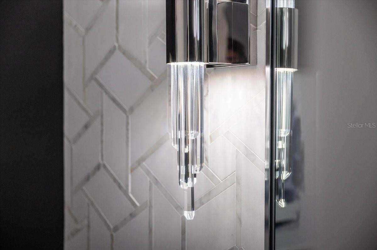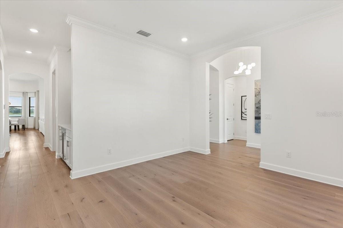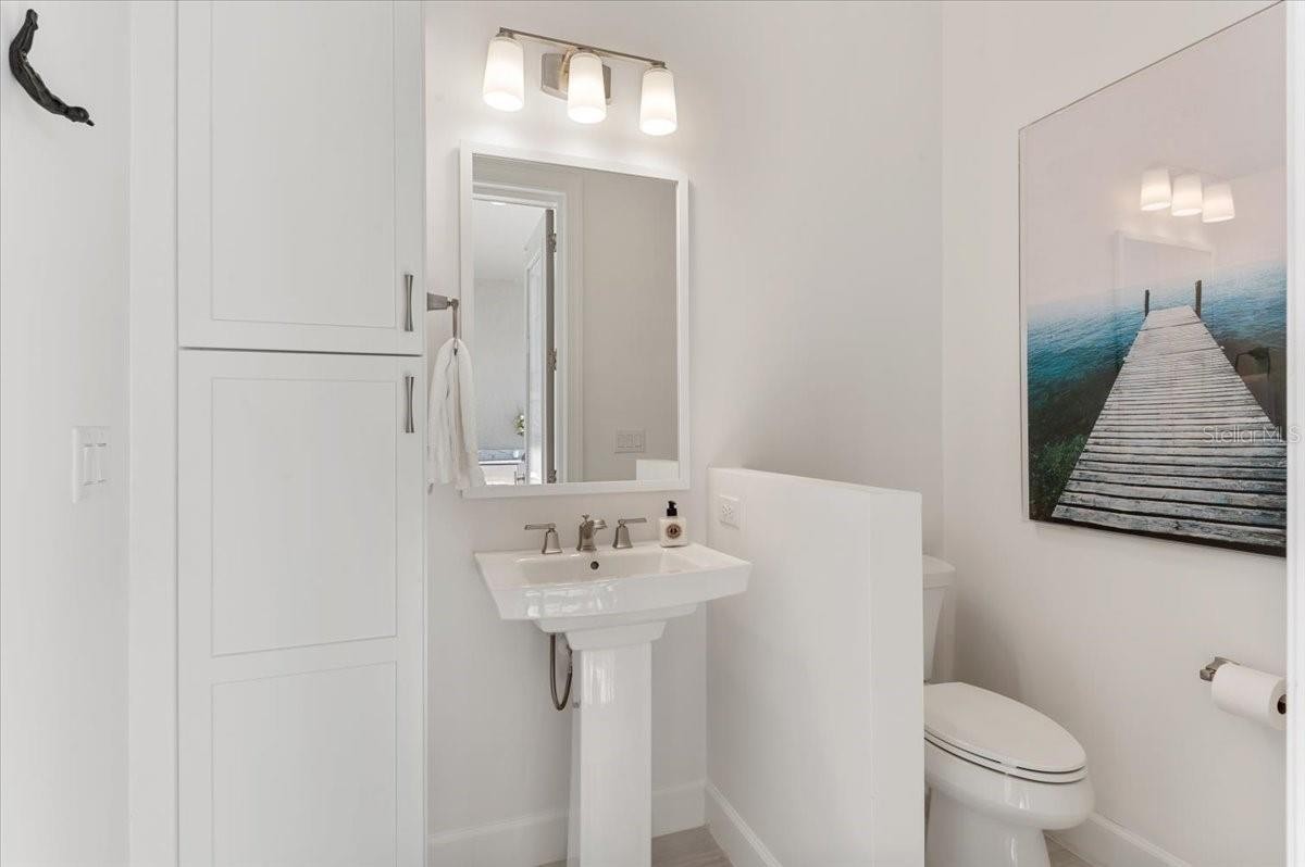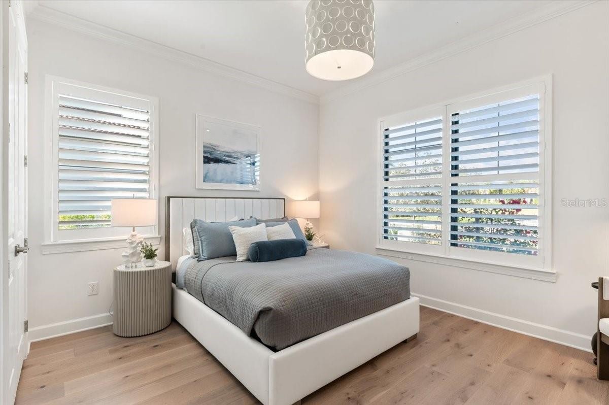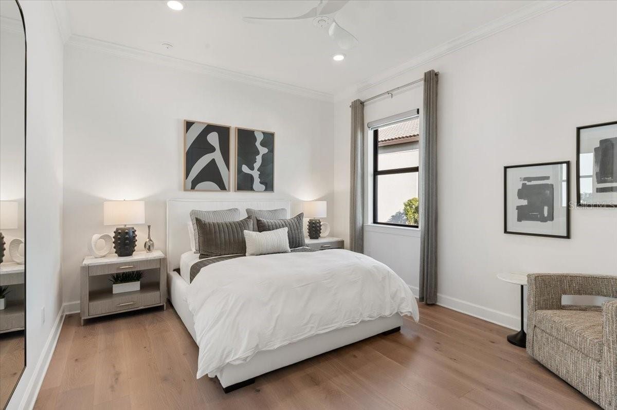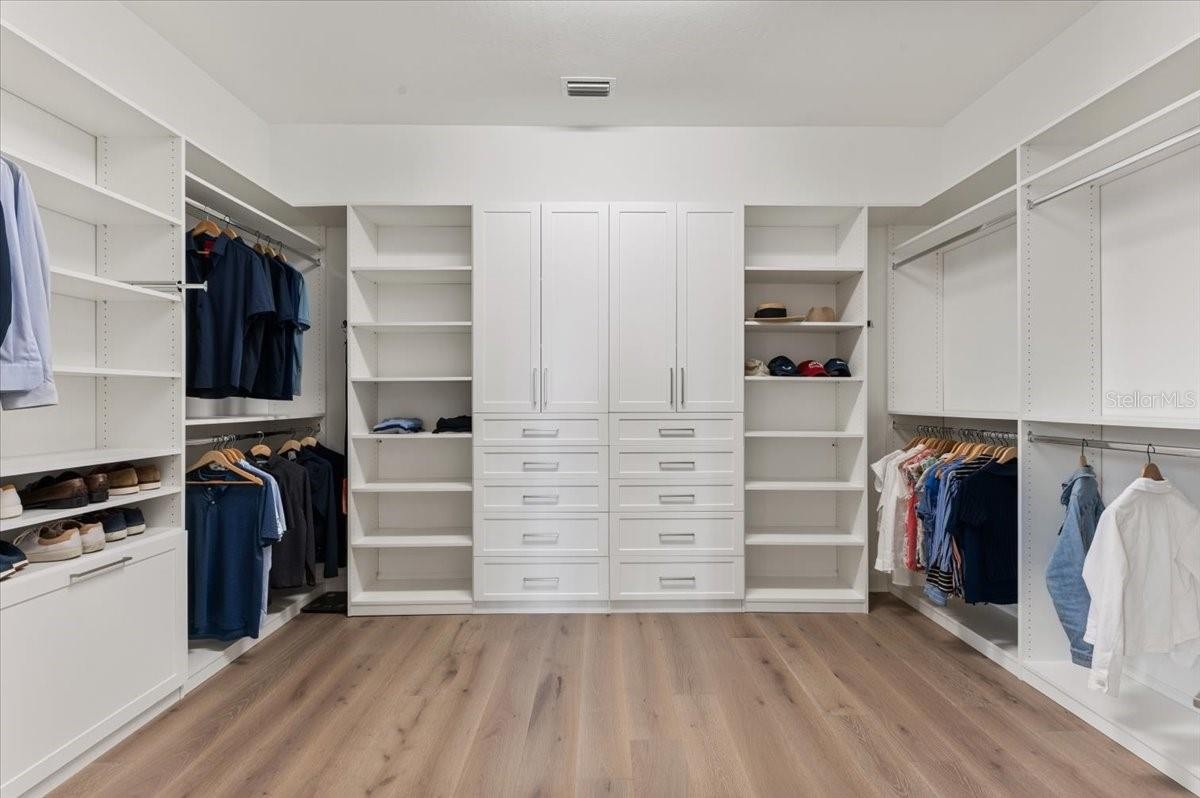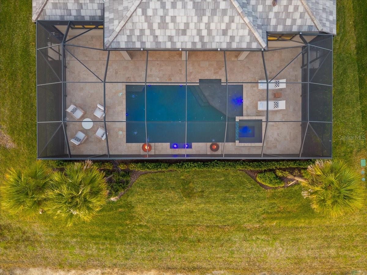An extraordinary expression of lakeside luxury, this impeccably fully upgraded residence is perfectly positioned along one of the largest lakes in the highly sought-after community of Shoreview at Waterside. Fully upgraded with nothing left to be desired, this home offers four bedrooms, three full baths, two half baths, and a versatile flex room all one level. Upon entering, you will be welcomed by a captivating water view and rich wood flooring that flows throughout the main living spaces. The gourmet kitchen is expertly suited for entertaining with double ovens, quartz countertops, an oversized island with seating, reverse osmosis system, a walk-in pantry, a gas cooktop, and a custom tile backsplash. The great room impresses with soaring ceilings and a custom built-in TV wall with fireplace. Integrated Sonos speakers throughout the home create the perfect ambiance as upgraded 10-foot sliders open seamlessly to the outdoor retreat. Unwind in the resort-style pool and spa while taking in expansive water views and coveted southwest exposure. The entertaining space continues with an extended lanai, natural stone pavers, a convenient pool bath, and a fully equipped outdoor kitchen featuring a Coyote grill, side burner, beverage refrigerator, and sink. The owner’s retreat serves as a private sanctuary, highlighted by tray ceilings, motorized blinds, and a spacious sitting area. The adjoining primary bath offers a large soaking tub, a custom tile feature wall, and an expansive custom closet. Three separate guest suites—one with a private en-suite bath—provide comfortable accommodations for family and visitors. A dedicated flex space near the kitchen, complete with a wet bar, offers versatility and is ideal for a home office, bonus room or dining room. This home offers added peace of mind with impact windows, a security system, and exterior cameras. The two-and-a-half-car garage features epoxy flooring, an electric vehicle charger, built-in shelving, and dedicated golf-cart parking. Additional highlights include a designer powder room with upgraded tile, built-in wine wall, enhanced landscaping, easement for a dock, a widened driveway and custom closet systems throughout. Shoreview at Waterside Lakewood Ranch is a highly-sought-after community that features resort-style amenities such as a beach area, heated pool and spa, clubhouse, tennis and pickleball courts, and a state-of-the-art fitness center. This home is in close proximity to Waterside Place - Lakewood Ranch’s newest town center and the only waterfront retail and lifestyle destination in Sarasota. HOA includes all landscaping.