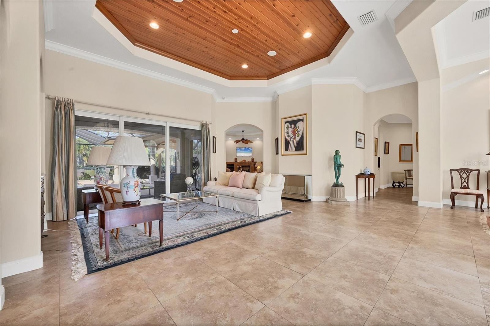 Set within the quiet, enclave of the Preserve at Mission Valley, 793 Vanderbilt Drive offers a rare blend of privacy, scale, and resilience in one of Nokomis’ most desirable residential pockets. One of just 17 homes in the community on a quiet cul de sac, the five-bedroom residence, the 5th bedroom is presently being used as a movie room, sits elevated approximately 13 feet above sea level on a one-acre parcel. Spanning 3,954 square feet under air, the home is defined by its generous proportions and soaring 12-foot ceilings, which create an immediate sense of openness and light. Further enhancing its appeal, the property is offered at a compelling value, priced below a recent appraisal. The foyer opens to the living and dining room, which set a sophisticated tone with tray ceilings, crown molding, arched architectural details, and large-format tile flooring, while expansive sliders establish a seamless connection to the covered lanai and tropical backyard beyond. At the center of the home, a well-appointed kitchen anchors everyday living and entertaining, featuring granite countertops, abundant wood cabinetry, a large prep island with bar seating, a walk-in pantry, and a full suite of stainless Whirlpool appliances. The primary suite occupies its own private wing, offering a quiet retreat with Hickory hardwood floors, tray ceiling with wood-plank inlay, and a spacious bath complete with dual vanities, soaking tub, and walk-in shower. Designed with flexibility in mind, the residence also includes a dedicated mother-in-law suite with its own living or bonus room, fireplace, and en-suite bath, ideal for multi-generational living, extended guests, or private quarters. Two additional guest bedrooms share a Jack-and-Jill bath, maintaining both comfort and functionality. A private heated pool and spa are complemented by a covered lanai, protected by a hurricane-rated screen enclosure, direct-access pool bath and outdoor shower. The professionally landscaped grounds feature specimen plantings and individualized irrigation for each tree, while the expansive lot allows room for a tennis or pickleball court. Beyond its aesthetics, the home is distinguished by its infrastructure. A four-car, side-facing garage includes large workshop space and room for storage shelving, climate-controlled storage rooms, and areas easily convertible to additional living or fitness space. Hurricane-impact windows and doors rated to 140 mph winds, a 24kW Generac whole-house generator, industrial central vac system, new roof (2024), new water heater (2025), three new A/C units, solar air purification, advanced security, and dedicated irrigation well underscore a commitment to long-term durability and peace of mind. Located just a few miles from Nokomis Beach and minutes from top-rated schools, Mission Valley Country Club, the new Sarasota Memorial Hospital campus, the Legacy Trail, and everyday conveniences, 793 Vanderbilt Drive offers a refined yet practical expression of Florida living, one that balances privacy, preparedness, and proximity to the Gulf Coast lifestyle.