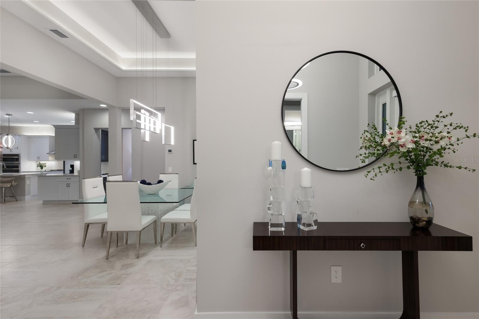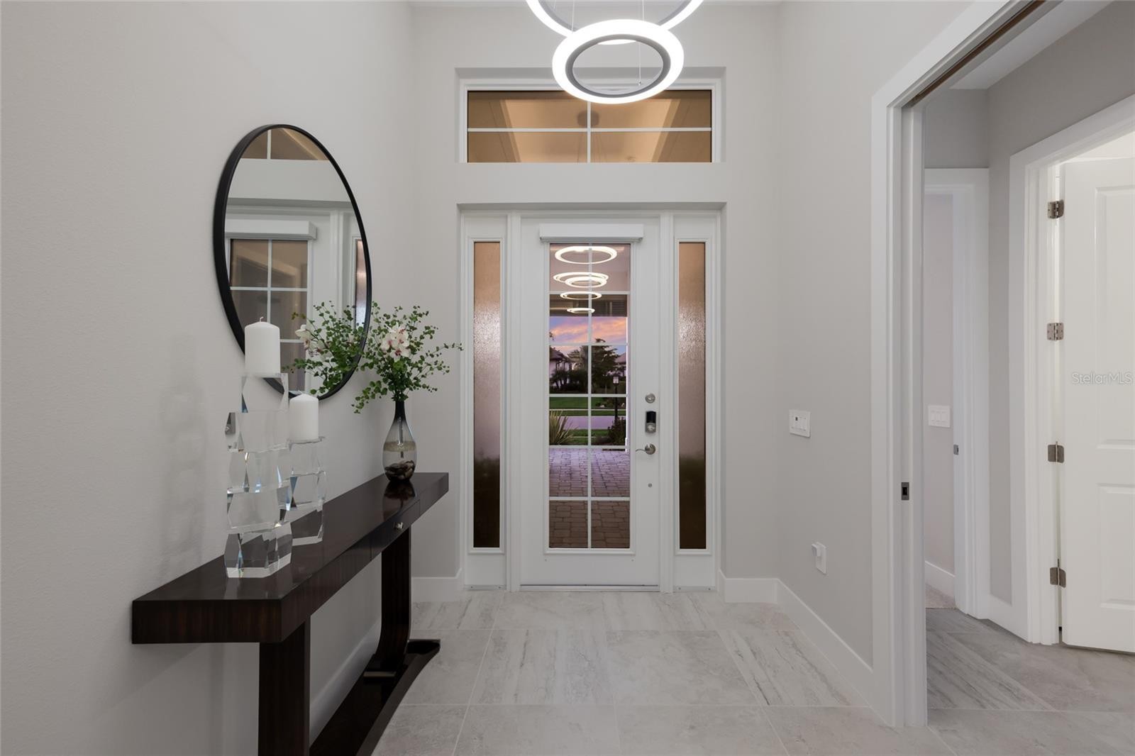 Located within the highly sought-after community of Lakehouse Cove, this impeccably upgraded residence blends elegant design, modern convenience, and effortless Florida indoor-outdoor living. Offering three bedrooms, office/den and two-and-half baths, and a spacious three-car garage, the home showcases exceptional craftsmanship and thoughtfully curated custom enhancements throughout. The open concept interior is highlighted by lighted tray ceilings, designer finishes, and an impressive great room featuring custom built in cabinetry shared by both the great room and den. The dining room offers an oversized backlit mirror. Enjoy the gourmet kitchen, which is beautifully appointed with quartz countertops, tile backsplash to the ceiling, rich wood cabinetry with pullouts and soft-close doors, upper and under cabinet lighting, and modern designer pendant lighting. A full suite of stainless-steel appliances, including a wine refrigerator. The private owner's suite offers a tranquil retreat with a custom-designed walk-in closet and spa-inspired bath, dual sinks with a make-up vanity. Two additional guest suites feature spacious custom walk-in closets and ensuite bath access, with a pocket door providing comfort and privacy for visiting family and guest. Plantation shutters throughout the home and automated blinds for the lanai and front entry windows add both elegance and convenience. Outdoor living is exceptional, showcasing an oversized lanai with two covered entertaining areas, enhanced by remote-controlled screens and surrounded by upgraded professional landscaping. The resort-style outdoor retreat features a heated saltwater pool and spa with waterfall feature, Pebble Tec finish, accent tile detailing, and panoramic screen enclosure, allowing uninterrupted views and seamless indoor-outdoor enjoyment. Additional highlights include impact-rated windows throughout, three-car garage complete with custom built-in storage and epoxy flooring. A generously sized laundry room with walk in storage. A 24-hour monitored security system with exterior cameras provide added peace of mind. Residents of Lakehouse Cove enjoy access to exceptional resort-style community amenities, including a stunning community pool and vibrant social spaces surrounded by scenic waterway and natural beauty. A wonderful opportunity to enjoy refined living on one of. Lakewood Ranch's most sought-after waterfront communities. Close access to Waterside Place, downtown Sarasota, Main Street, all Sarasota beaches.
