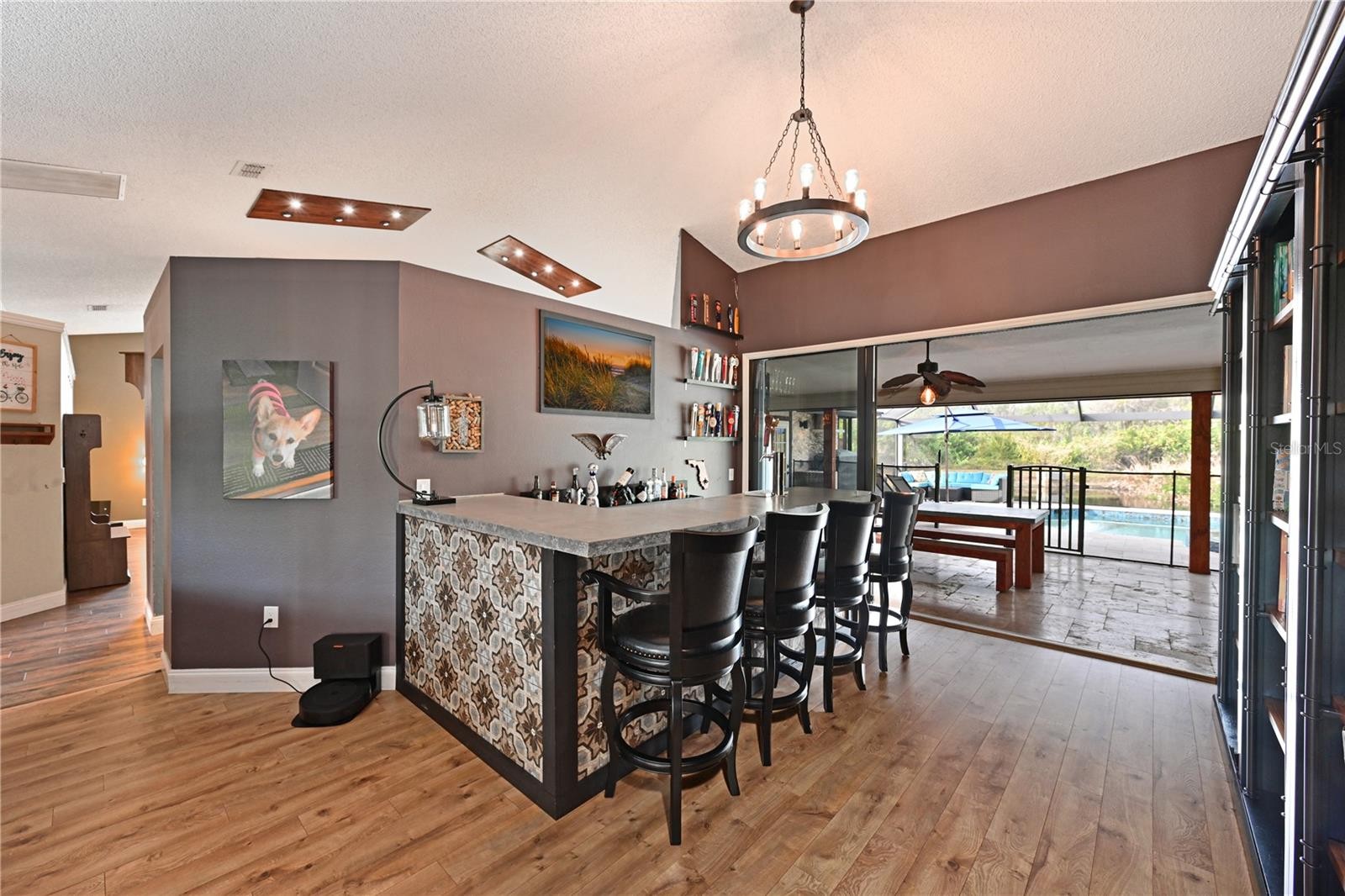 Welcome to your own resort-style outdoor oasis in the heart of Sarasota! This exceptional property has been meticulously designed for the ultimate Florida lifestyle and the demands of the modern resident. Step onto the expansive lanai to discover a beautiful travertine pool deck surrounding a sparkling heated salt water pool with a sophisticated champagne spa, all with uninterrupted water and wood views thorough your clear view cage. This tranquil retreat features a built in outdoor grill with custom hood. Inside, the open-concept layout is anchored by a custom built-in bar, perfect for hosting memorable gatherings, and engineered hardwood floors throughout the main living areas. The primary bathroom offers a spa-like experience with a luxurious steam shower. A dedicated, light-filled glass office provides the perfect quiet space for productivity. Further modern conveniences include two dedicated EV chargers in the garage, ensuring you're always ready to go. Did I mention the whole house SunPower solar system. All of this and it's perfectly located between all of the featured attractions that Sarasota and Lakewood Ranch are know for. This is a unique opportunity to own a home that perfectly blends luxury amenities with serene natural beauty and cutting-edge functionality. Schedule your private tour today!