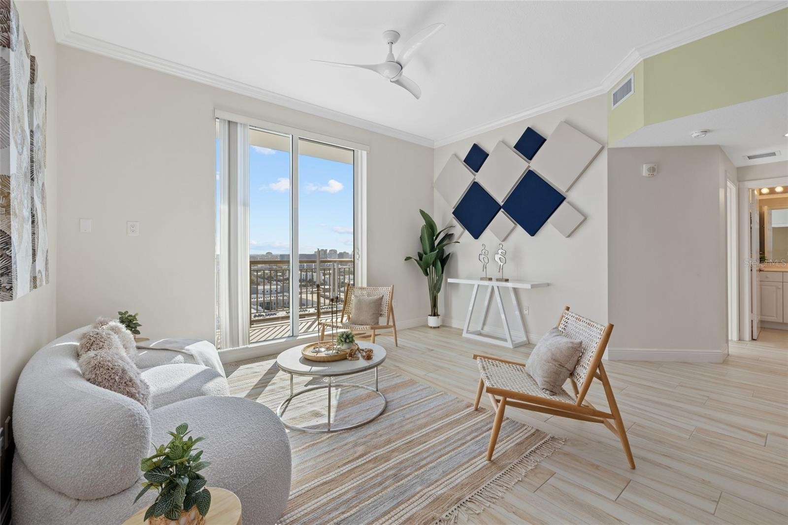 Discover luxury downtown Sarasota living in this impeccably renovated two-bedroom, two-bath high-rise condo in the vibrant heart of downtown Sarasota. Offering refined coastal sophistication and modern design, this fifteenth-floor residence in the desirable south tower showcases breathtaking easterly city views and spectacular sunrises through expansive windows and soaring 11-foot ceilings. The open-concept layout is filled with natural light, blending elegance and functionality. Nearly every surface has been redesigned, creating a move-in-ready condo defined by timeless finishes and comfort. A neutral palette enhances cohesion, while wood look porcelain tile flow throughout the entry into the kitchen, living and dining areas, high-end luxury vinyl plank flooring in bedrooms offers the warmth of wood with durability ideal for Florida living. Detailed baseboards, designer paint, a statement bar tile wall, decorative lighting, ceiling fans, and curated window treatments complete the interior. Extensive mechanical and smart-home upgrades include a new electric hot water heater, new AC with dual ultraviolet filtration, Smart Thermostat, Google Nest Pro Router, Moen Flo automatic water shutoff with leak detection, plus a new water pressure reduction valve, pressure gauge, and expansion tank. The modern kitchen is designed for daily living and entertaining, featuring rich stone countertops, tile backsplash, solid cabinetry with new hardware, custom pull-out shelving, an extra-deep cabinet above the refrigerator, and an all-new stainless-steel appliance package. A walk-in laundry room with built-in California Closets offers rare storage flexibility unique to this floor plan. The primary suite provides a private retreat with a walk-in closet and spa-inspired bath featuring a walk-in shower, garden tub, and dual-sink vanity. The second bedroom, ideal as a den or office, is generously sized with two windows overlooking the cityscape—an attribute shared by every room. Alinari is an 18-story luxury high-rise offering refined plazas, fountains, a private recreational parcel, and resort-style amenities. In 2025, enhancements were completed to the pool area, planters, movie theater, game room, and catering kitchen. The building features key-card entry, a redesigned lobby, 24-hour security, and full front-desk services. Located in Flood Zone X and outside the floodplain, Alinari was engineered with reinforced concrete and deep pilings, with lobby and guest parking elevated approximately 17 feet above sea level. This residence includes a climate-controlled storage unit and two garage parking spaces on the second and third levels. The association maintains strong reserves with no current assessments. Amenities include on-site management, secured parking, resort-style pool and spa, grilling area, club room, wine room, fitness center, saunas, business center, resident theater, and guest suites. Perfectly positioned in Sarasota’s cultural district, Alinari is moments from world-class arts, dining, waterfront promenades, and the evolving Sarasota Bay Park. Downtown Sarasota living meets effortless coastal convenience.