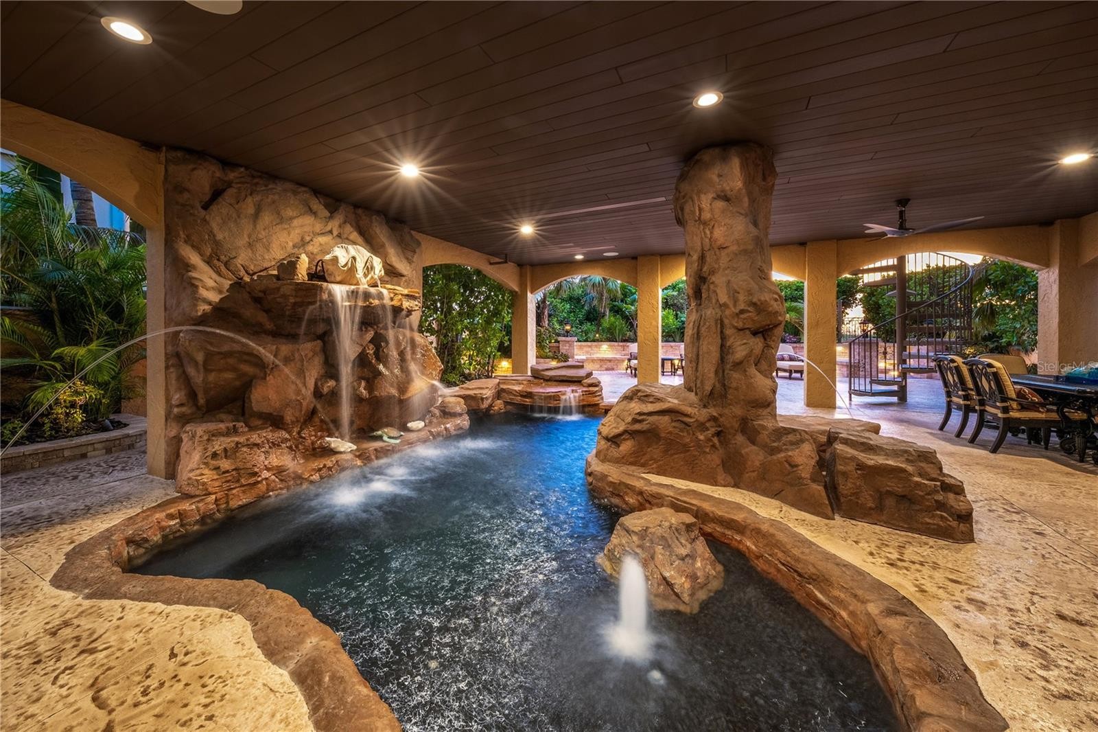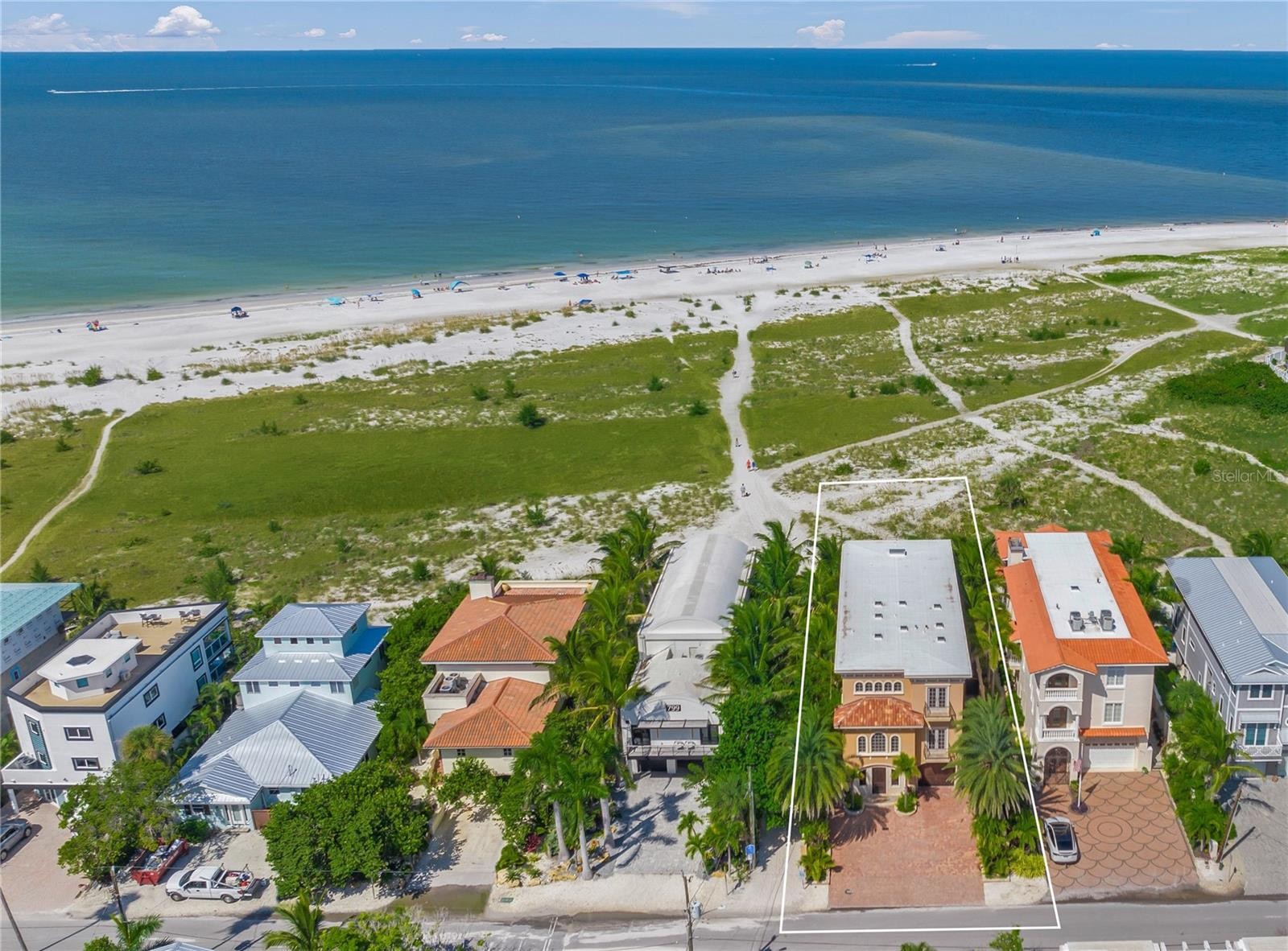 Rising gracefully on the sugar-white sands of Bean Point, The Golden Dolphin is a timeless Gulf-front residence that blends enduring craftsmanship with inspired artistry. Thoughtfully curated and offered turnkey furnished, this extraordinary home is appointed with bespoke furnishings and window treatments by Italian artisans, complemented by world-renowned works of art that elevate every space. The main living level unfolds into a grand living and dining area, where a full wall of sliders frame endless Gulf views and spectacular sunsets. The expansive balcony is an entertainer’s dream, featuring a fully equipped Lynx outdoor kitchen and a beautifully carved fireplace—an inviting setting for al fresco dining or evenings by the fire. Inside, the chef’s kitchen is outfitted with Sub-Zero, Viking, and Miele appliances, seamlessly combining performance and elegance. A refined library retreat, complete with a fireplace and exquisitely carved bookcases, offers a quiet haven for reading or reflection. The third floor is devoted to luxurious private living. The palatial primary ensuite is a serene sanctuary with spa-like amenities and opens to its own Gulf-facing balcony. Here, a soaking tub, rain shower, and an additional fireplace create an indulgent, resort-style experience. Also on this level are a gracious guest suite, a whimsical children’s ensuite bedroom, and a conveniently located laundry room. The first floor welcomes you with a dramatic foyer featuring soaring ceilings and an elevator. Just beyond lies the imaginative Captain’s Quarters, a fantastical space designed to replicate the galley of a pirate’s lair—both playful and unforgettable. An expansive office follows, showcasing granite countertops and intricately carved walls with integrated drawers and shelving, offering both beauty and function. Outdoors, the home transforms into a private oasis. The grotto-style pool provides shaded comfort and is adorned with multiple water features, while a surrounding fireplace and dining area create an intimate setting for gathering. Beyond the pool, a sun-drenched private patio invites leisurely afternoons of relaxation and sunbathing. Built to stand the test of time, The Golden Dolphin is constructed with concrete and rebar throughout and engineered with advanced drainage systems designed to reroute floodwaters. This exceptional residence has sustained no damage from past hurricanes, offering peace of mind alongside its unparalleled beauty. A rare offering on Anna Maria Island, The Golden Dolphin is a masterful expression of luxury, resilience, and coastal elegance—where art, architecture, and the Gulf converge in perfect harmony.