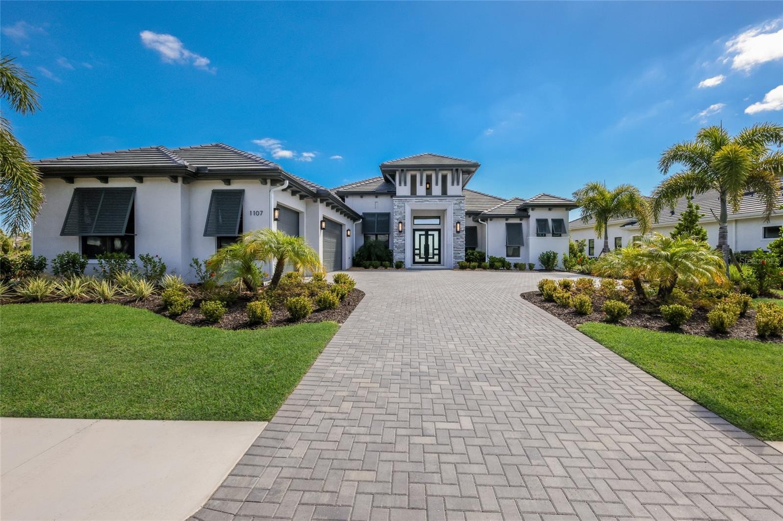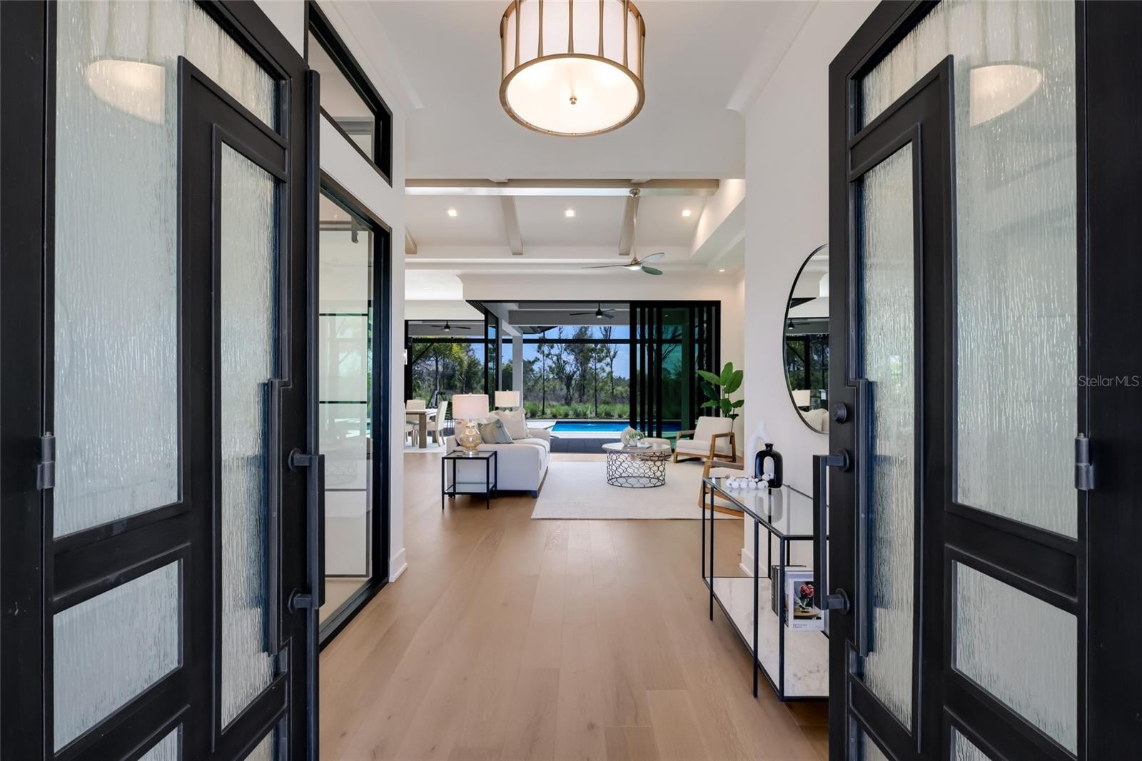 Nestled along tranquil Lake Ibis, this meticulously upgraded home offers luxury waterfront living in the highly-sought-after LakeHouse Cove at Waterside. Centrally located within the community, this residence boasts four bedrooms, three full bathrooms, and a flex space, all on a single level. Upon entering, you are welcomed by an abundance of natural light, soaring ceilings and sweeping water views that create a serene backdrop throughout the home. Stunning wood-like tile seamlessly extends throughout, enhancing the exquisite finishes chosen for this coastal contemporary home, which embodies the elegant yet relaxed lifestyle you have envisioned. At the heart of the open floor plan is the gourmet kitchen equipped with premium appliances, including a Wolf gas cooktop with pot filler, GE Monogram refrigerator, and a Wolf professional oven. The kitchen is further enhanced by white cabinetry, quartz countertops, a spacious walk-in pantry with shelving, a center island with a sink, pendulum lighting, a beverage center, and ample counter space that also serves as a breakfast bar. The spacious great room is highlighted by vaulted ceilings, an electric fireplace, built-in shelving, and expansive glass sliders that open to an outdoor oasis. Once outside, you will want to relax and enjoy the view from the sparkling, glass tiled heated pool and spa with programmable lighting and captivating fire bowls. Further enhancing the usability of the space is an expansive covered entertaining area with travertine flooring and a connecting full bath. The split bedroom layout guarantees privacy for both homeowners and guests, with the owner's retreat providing direct access to the pool deck. This retreat boasts a stunning view of the lake, a beautifully lit tray ceiling, and his and her closets complete with custom built-ins. In the adjoining owner's bathroom, you’ll discover a spa-like shower, separate his and her vanities, a linen closet, and upgraded tiling. Quietly positioned on the opposite side of the home, you will find three additional quality-sized bedrooms, one of which offers direct access to the pool deck and a water view. Additionally, there is a separate, designated flex space that is perfectly suited for a home office. For peace of mind, this home features impact windows and a security system with cameras. The three-car garage boasts epoxy flooring and a sink. Other noteworthy features include: a mudroom, large laundry room with sink, AC with UV filtration, upgraded ceiling fans, and more. LakeHouse Cove is a fully equipped lifestyle community offering resort-style amenities including a state-of-the-art gym, clubhouse, playground, pickleball courts, social activities, a pool and spa overlooking a lake, and a boathouse with kayak storage. From the boathouse, you can hop on the water taxi to Waterside Place – Lakewood Ranch’s newest town center and the only waterfront retail and lifestyle destination in Sarasota. HOA includes all landscaping.