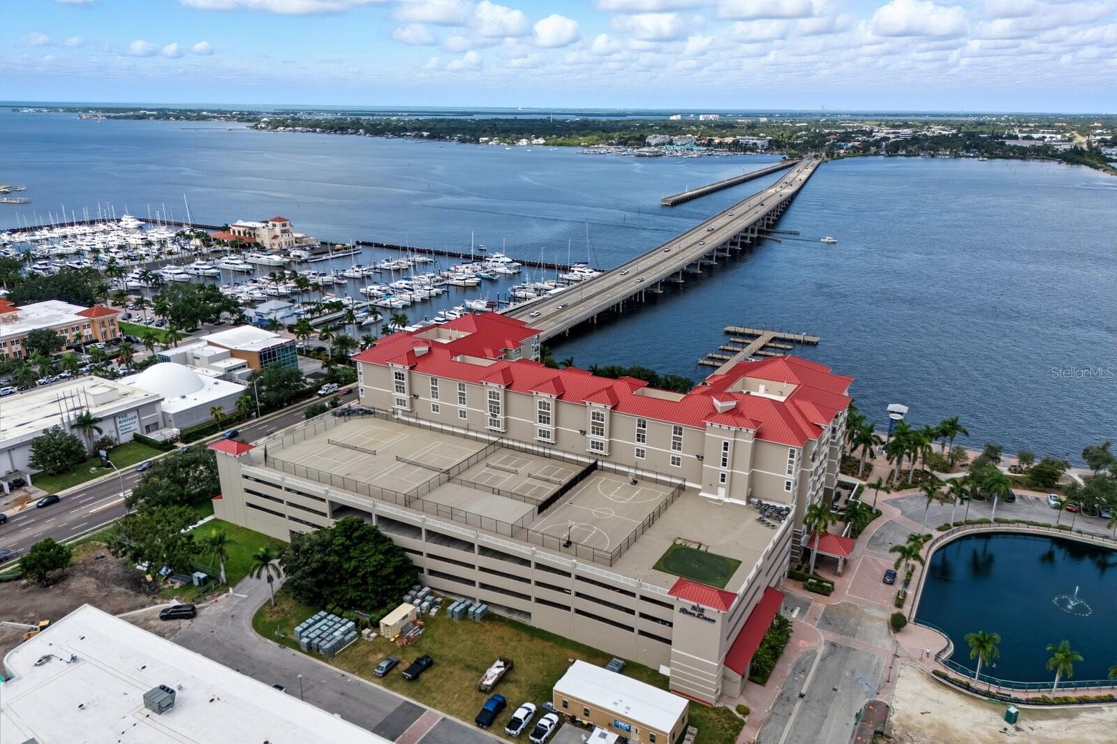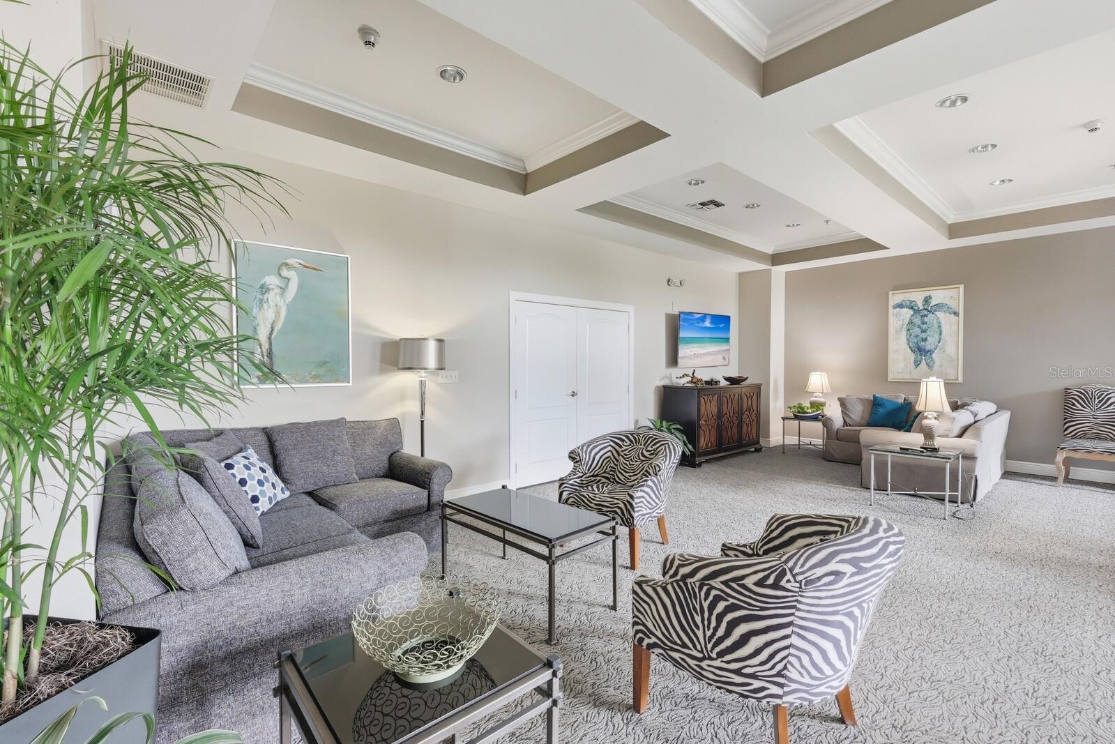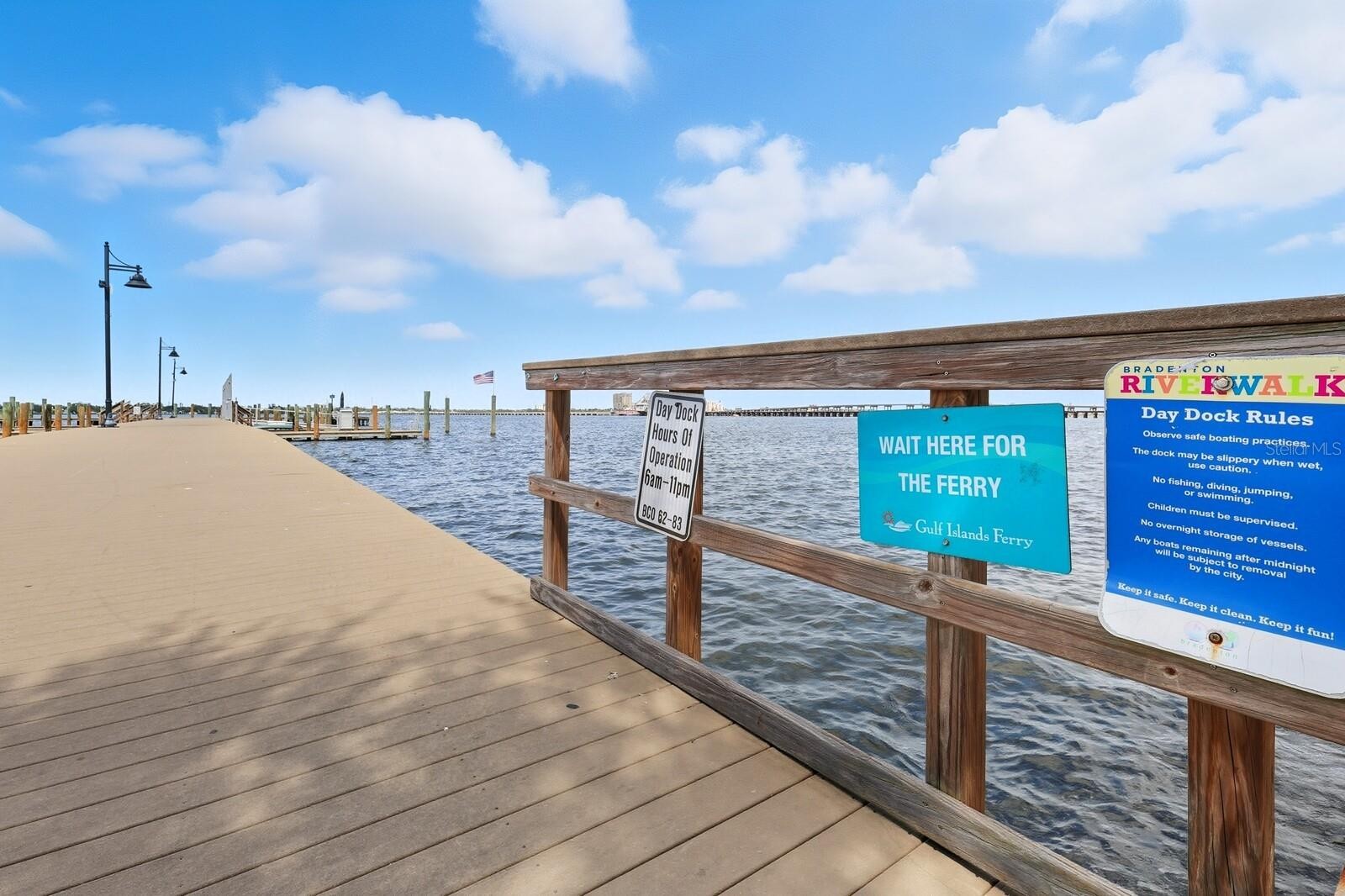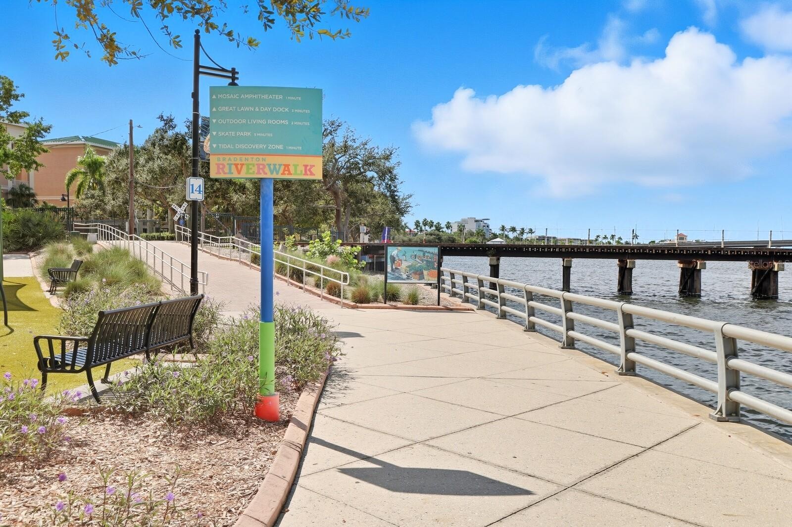 Discover refined living and an unbeatable location in this spacious, ground floor 2-bedroom, 1-bath condo located in the sought-after River Dance community, perfectly positioned along the scenic Bradenton Riverwalk overlooking the Manatee River. As an added bonus, the Gulf Island Ferry to Anna Maria Island departs right in front of the building, providing a scenic and car-free ride to the island’s beautiful beaches! This residence offers 1,236 square feet of thoughtfully designed living space, showcasing soaring ceilings, luxury vinyl plank flooring throughout, and designer light fixtures that enhance its modern, model-like appeal. The kitchen is both stylish and functional, featuring granite countertops, stainless steel appliances, a seating bar, and ample cabinetry. It flows seamlessly into the spacious great room, highlighted by a wall of windows, crown molding, plus a dedicated dining area ideal for gatherings. A screened lanai extends the living space outdoors, offering peaceful views of the lush garden and resort-style pool. The primary bedroom is generously sized with a walk-in closet and a second bedroom is thoughtfully located on the opposite side of the unit, providing privacy for guests or a quiet workspace. The bathroom is centrally located, complete with dual vanities, a walk-in shower, and soaking tub. Adding convenience, the residence includes in-unit laundry, making day-to-day living easy and efficient. River Dance is a resort-style, amenity-rich community designed for an active and social lifestyle. Residents enjoy access to a heated pool and spa with a grilling area, a fifth-floor outdoor deck with tennis and pickleball courts, a basketball court, and a putting green. Indoors, you'll find a fitness center, a movie theater with a serving bar, a community room with a full kitchen and pool table, as well as a business center and conference room. Two fully equipped guest suites are available for overnight visitors. This condo also includes two assigned spaces in the parking garage and a climate-controlled storage cage. Located just minutes from downtown Bradenton’s vibrant shops, restaurants, and cultural attractions including the Manatee Performing Arts Center, the location cannot be beat! Whether you're seeking a full-time residence, a seasonal retreat, or a low-maintenance investment, this exceptional condo offers the perfect combination of luxury, location, and lifestyle.