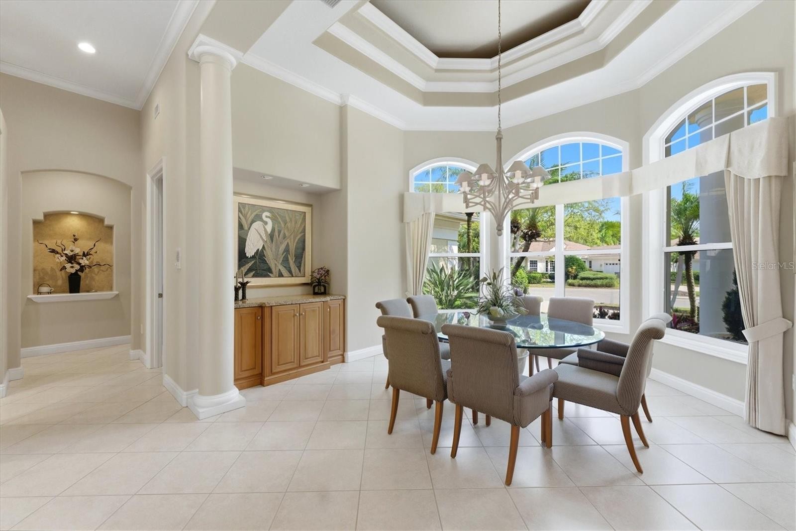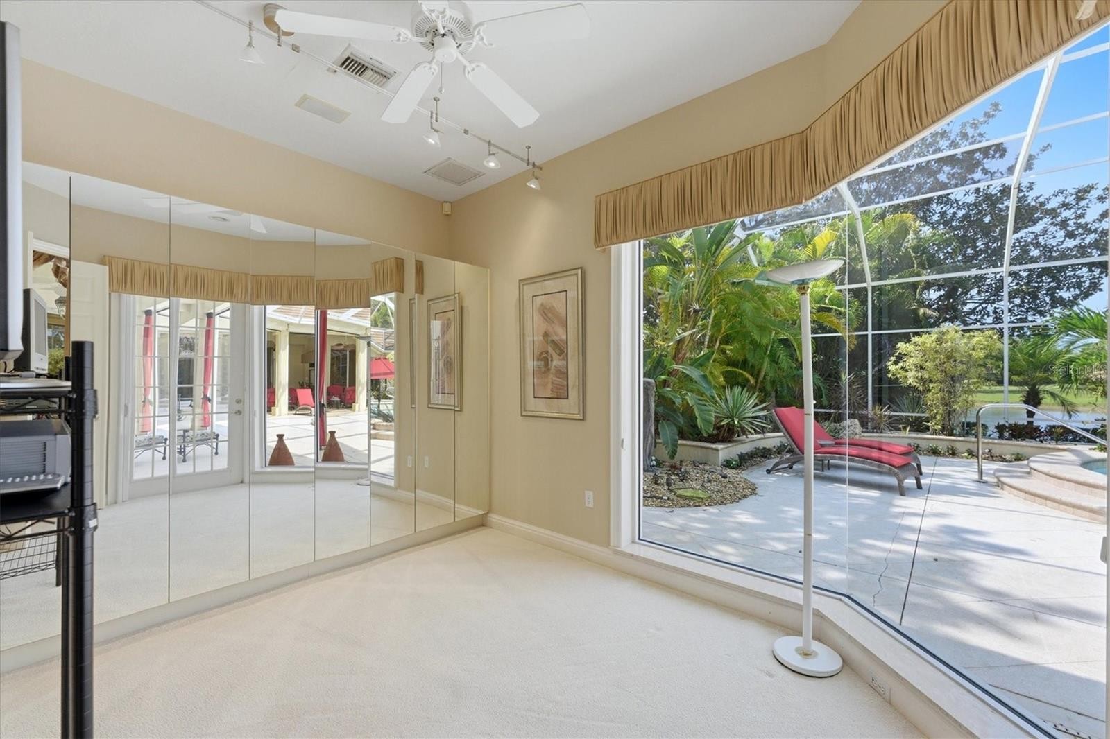 Located in the award-winning University Park Country Club, this exceptional custom-built Najjar estate offers the epitome of elegant living with 3 bedrooms, 4.5 baths, two offices, and an oversized 3-car garage, all positioned to capture spectacular lake views. A pavered circular driveway, along with a separate driveway to the garage, create an impressive arrival. The grand entry features double wood doors with leaded glass sidelights and a dramatic arched transom, opening to spacious living and dining areas with custom built-ins, architectural details, gas fireplace, crown molding, stepped tray ceiling and a fully retractable quad sliding glass door opening seamlessly to the lanai. A well-appointed butler’s pantry with refrigerator, wine fridge, sink, and abundant cabinetry provides additional convenience for entertaining. The eat-in kitchen and family room form the heart of the home and feature custom wood cabinetry, center island, raised breakfast bar and a walk-in pantry, while an aquarium window overlooks the lanai. Fully retractable quad and double corner sliding doors create effortless spacious indoor-outdoor living. The primary suite offers a private retreat with a luxurious bath featuring a soaking bubble tub by a private window with statue and water feature, two vanities, and a walk-in shower with bench. The spacious walk-in closet includes extensive built-ins and a concealed safe. An adjoining bonus room with mirrored closets and floor-to-ceiling windows overlooking the pool offers flexibility for a fitness room, lounge or dressing room. Nearby, a private office with built-ins and large windows provides an ideal workspace. The guest wing includes two generous guest bedrooms with new carpet and ensuite baths. A second office with two walls of built-ins and large windows with tropical lake views offers additional flexibility. A full bath with direct pool access and a separate half bath add convenience. The outdoor living area is the true highlight, featuring a spacious lanai with two covered seating areas and a large outdoor kitchen with grill, full-size refrigerator/freezer, sink, granite counters, raised breakfast bar, and ceiling fan. The adjacent covered loggia provides seating, shades, ceiling fan, and fire table. The infinity-edge pool includes continuous seating, an in-water bar table with umbrella, and an attached spa with fountain, while an outdoor shower surrounded by tropical plantings and sculptures enhances the resort-style setting. Additional features include hurricane protection for all windows and most of the lanai, whole-house gas generator, three HVAC units, new pool pump, landscape lighting, irrigation system, lightning rods, solar attic fans with radiant barrier, Culligan water system, recessed, accent and uplighting throughout, central vacuum, alarm system, and a large air-conditioned storage room in the epoxy-coated garage. With exceptional craftsmanship, remarkable outdoor living spaces, and serene lake views, this extraordinary estate must be experienced in person to truly appreciate all it offers. University Park Country Club is consistently ranked one of the top courses in Florida featuring 27 holes of championship golf, tennis and pickleball, fitness center, croquet and an array of social and group activities. Enjoy the restaurant with the required minimum of a Social membership. Convenient to I-75, downtown Sarasota, surrounding beaches, and University Town Center.