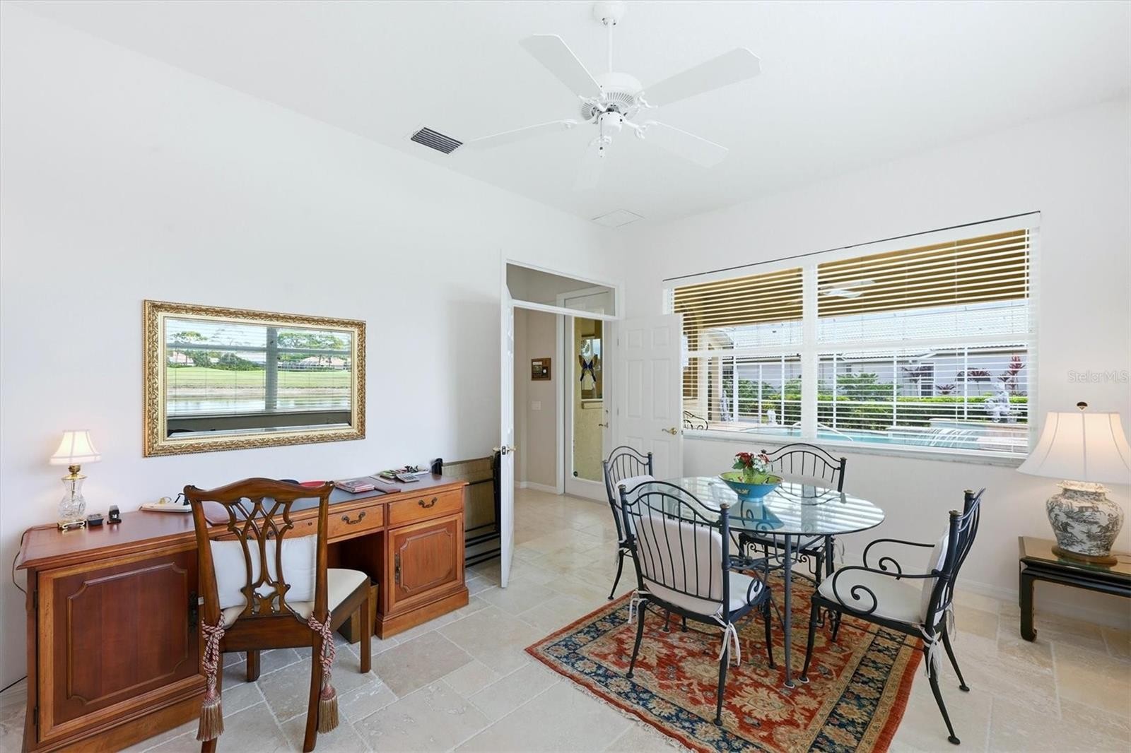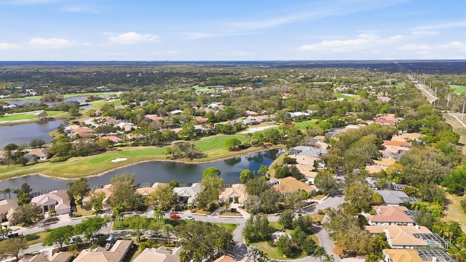 Commanding one of the most remarkable lake and golf course vistas in University Park Country Club, this exceptional Anchor-built residence occupies a prized homesite overlooking the second hole of the championship course. The setting delivers a rare blend of water, fairway, and mature landscaping views, creating a peaceful and visually striking backdrop within one of Sarasota’s most sought-after gated communities. Offering over 3,200 square feet of thoughtfully designed living space, this home features three bedrooms, three bathrooms, and an expansive library that can easily function as a fourth bedroom or private office. Elegant architectural details and quality craftsmanship are evident throughout. Refined travertine flooring flows through the primary living spaces, complemented by generous ceiling heights with tray detailing, custom built-ins, and a thoughtfully designed layout ideal for both everyday living and entertaining. The kitchen is well-appointed with generous cabinetry, ample counter space, a center island, and breakfast bar seating, creating a welcoming heart of the home. The primary suite is a peaceful retreat with French doors leading to the lanai, two oversized walk-in closets featuring California Closet systems, dual vanities, a soaking tub, and a glass-enclosed walk-in shower. Two guest bedrooms are located on the opposite side of the home to provide comfort and privacy for family and visitors. The large library or study offers a quiet workspace with picturesque lake and golf course views. Outdoor living is equally impressive, with a paver lanai and pool area designed to maximize the panoramic scenery. The pool equipment was updated in 2025, and the home also features a whole-house water filtration system. Additional updates include a newer roof (2016), HVAC system (2020), and water heater (2020). The home is currently outfitted for electric appliances, with gas service available if preferred. A spacious two-car garage plus a dedicated golf cart garage provides substantial storage and convenience for enjoying the country club lifestyle. University Park Country Club is a resident-owned community recognized for its beautifully maintained grounds, mature landscaping, and exceptional amenities. Residents enjoy 27 holes of championship golf, lighted Har-Tru tennis courts, pickleball, a fitness center, croquet lawns, and a vibrant social calendar centered around the clubhouse and restaurant. Ideally located just minutes from downtown Sarasota, the University Town Center shopping district, Sarasota-Bradenton International Airport, and world-renowned Gulf Coast beaches, University Park offers both tranquility and convenience. Nearby cultural attractions include The Ringling Museum, Nathan Benderson Park, and St. Armands Circle, providing endless opportunities for recreation, dining, and entertainment. An exceptional setting best experienced in person - schedule your private showing today to discover the breathtaking lake and golf course views within one of Sarasota’s most celebrated communities.