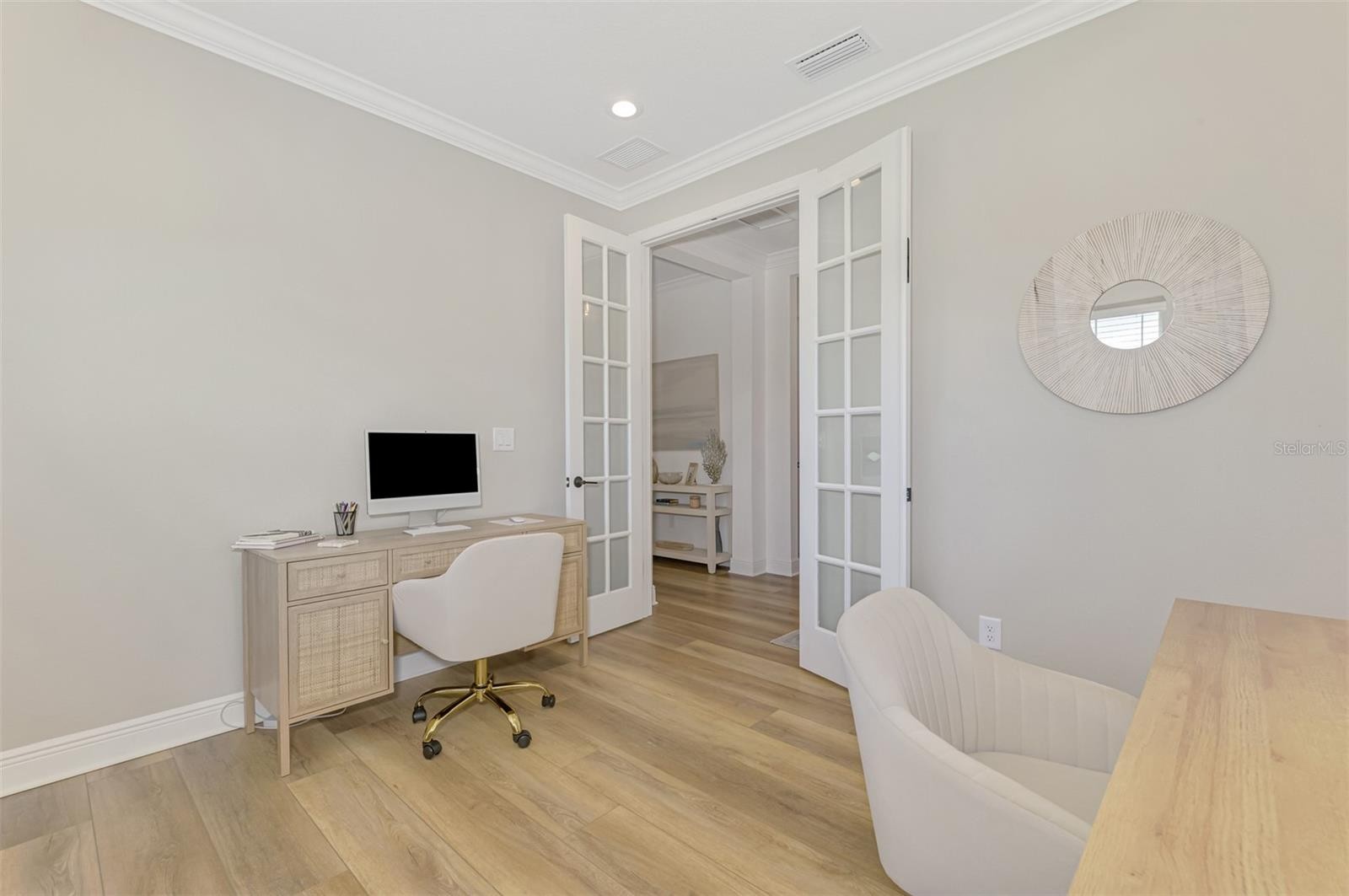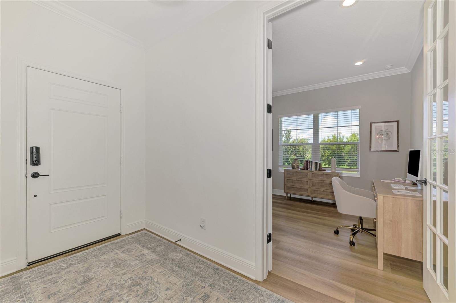 Welcome to your dream home in the prestigious Windward community! This stunning 2-bedroom, 2-bath residence offers a perfect blend of elegance, functionality, and outdoor living. The open floorplan seamlessly flows from the upgraded kitchen—featuring beautiful cabinets with under-cabinet lighting, a central vacuum system with crumb catcher, and upgraded lighting and fans throughout—to the spacious great room with a coffered ceiling and crown molding, creating an inviting atmosphere for entertaining and everyday living. The versatile office/flex space with elegant glass French doors provides the ideal setting for work or hobbies. Beautiful Luxury Vinyl Plank flooring enhances the home's modern look while providing durability and easy maintenance. Impact-resistant glass throughout ensures peace of mind, while high-end finishes and custom interior paint colors add a touch of sophistication. Enjoy outdoor living on your extended lanai, which offers extra space to relax while taking in tranquil water views and bird watching in the lush green surroundings. The lanai is plumbed for a future outdoor kitchen, perfect for entertaining guests. Additional features include a utility sink in the garage, a gas line for future outdoor cooking, and a built-in air purifier for enhanced air quality. This home is situated on a premium lot with extra green space, providing privacy and serenity. The Guardian smart home security system offers peace of mind and modern convenience. Inside, 8' interior doors and upgraded lighting create a bright, airy ambiance. Living in Windward means access to resort-style amenities, including two stunning pools, sports courts, fields, pickleball and tennis courts, miles of scenic trails, playgrounds, dog parks, a full-time activities director, and a state-of-the-art fitness center. Located with direct access to Waterside, this community offers a luxurious lifestyle just minutes from Sarasota’s renowned coastal beaches, vibrant culture, diverse dining options, and championship golf courses. Don’t miss the opportunity to make this exceptional home yours—schedule your private tour today! This home comes with a GOLF CART!!!!!!
