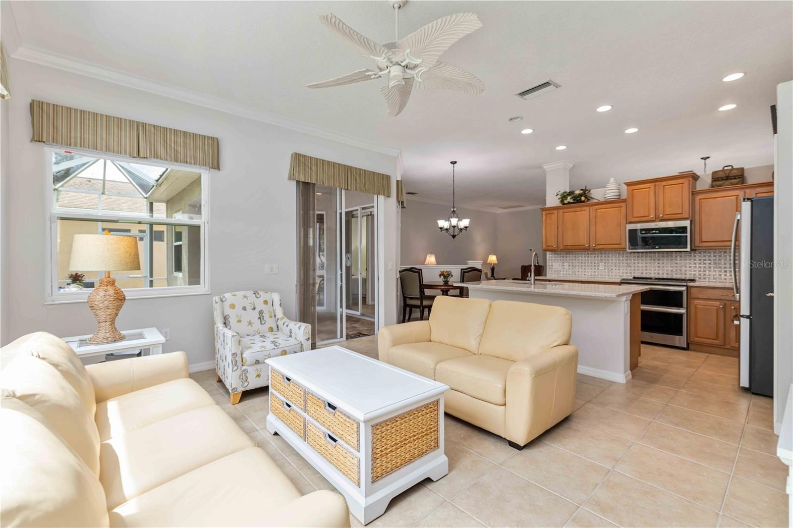 This beautifully maintained single-story home, built by Bruce Williams, offers 3 bedrooms, 2 bathrooms, and approximately 1,900 square feet of living space. Enjoy a desirable southern rear exposure with an abundance of updated windows that fill the home with natural light while showcasing peaceful preserve views with no homes behind you. The property features a paver driveway and a screened, caged lanai—perfect for relaxing or entertaining in a private outdoor setting. Major updates include a new roof (2022), air conditioning system (2018), and impact windows (2021), providing both comfort and peace of mind. Inside, the home boasts solid surface flooring throughout, with ceramic tile in the main living areas and engineered hardwood flooring in the bedrooms. Fresh, neutral paint enhances the main living and kitchen spaces, creating a bright and inviting atmosphere. The kitchen is well-appointed with wood cabinetry featuring convenient rollout drawers, an updated stainless steel appliance package, quartz countertops, and a large center island ideal for gathering. Crown molding adds an elegant touch throughout the main living areas, while the thoughtfully designed split floor plan offers privacy, with guest bedrooms and bath on one side and a spacious primary suite with walk-in closet on the other. Located in the highly desirable gated community of University Place, residents enjoy an array of resort-style amenities including two neighborhood pools, a relaxing spa, a fully equipped fitness center, scenic walking trails, and outdoor summer kitchens perfect for gatherings with friends and neighbors. The location is truly exceptional, offering convenient access to Sarasota, its beautiful Gulf beaches, Siesta Key, Longboat Key, Lido Key and Anna Marie Island, Bradenton, and vibrant downtown St. Petersburg. You’ll also appreciate being just minutes from Sarasota-Bradenton International Airport and an abundance of premier shopping and dining at The Mall at University Town Center.